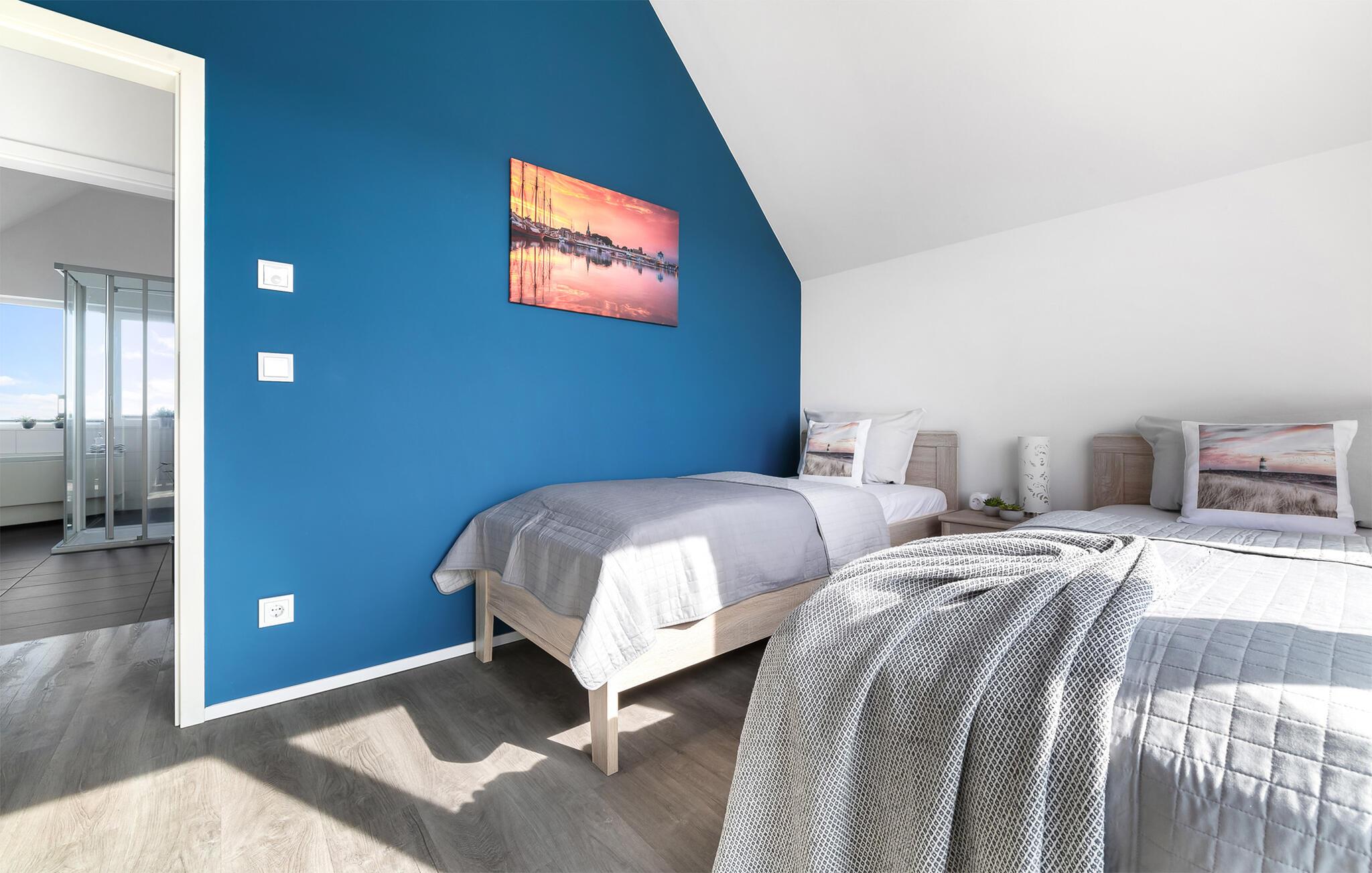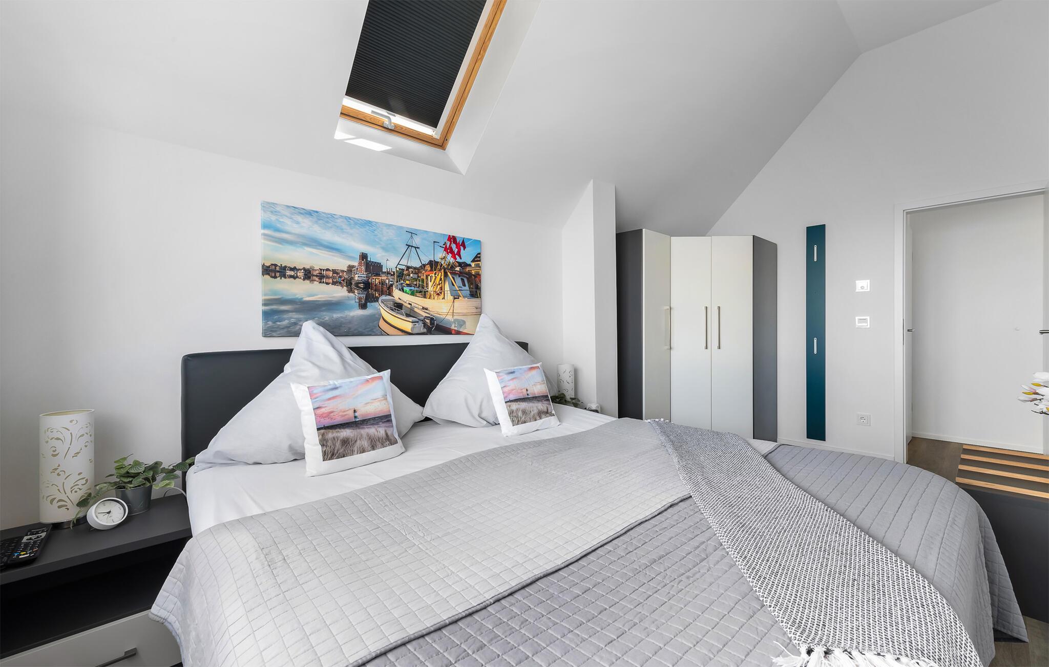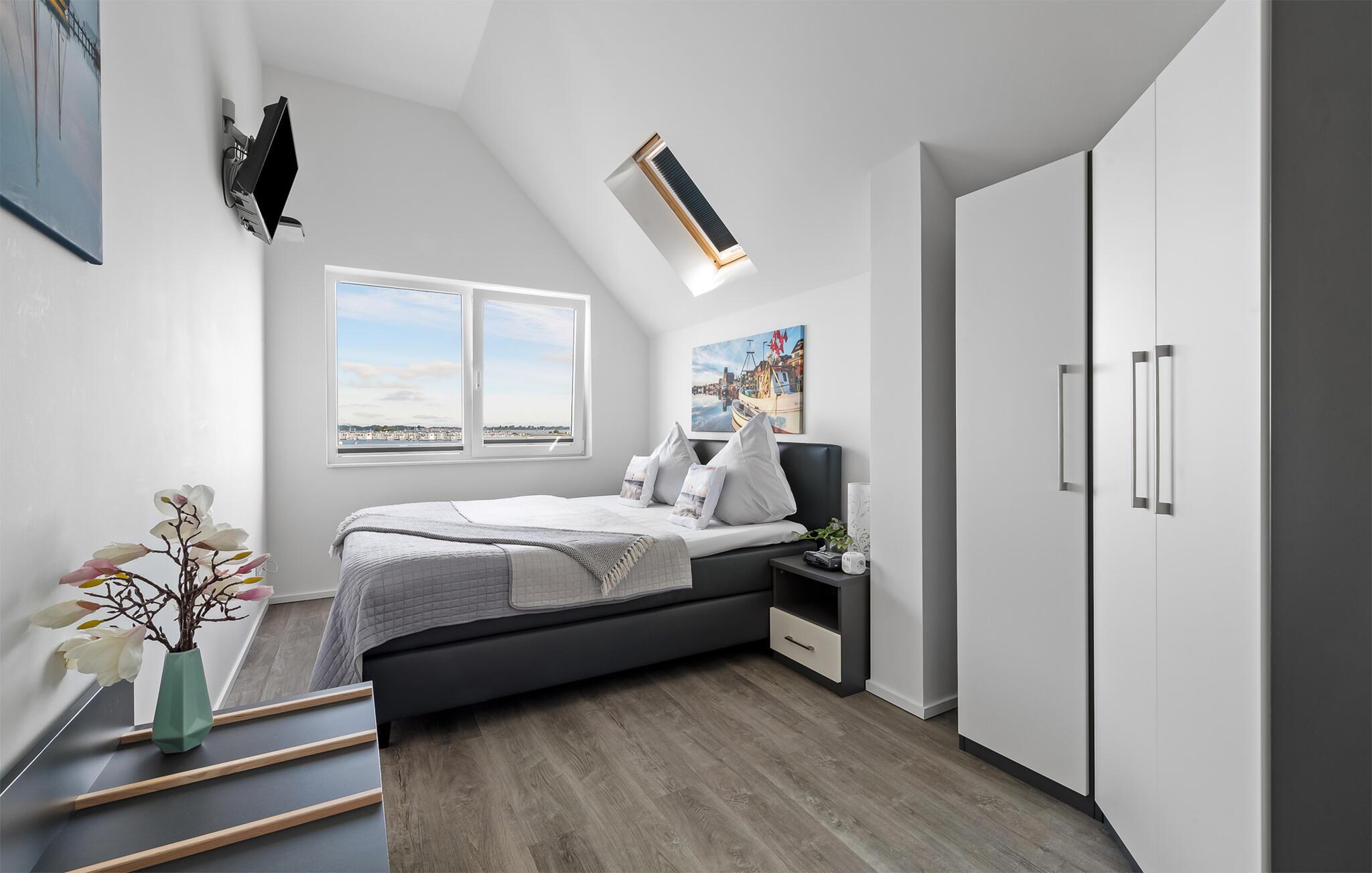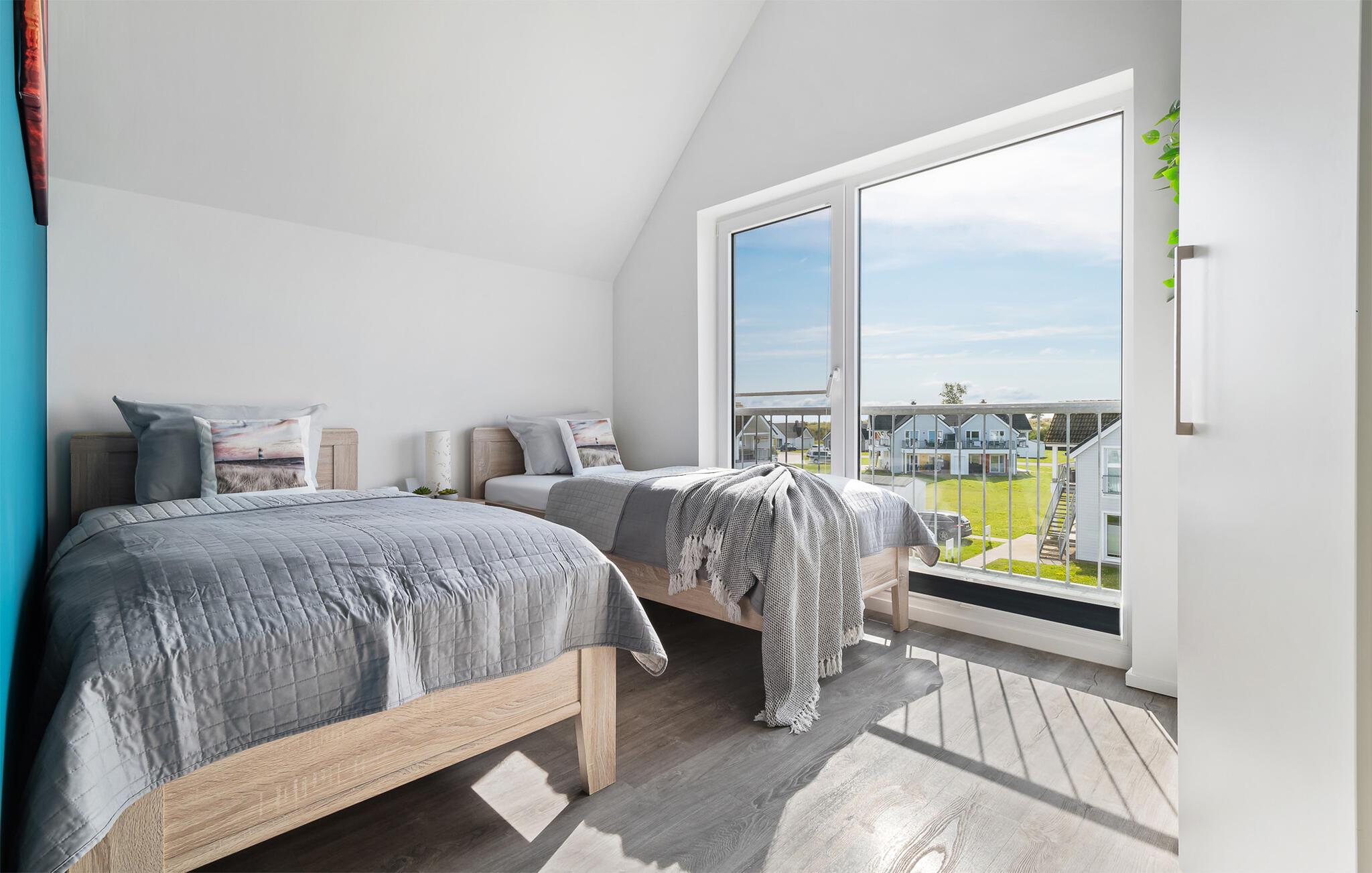 Der Ruhebereich auf der zweiten Ebene bietet ein Hauptschlafzimmer mit einem traumhaften Wasserblick und einem Doppelbett, sowie ein zweites Schlafzimmer mit flexiblen Einzelbetten. Eine komfortable Schlafcouch im Wohnbereich bietet zusätzlichen Schlafplatz.