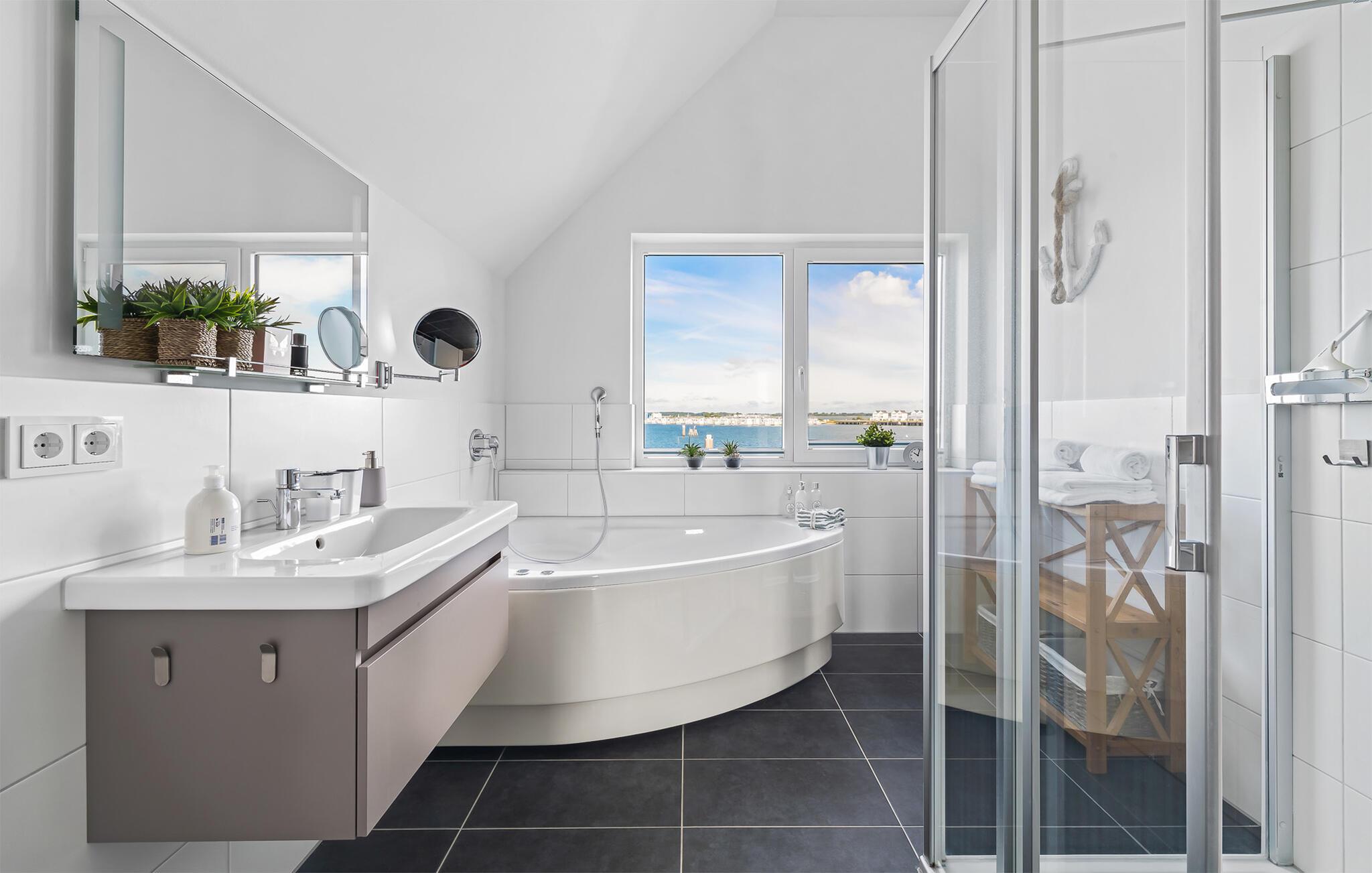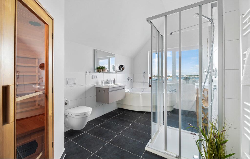Entspannt im voll ausgestatteten Badezimmer mit Infrarot-Wärmekabine für zwei Personen, Hifi-Sound-System und LED-Farblichttherapie sowie einer großen Eck-Whirlwanne mit Wasserblick. Zusätzlichen Komfort bietet eine Dusche im ersten Obergeschoss.