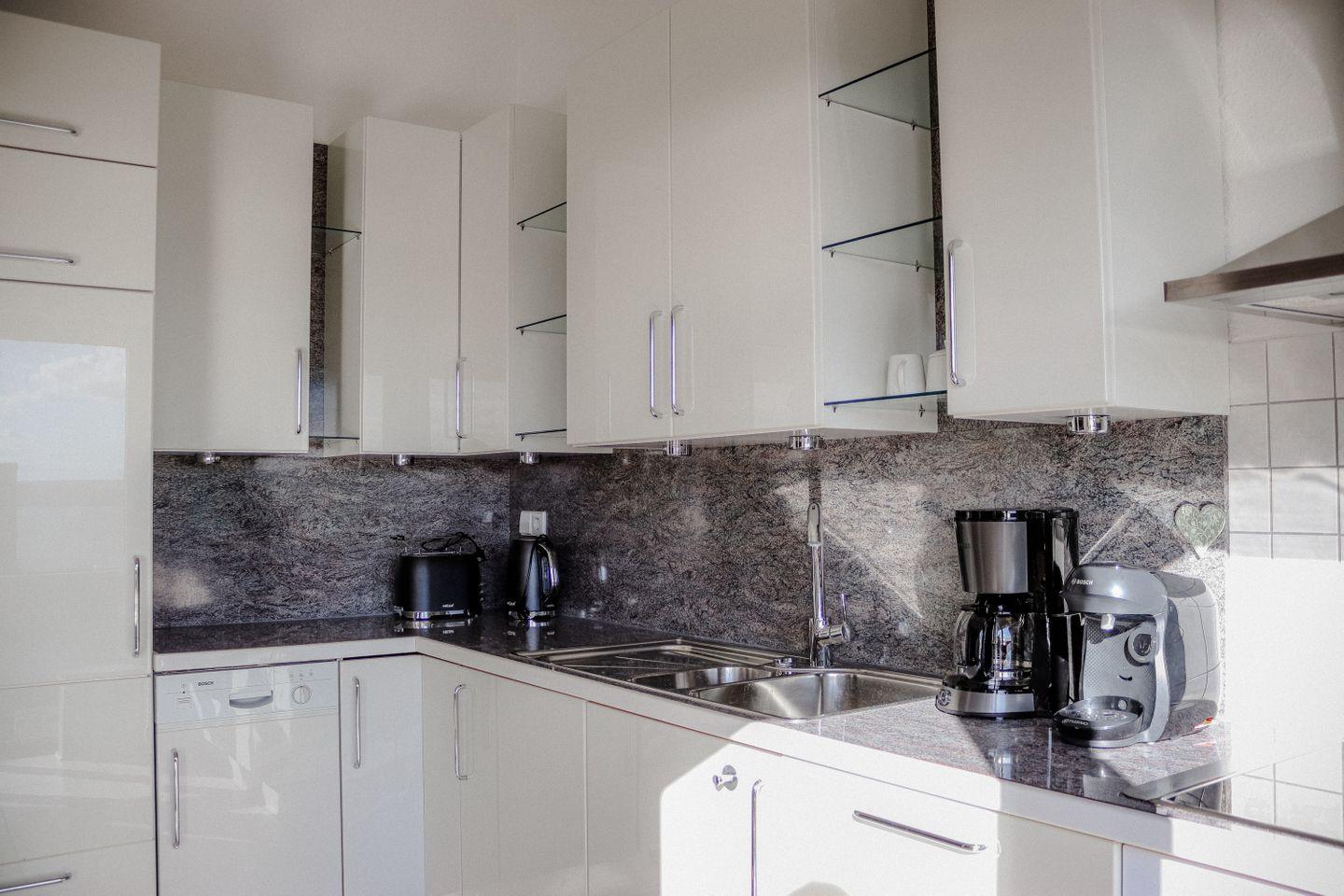 Die 64 m² große Wohnung bietet Platz für bis zu vier Personen und eine moderne, stilvolle Einrichtung mit Liebe zum Detail. Das großzügige Schlafzimmer ist mit einem komfortablen Boxspringbett und einem geräumigen Schrank ausgestattet. Im kombinierten Wohn-/Essbereich mit offener Küche befindet sich ein hochwertiges Lederschlafsofa, das zwei weiteren Personen Platz bietet. Das Badezimmer verfügt über eine Badewanne, einen Waschtisch, eine Toilette und eine Waschmaschine.