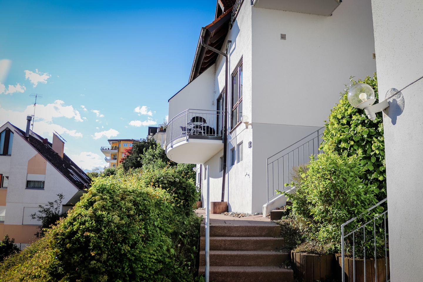 Zur Wohnung gelangen Sie über die Außentreppen: von der Bergstraße etwa 37 Stufen oder von der Garage aus 85 Stufen. Die Wohnung befindet sich hinter der zweiten Tür rechts. Ein Duplex-Parkplatz (oben, Nummer 69) gehört zur Wohnung. Bitte beachten Sie die Maße (siehe Bilder). Die Garage ist über den Waldweg (Hausnummer 27a) erreichbar. Direkt an der Garage befinden sich der Müllraum (rechts) und ein Fahrradkeller (links).