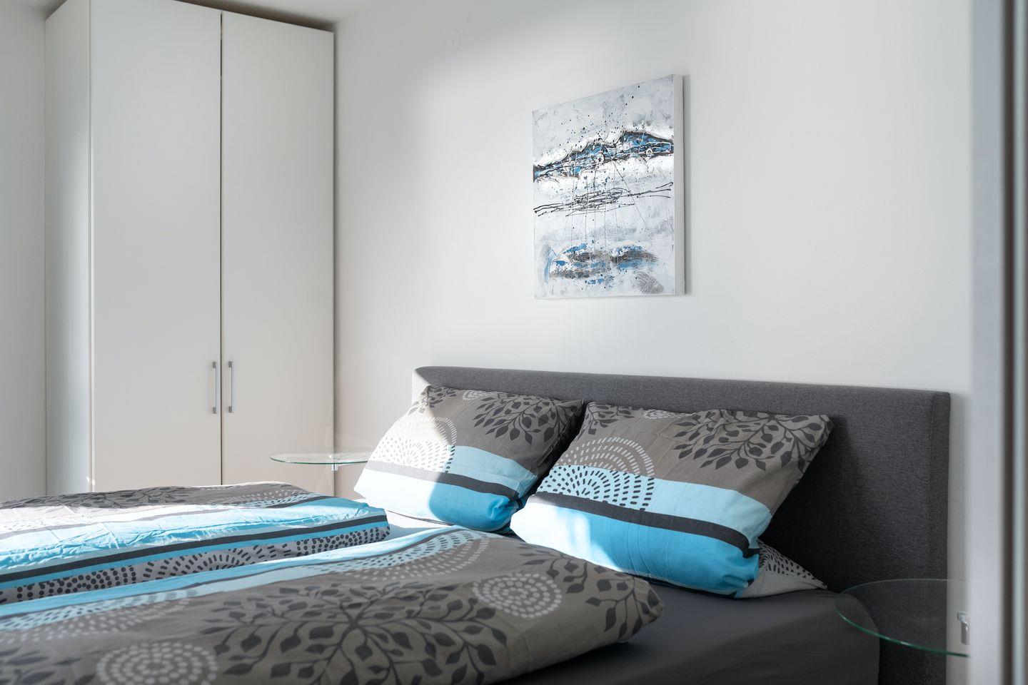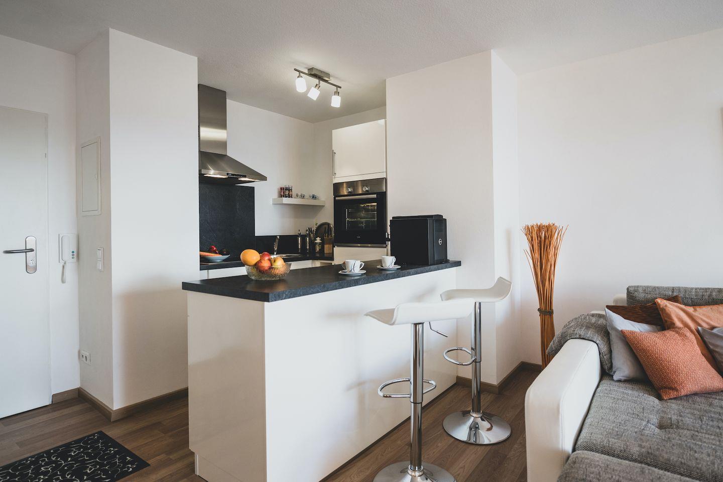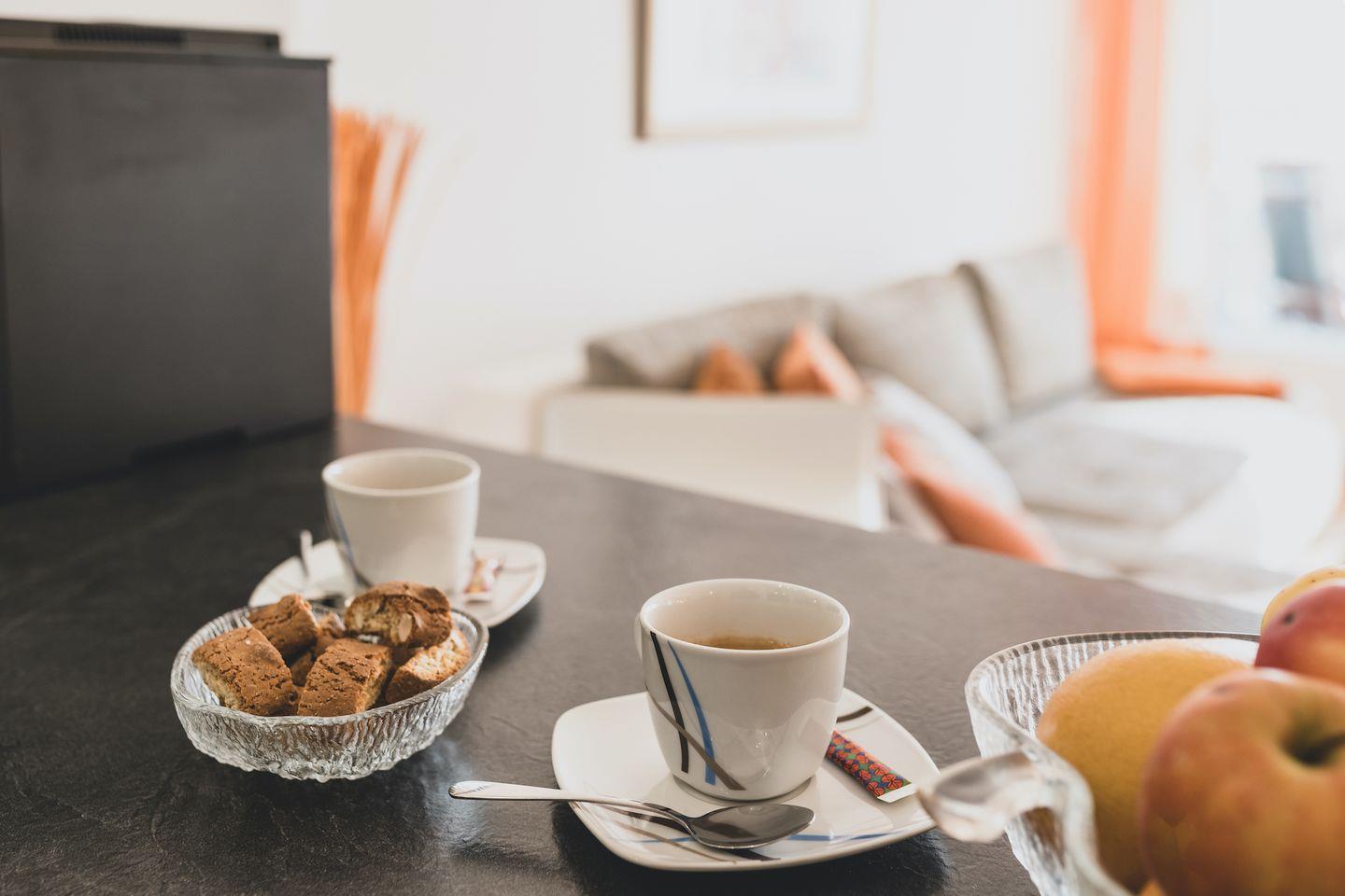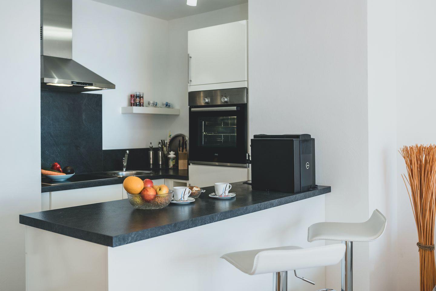 Die Ferienwohnung verfügt über ein Schlafzimmer mit einem komfortablen Boxspringbett und großem Kleiderschrank, von dem aus Sie den malerischen Ausblick auf den Bodensee genießen können. Neben dem geräumigen Schlafzimmer bietet das komfortable Sofa im Wohnbereich eine weitere Schlafgelegenheit für ein Kind. Der offene Wohnbereich lädt zum Verweilen ein und bietet eine voll ausgestattete Küche mit modernem Design sowie einen gemütlichen Essplatz für bis zu vier Personen. Genießen Sie Ihren morgendlichen Kaffee oder Espresso mit dem hochwertigen Jura-Kaffeevollautomaten.