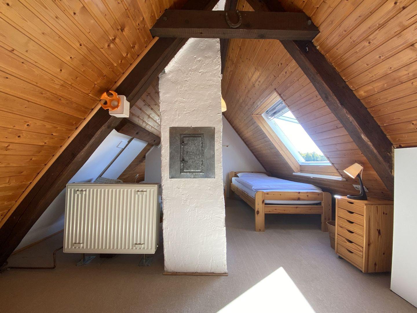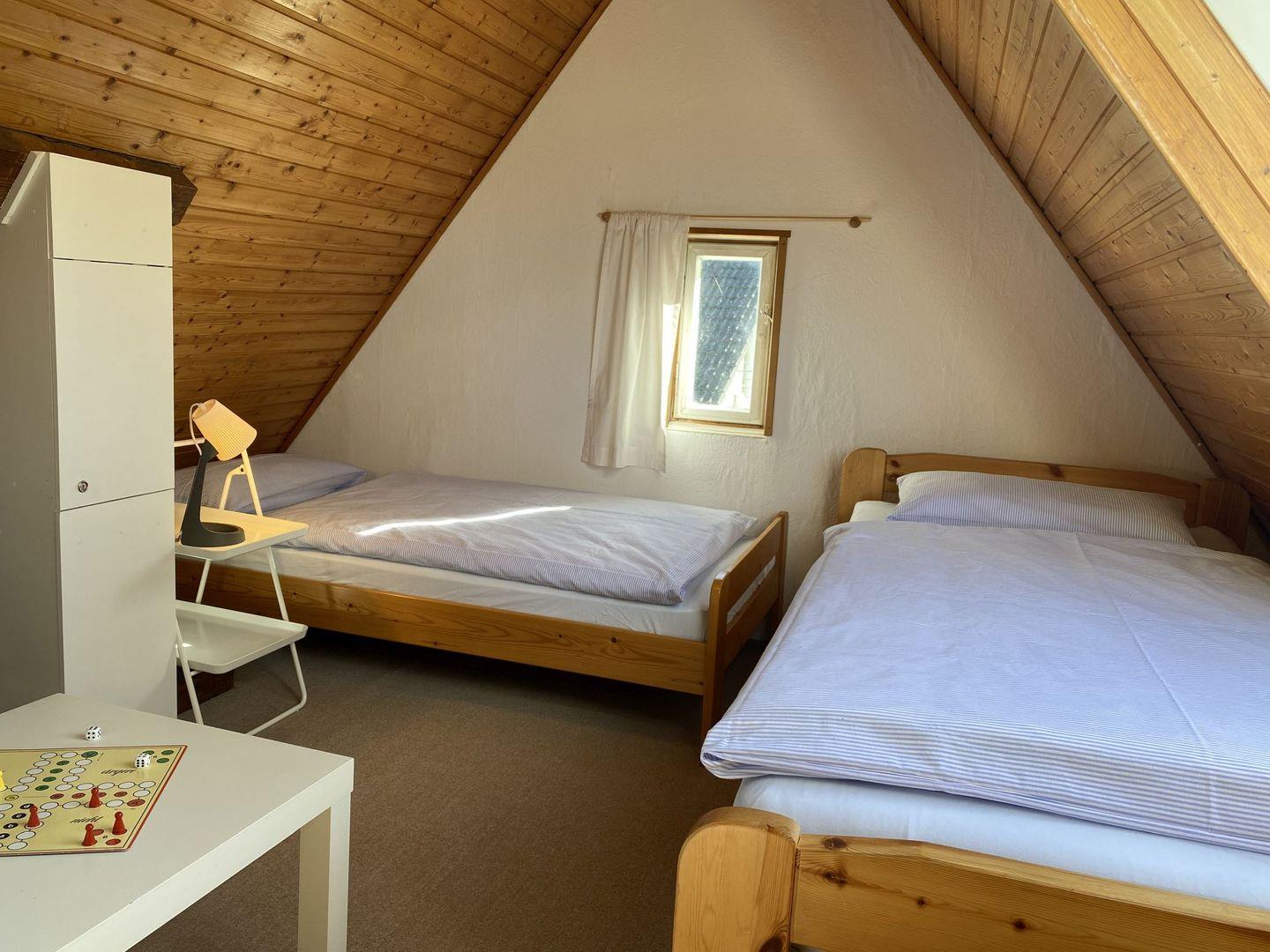 Kinder ab 6 Jahre freuen sich über das Dachgeschoss als Schlafplatz und Rückzugsort (mit zwei Einzelbetten, ACHTUNG steile Treppe).