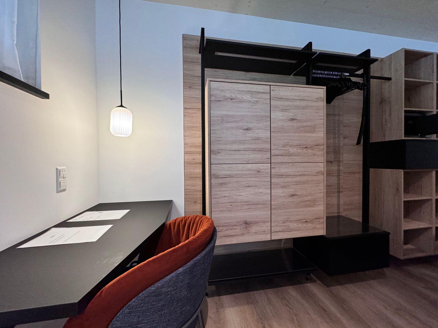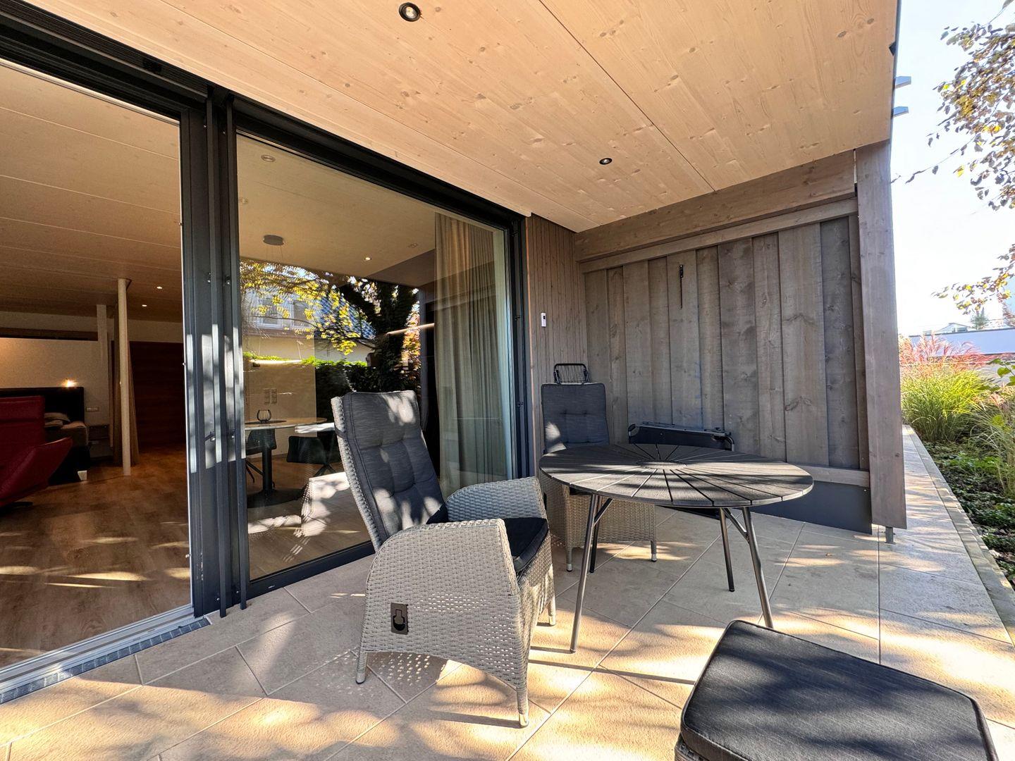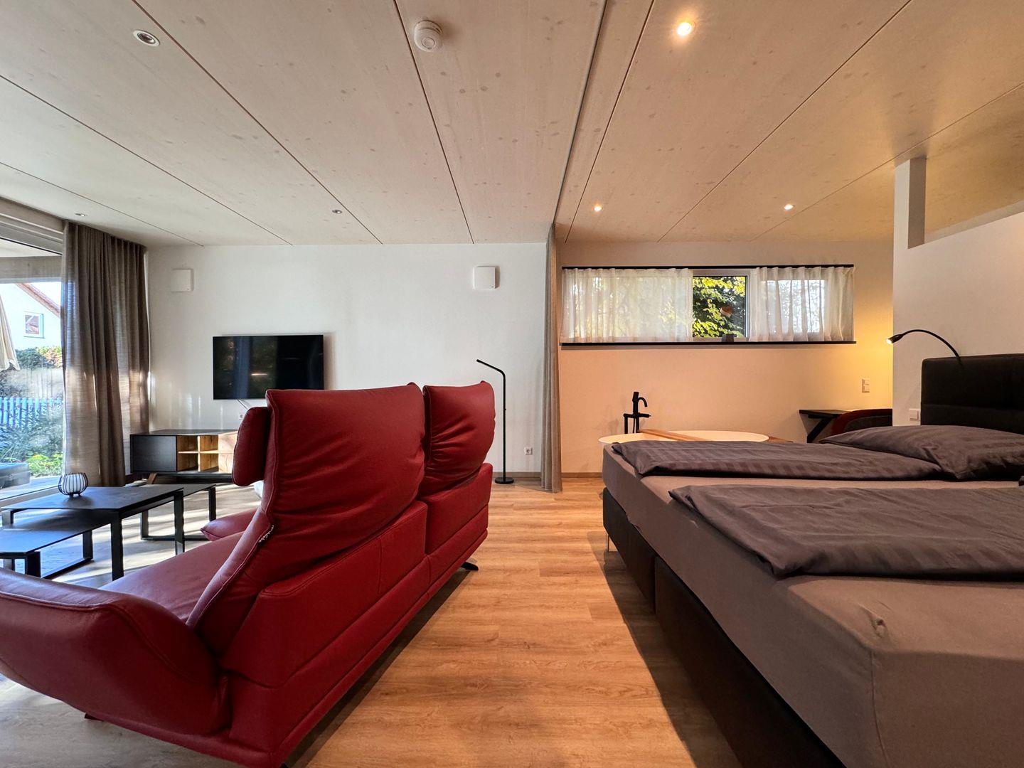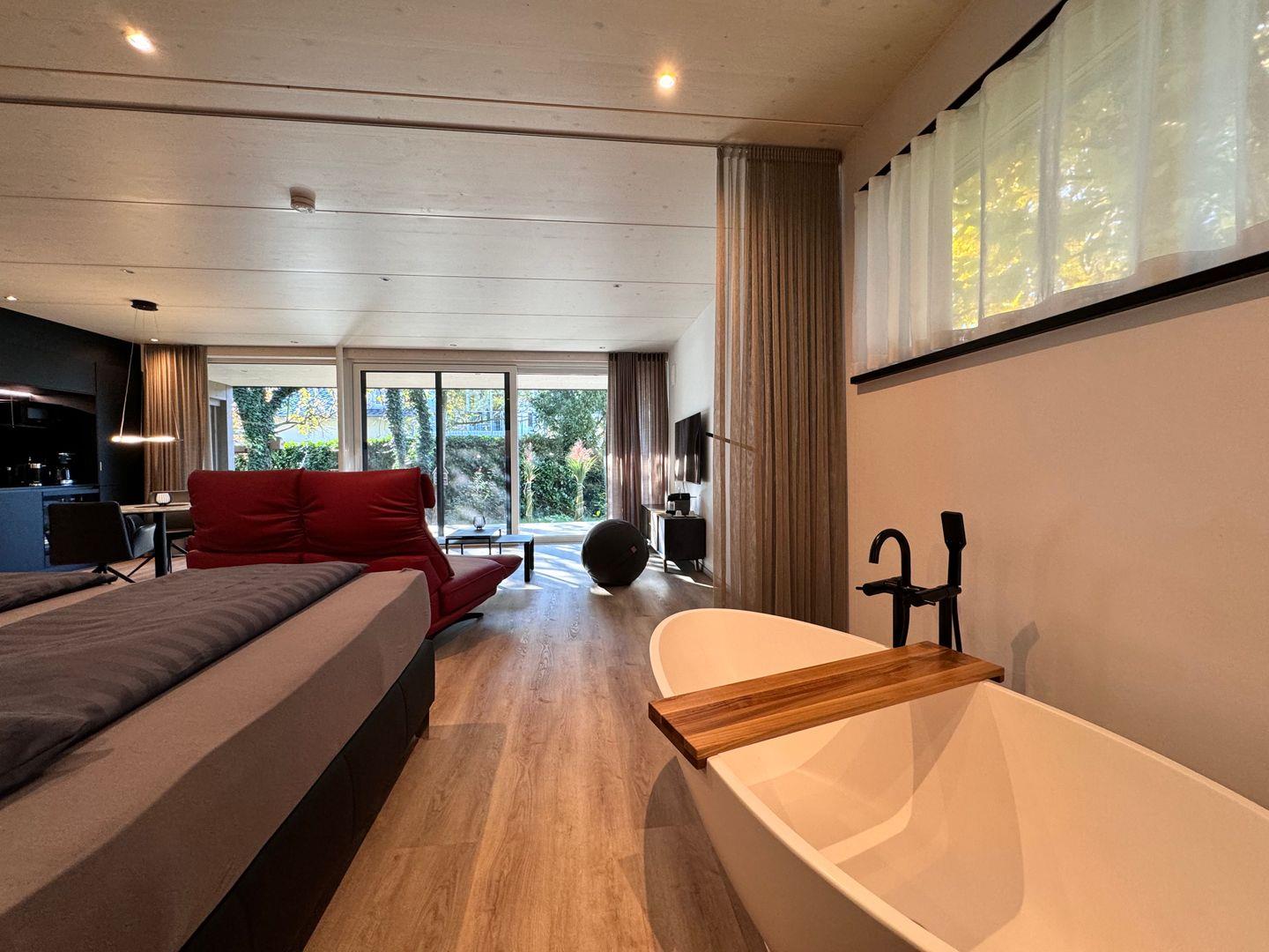 Das offene 1-Zimmer-Appartement überzeugt durch geradliniges schlichtes Design sowie ausgesuchte Möbel und Textilien. Die Ausstattung lässt keine Wünsche offen.