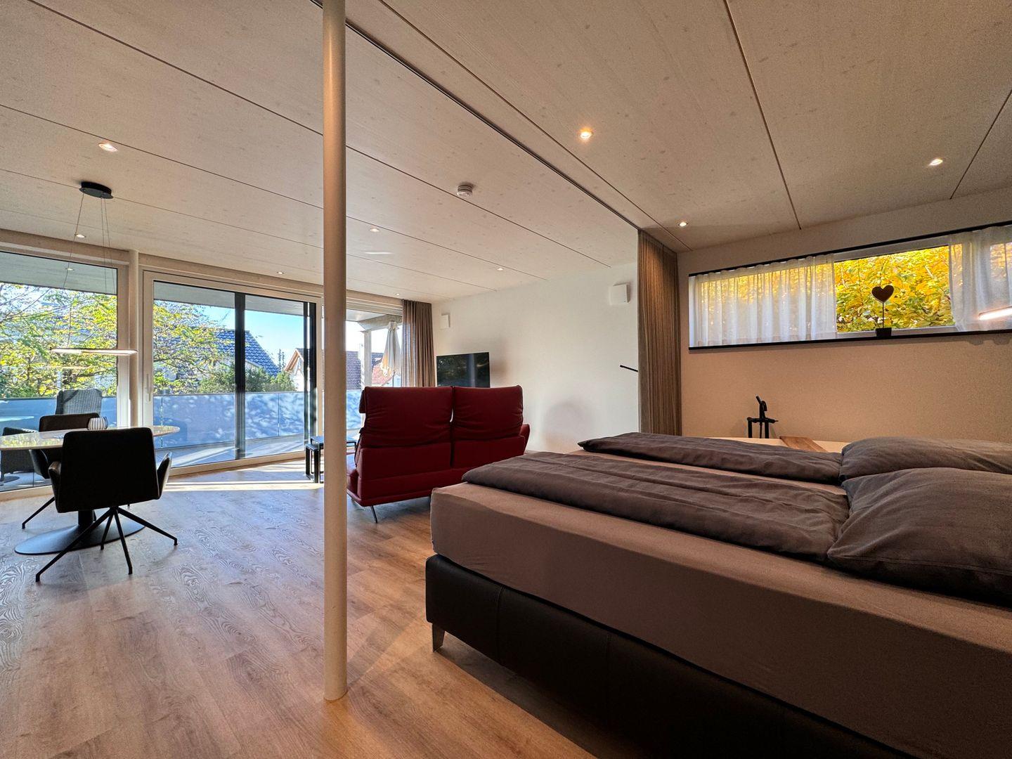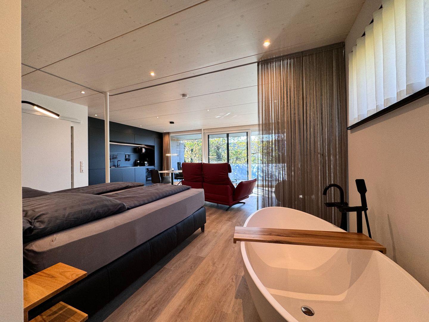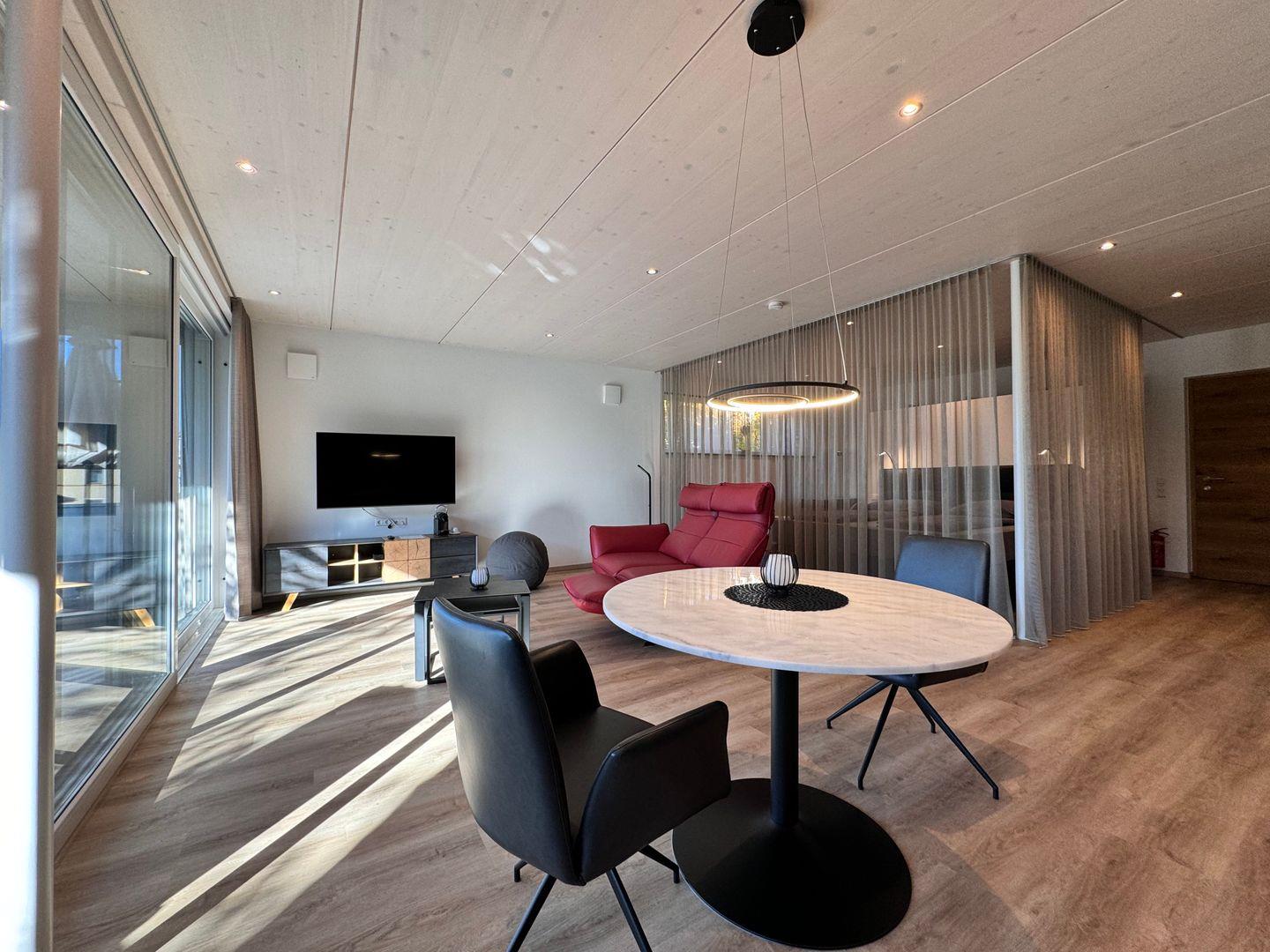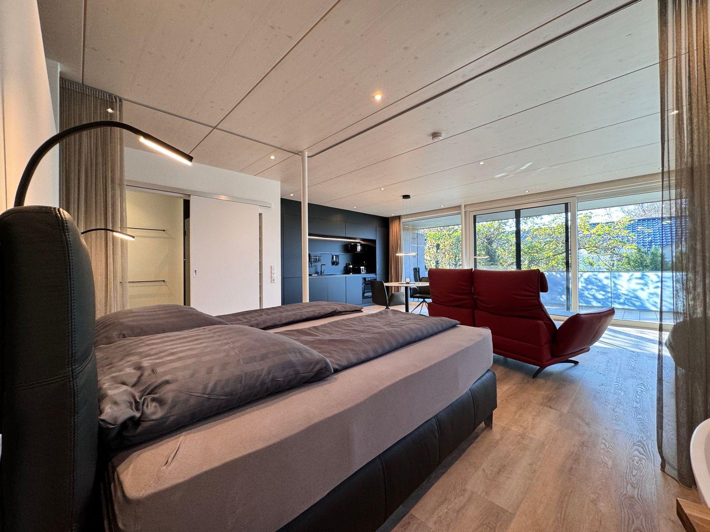 Das offene 1-Zimmer-Appartement überzeugt durch geradliniges schlichtes Design sowie ausgesuchte Möbel und Textilien. Die Ausstattung lässt keine Wünsche offen.
