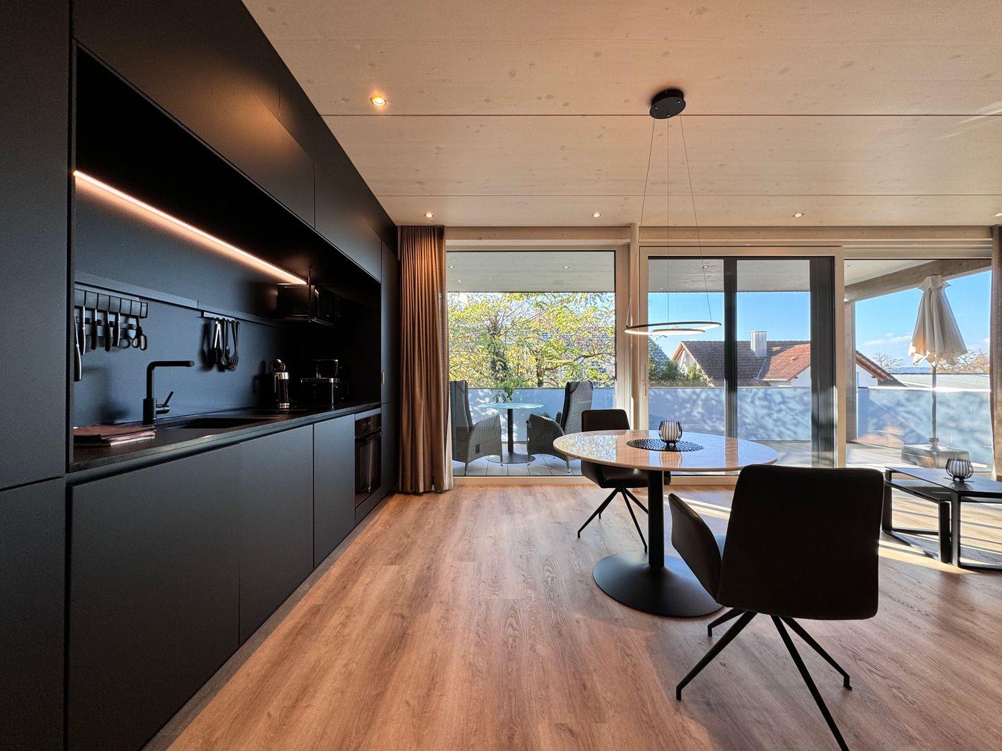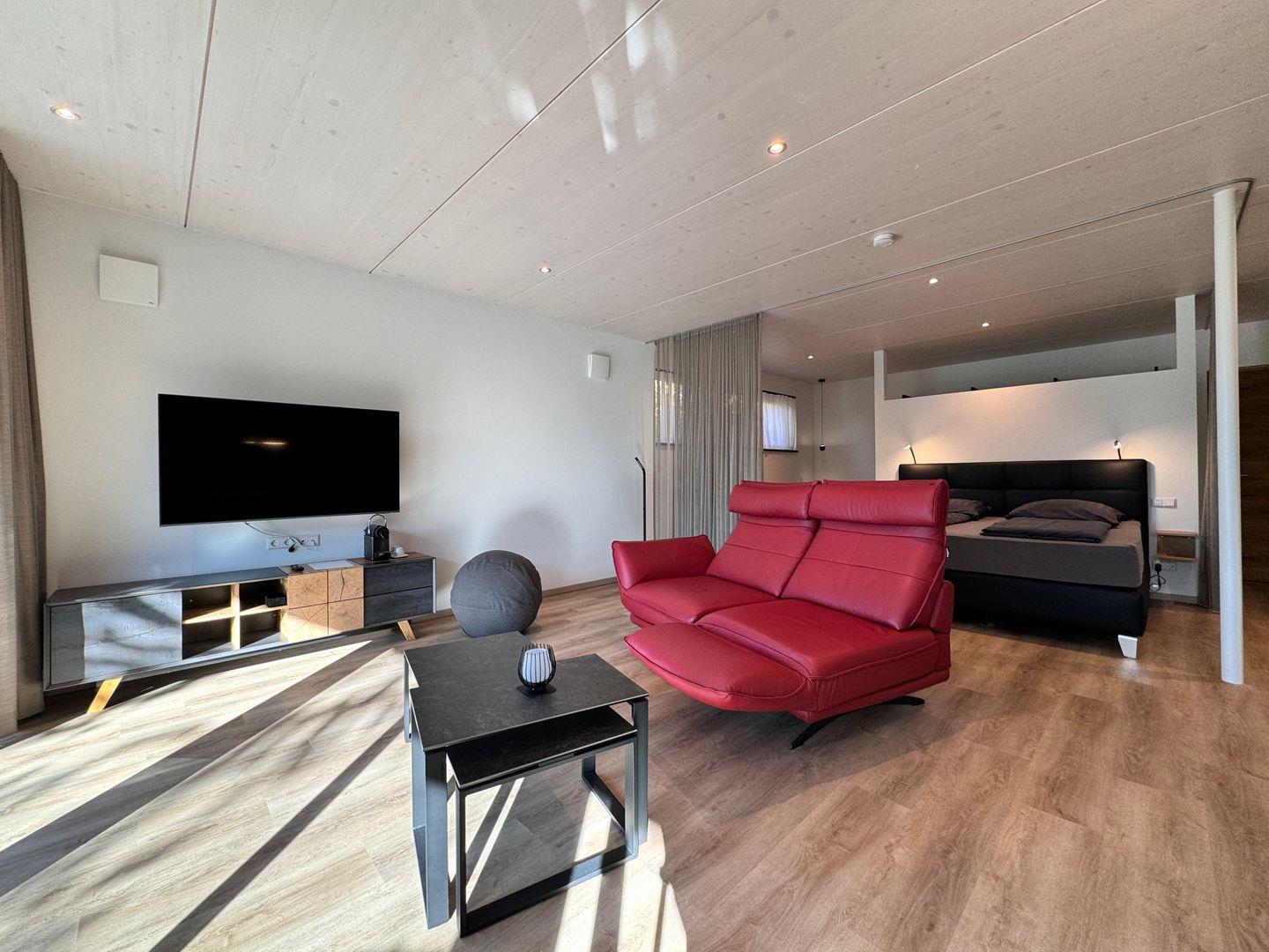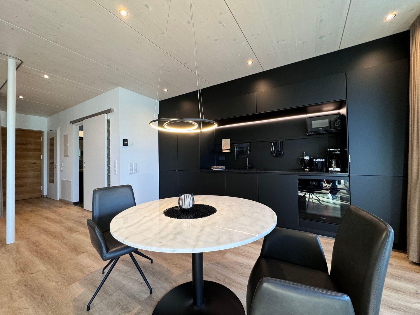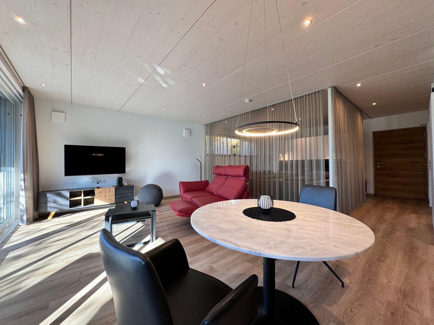Das offene 1-Zimmer-Appartement überzeugt durch geradliniges schlichtes Design sowie ausgesuchte Möbel und Textilien. Die Ausstattung lässt keine Wünsche offen.