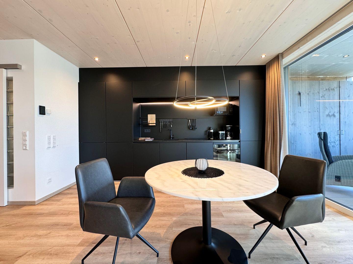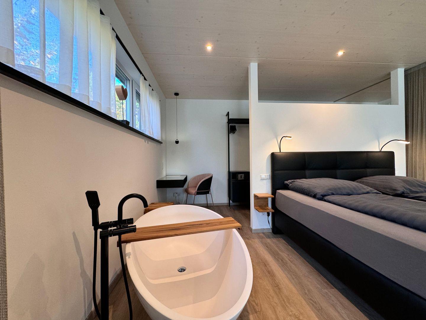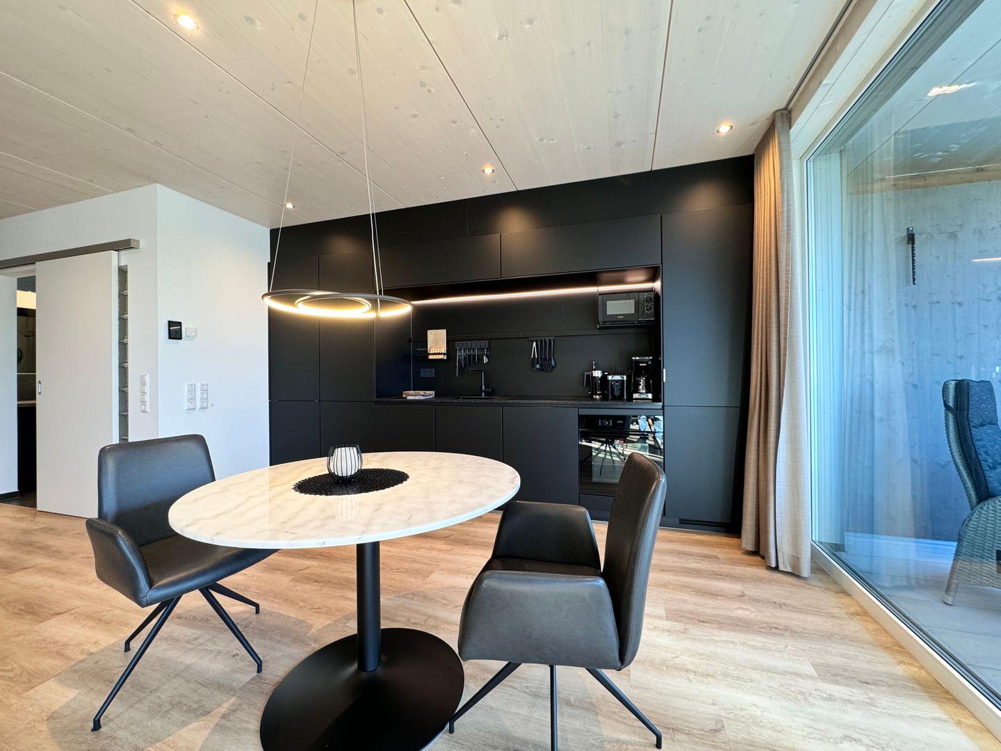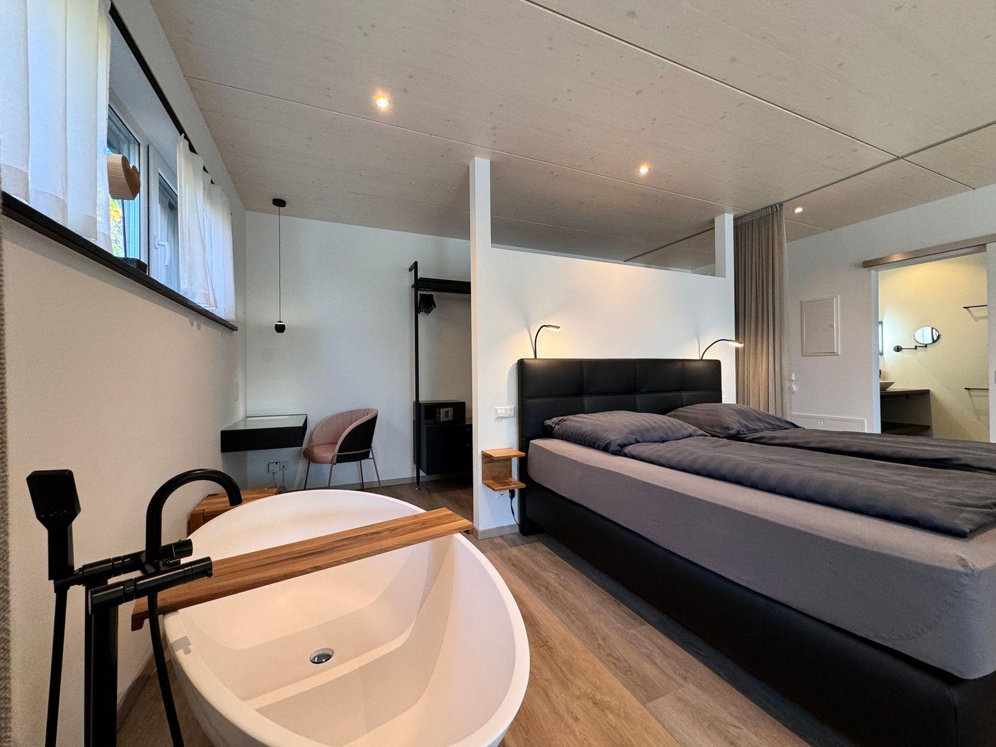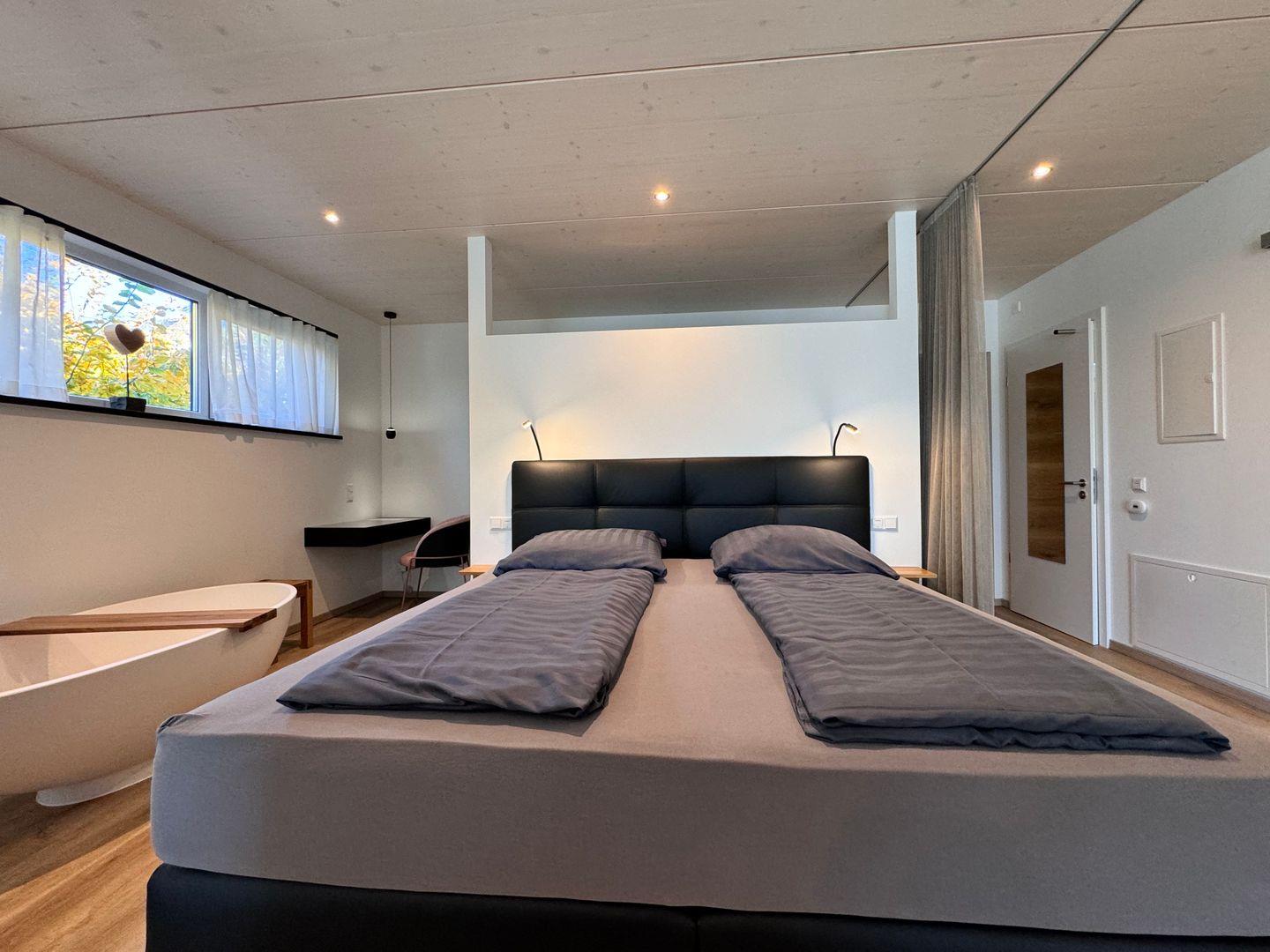 Das offene 1-Zimmer-Appartement überzeugt durch geradliniges schlichtes Design sowie ausgesuchte Möbel und Textilien. Die Ausstattung lässt keine Wünsche offen.