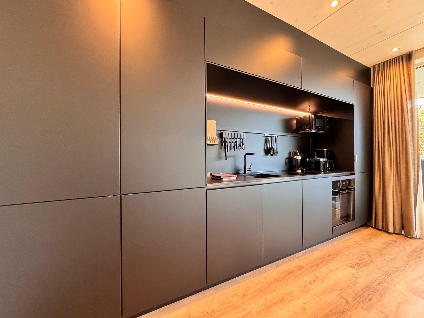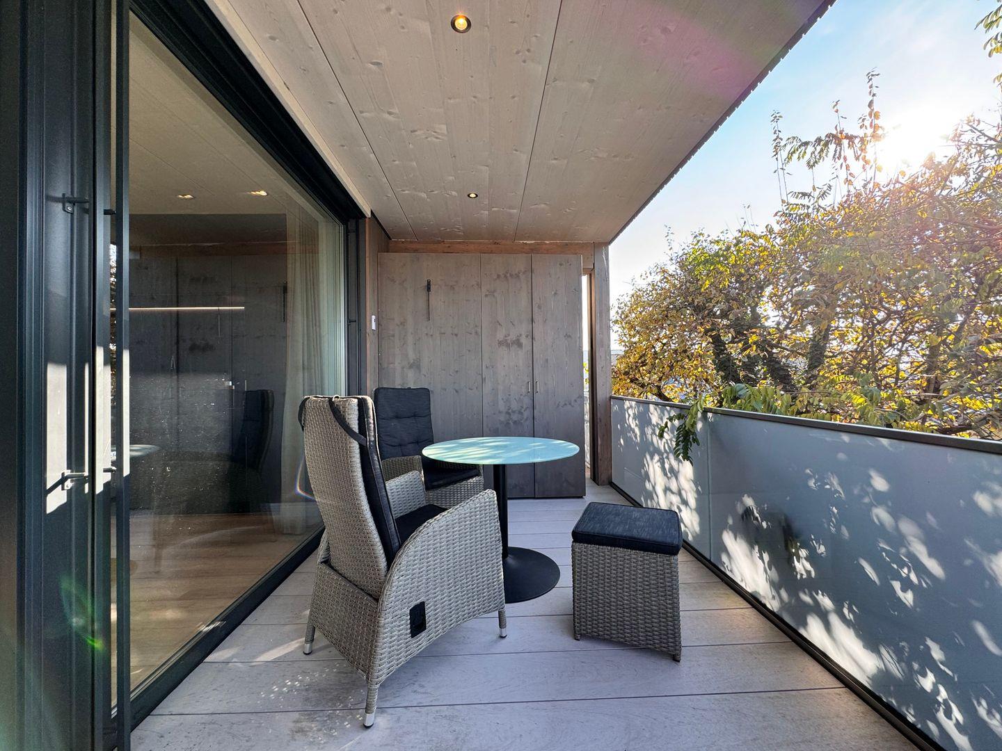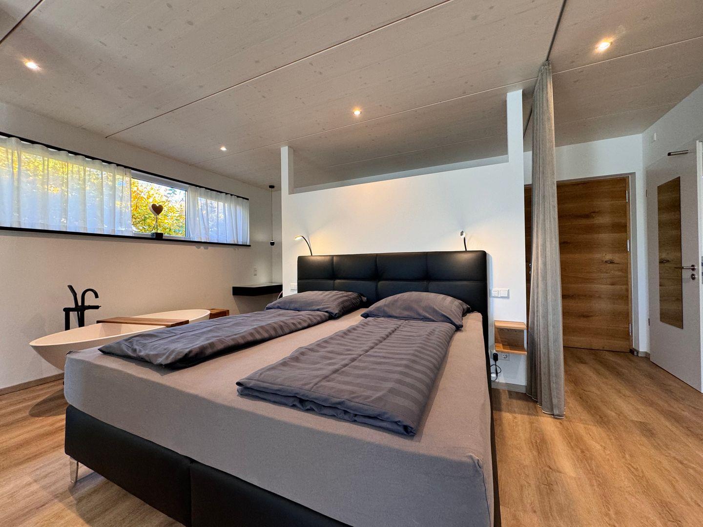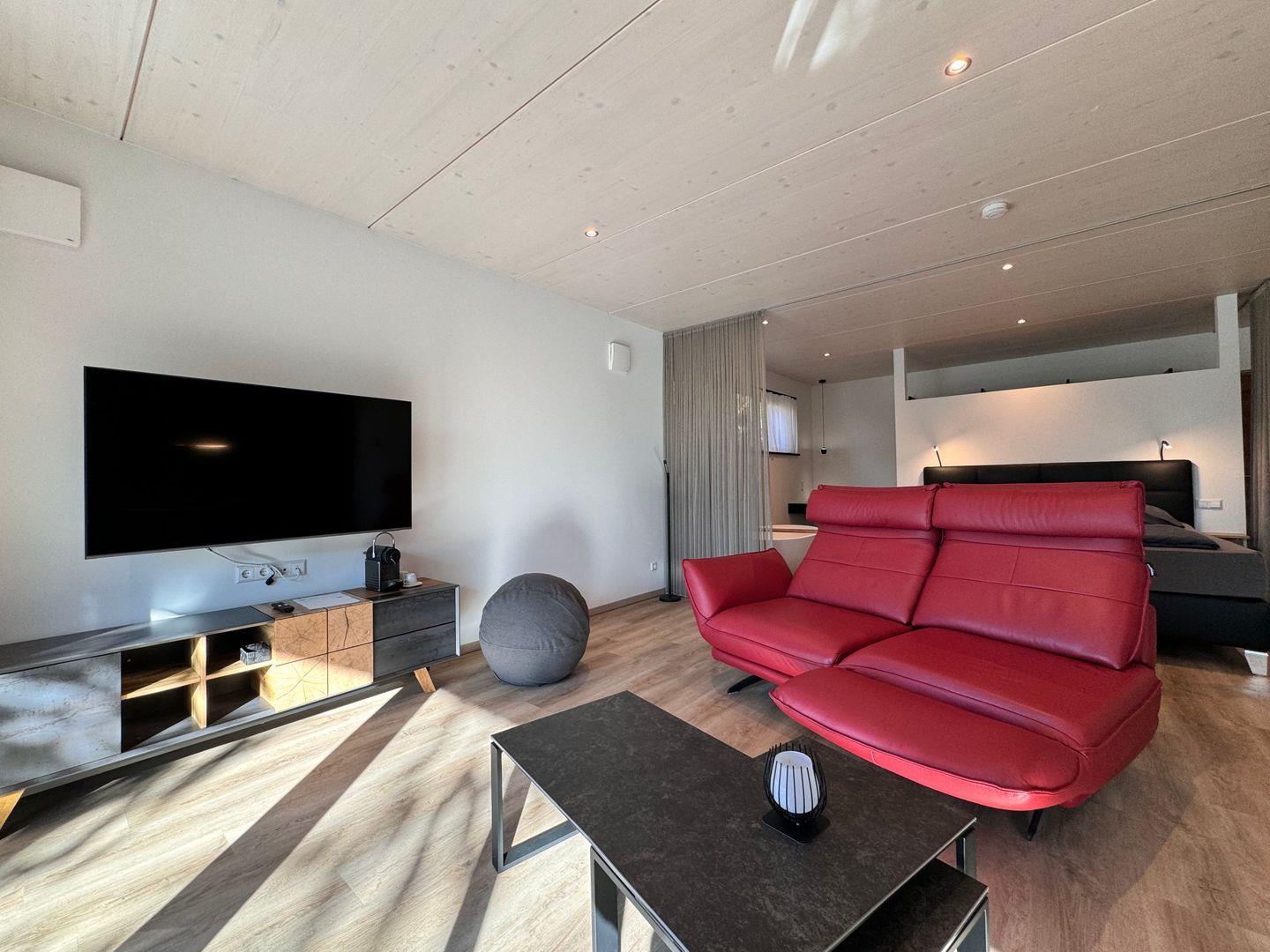 Das offene 1-Zimmer-Appartement überzeugt durch geradliniges schlichtes Design sowie ausgesuchte Möbel und Textilien. Die Ausstattung lässt keine Wünsche offen.