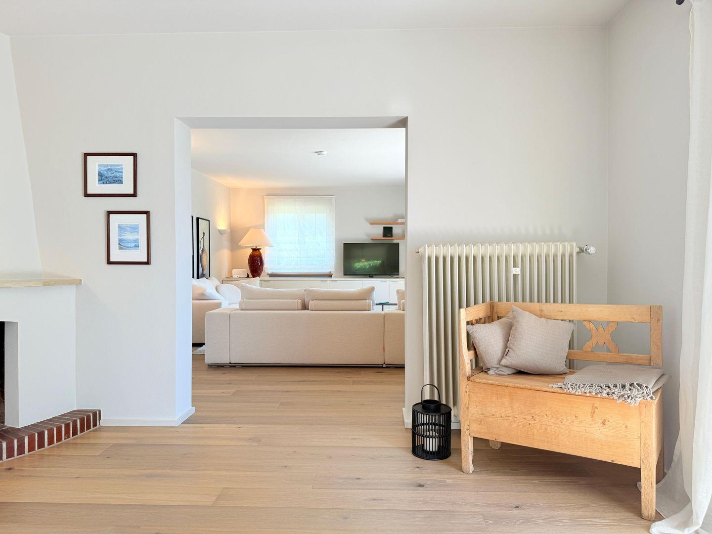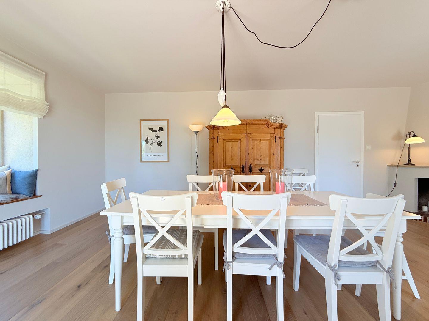 Die hochwertige, geschlossene Küche ist umfassend ausgestattet und ermöglicht Ihnen eine bequeme Selbstversorgung. Sie finden einen Ceranherd, Elektrobackofen, Kühlschrank mit integriertem Gefrierfach, Spülmaschine, Nespresso-Espressomaschine, Kaffeemaschine, Wasserkocher, Toaster, Geschirr, Besteck und zahlreiche Küchenutensilien. Im angrenzenden Esszimmer können die Mahlzeiten gemeinsam eingenommen werden.
