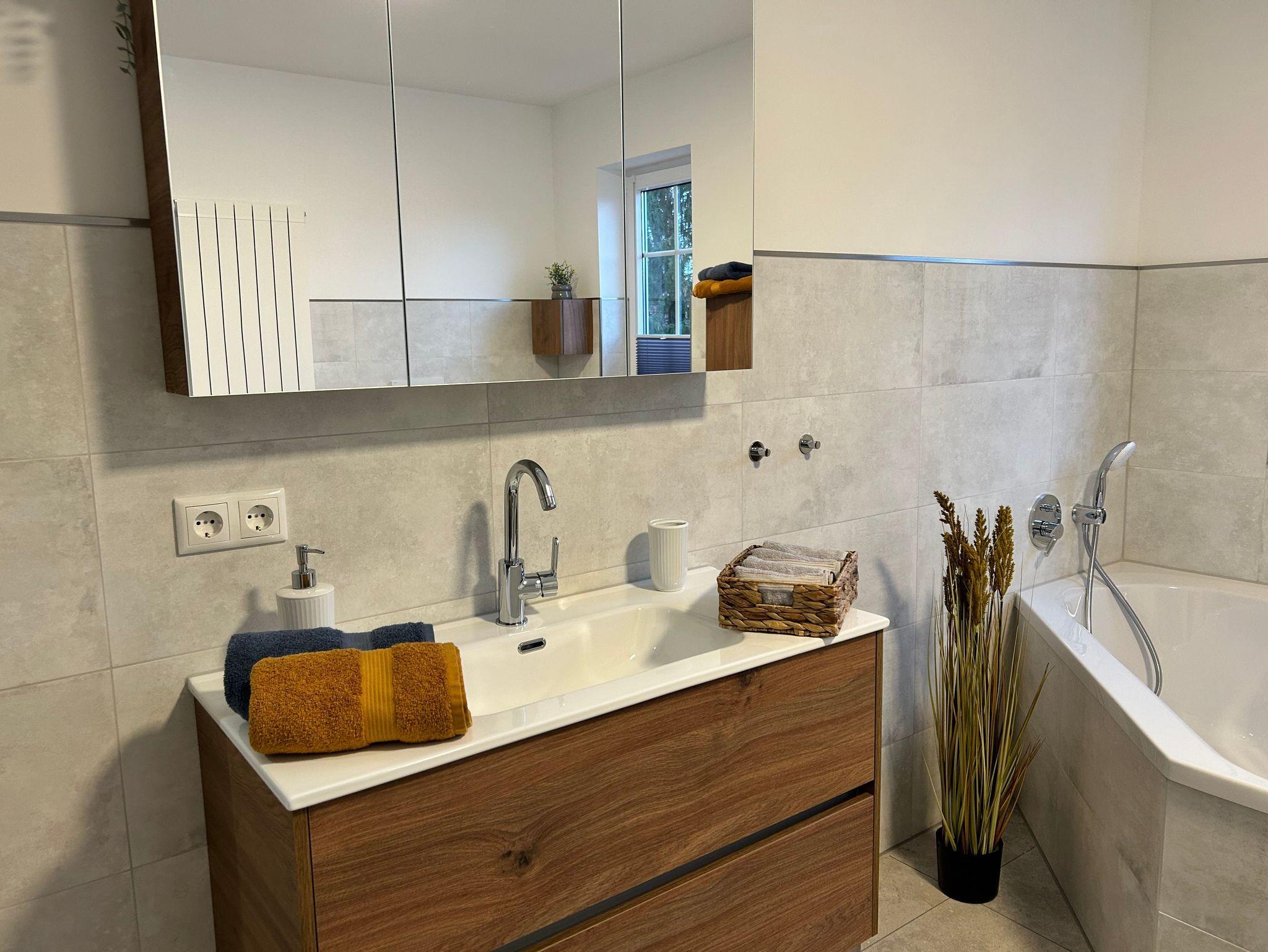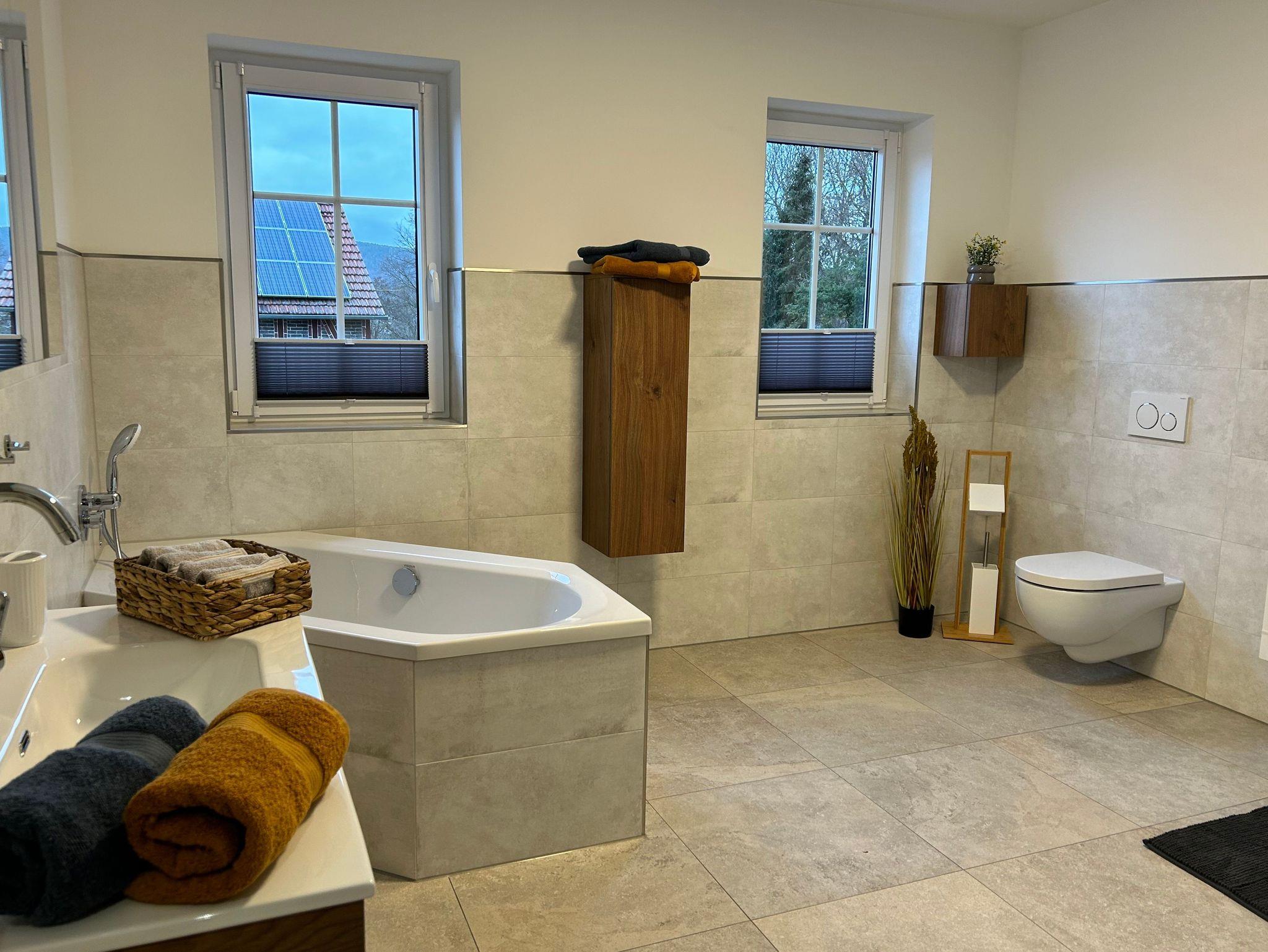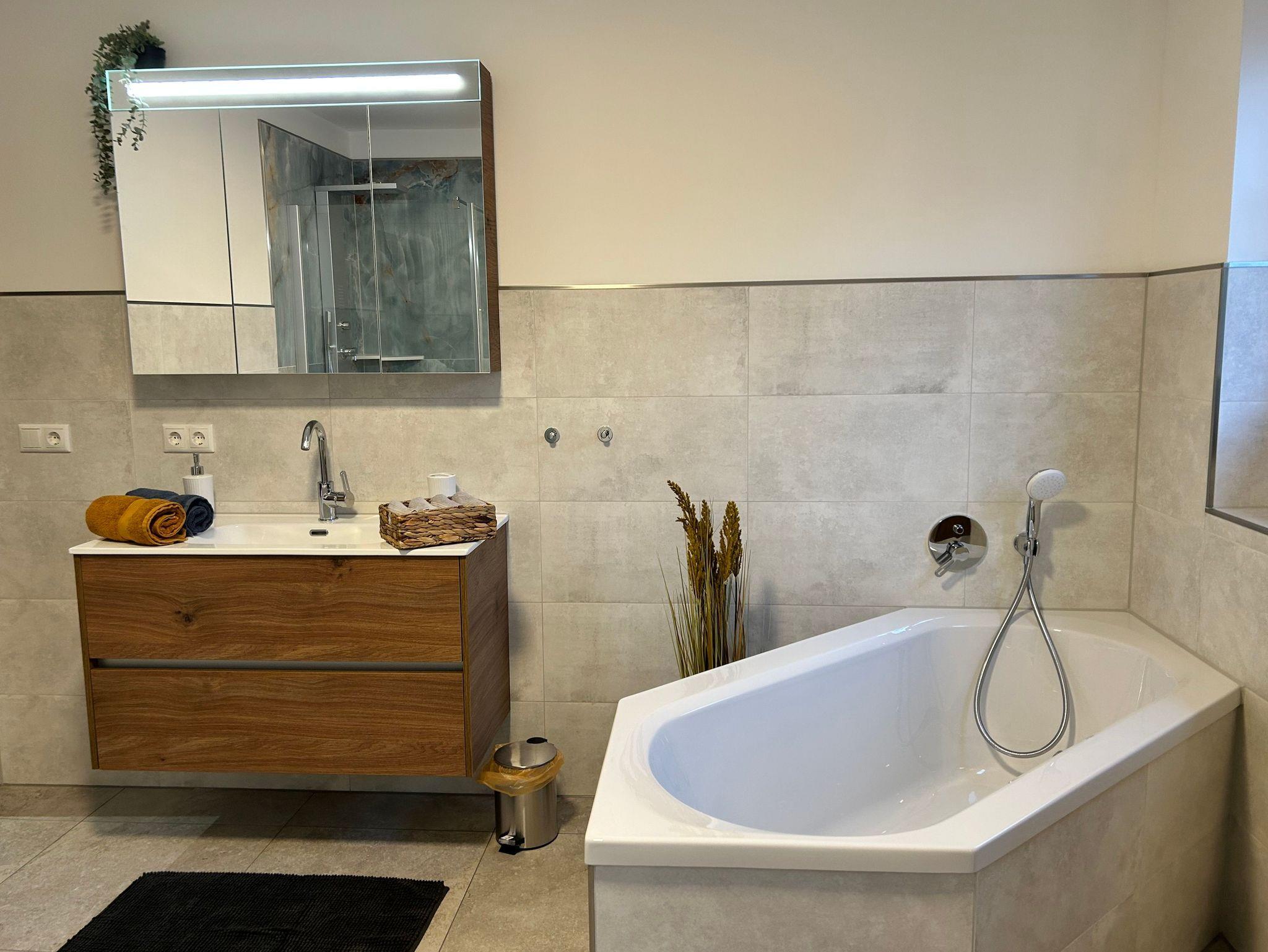 • 1 Badezimmer mit ebenerdiger Dusche, Badewanne, Toilette, Waschmaschine, Haartrockner, Handtücher