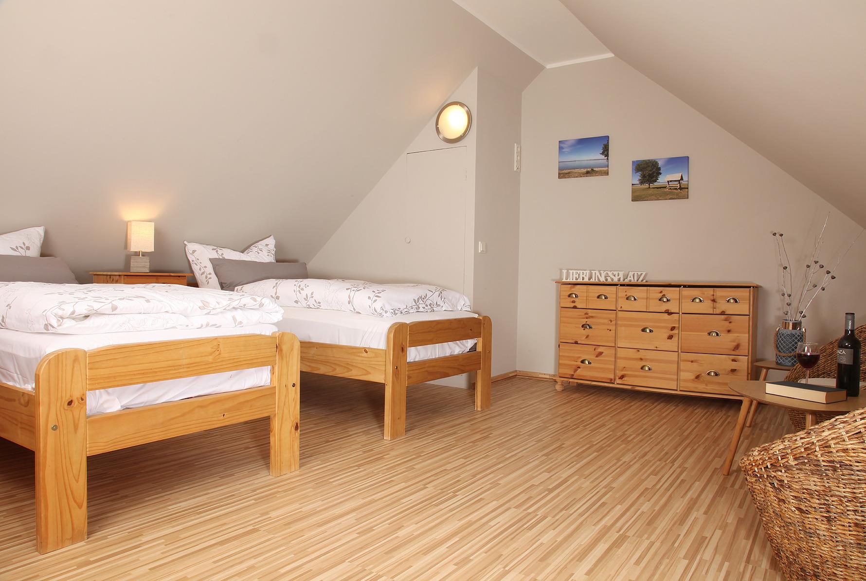 Eine wunderschöne offene Galerie befindet sich im Dachgeschoss des Hauses, wo sich das dritte Schlafzimmer befindet. Es ist mit zwei Einzelbetten ausgestattet, die man leicht zu einem Doppelbett verwandeln kann.