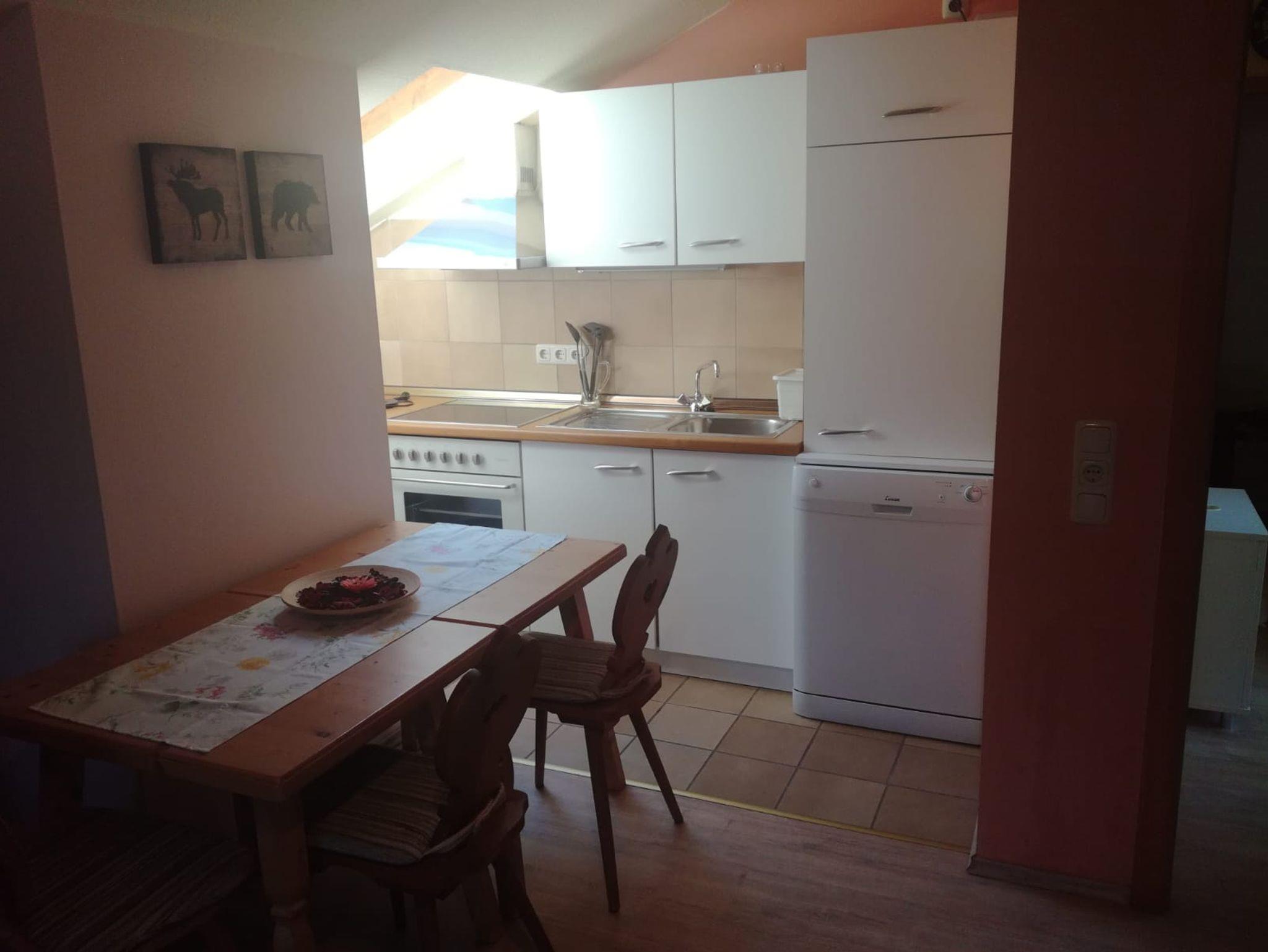Ferienwohnung/Dachwohnung in ruhiger, zentraler Lage mit überdachtem Balkon, Balkonmöbel, unverbauter Bergblick. Komplett eingerichtete Küche mit Backofen, Ceranfeld, Kühlschrank, Geschirrspülmaschine. Essecke, Doppelbett - Sitzgruppe/Schlafsofa, Flachbild-TV (SAT), kostenloses WLAN.