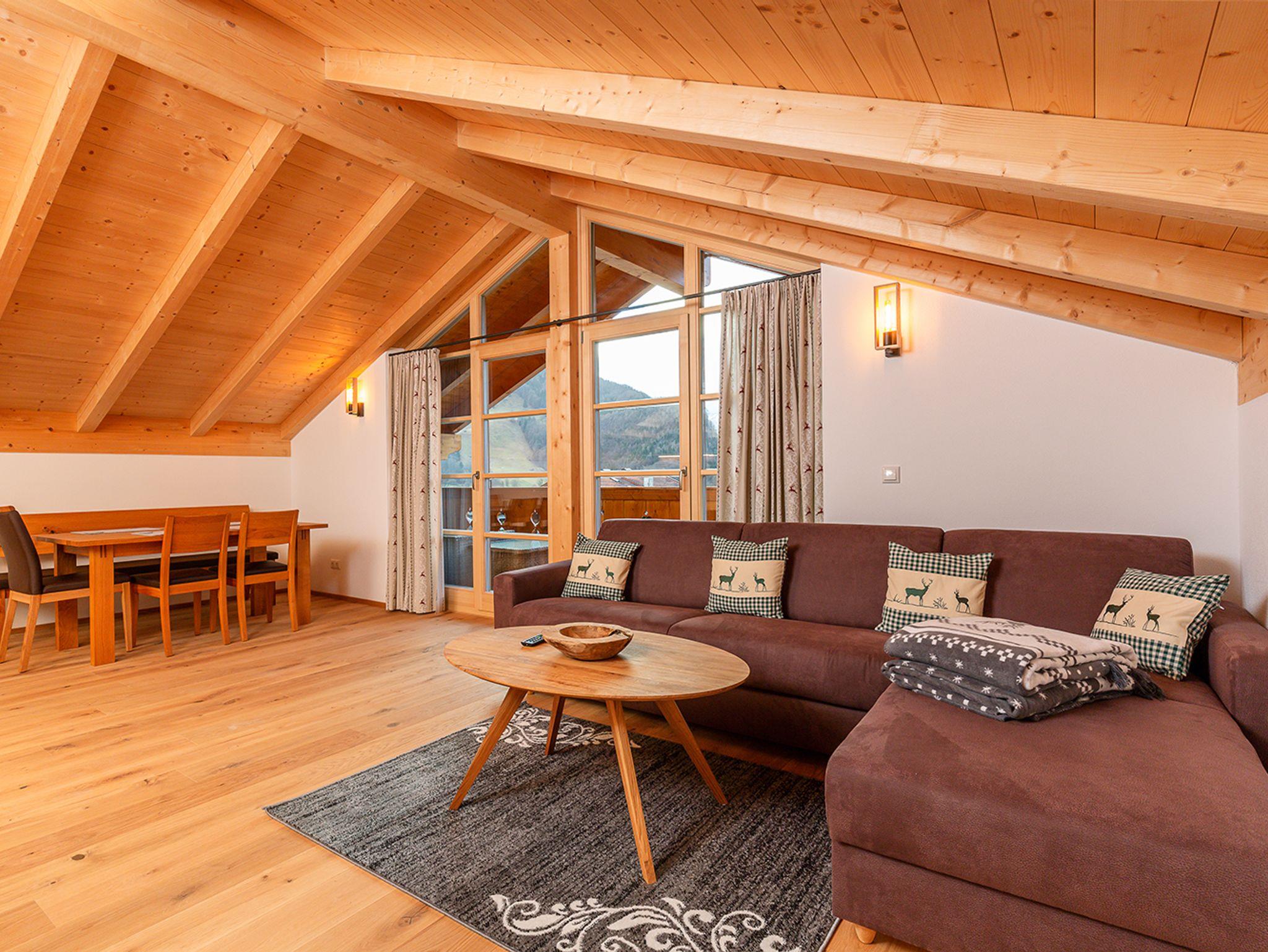 Die Ferienwohnung ist mit einer Infrarot Sauna, einer Badewanne, 2 hochwertigen Bädern, 2 Schlafzimmer (1 Zirbenholz Schlafzimmer mit Doppelbett, 1 Kernbuchen Schlafzimmer mit drei Einzelbetten), moderner, hochwertiger Küchen/Ess- und Wohnbereich mit Schlafcouch ausgestattet.