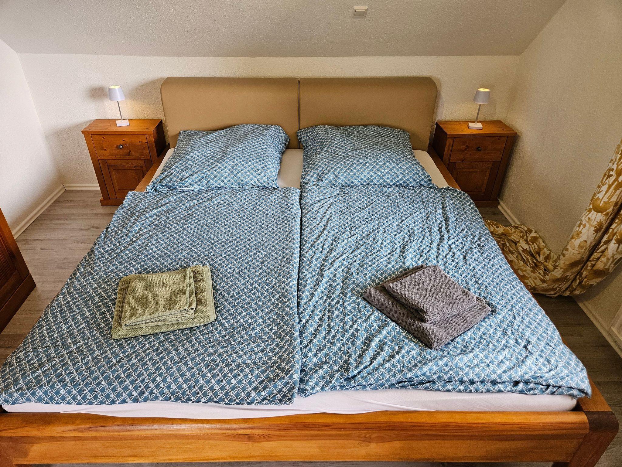 Schöne, Doppelhaus-Ferienwohnung auf zwei Etagen mit separaten Eingang und Stellplatz. Die 57qm Ferienwohnung bietet für zwei Personen genügend Platz für einen entspannten Urlaub. Im Erdgeschoss erwartet Sie eine vollausgestattete Küche mit Geschirrspühler, ein Badezimmer mit Dusche und WC sowie ein Wohnzimmer mit einer gemütlichen Couch und TV sowie eine kleine Essecke. Im Obergeschoss befindet sich das offene Schlafzimmer mit einem Doppelbett (1,80x2,00m) mit angrenzendem Balkon. Bettwäsche, Handtücher sowie WLAN sind inklusive. In der Wohnung sind Haustiere herzlich willkommen (Aufpreis).