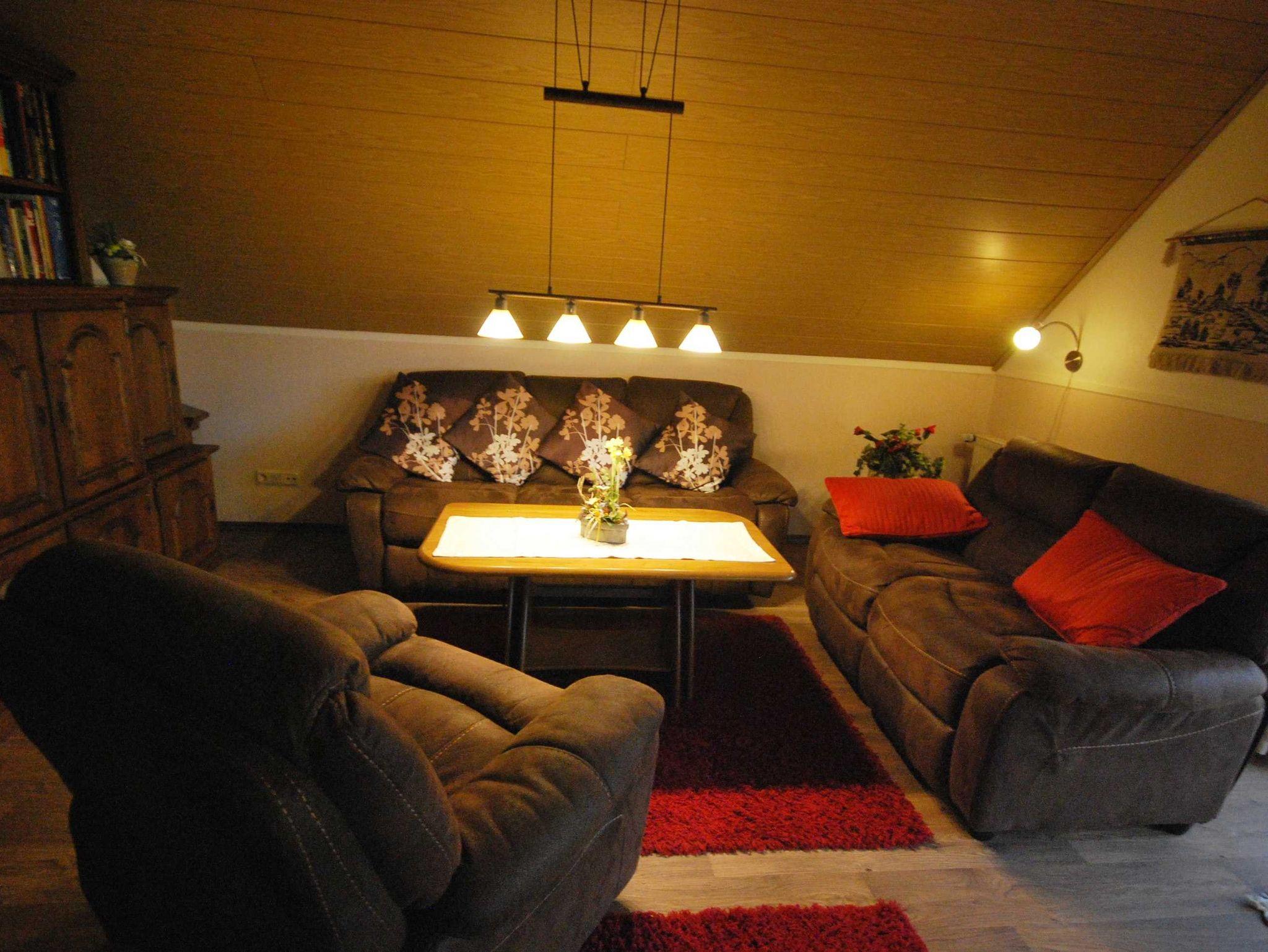 Sie verfügen über ein großes Wohnzimmer mit Schreibtisch und Sat-TV. Von hier aus kommen Sie auf den bedachten Balkon und können hier die Natur genießen. Zwei Schlafzimmer mit jeweils einem Doppelbett (ein Schlafzimmer zusätzlich mit Kinderbett und zweiten Flachbildfernseher), sowie eine komplett eingerichtete Küche gehören ebenfalls zur Ferienwohnung. Zum großzügigen Badezimmer gehört eine Badewanne, eine Dusche, ein WC sowie eine Waschmaschine und einen Trockner. Zusätzlich gibt es ein separates WC.