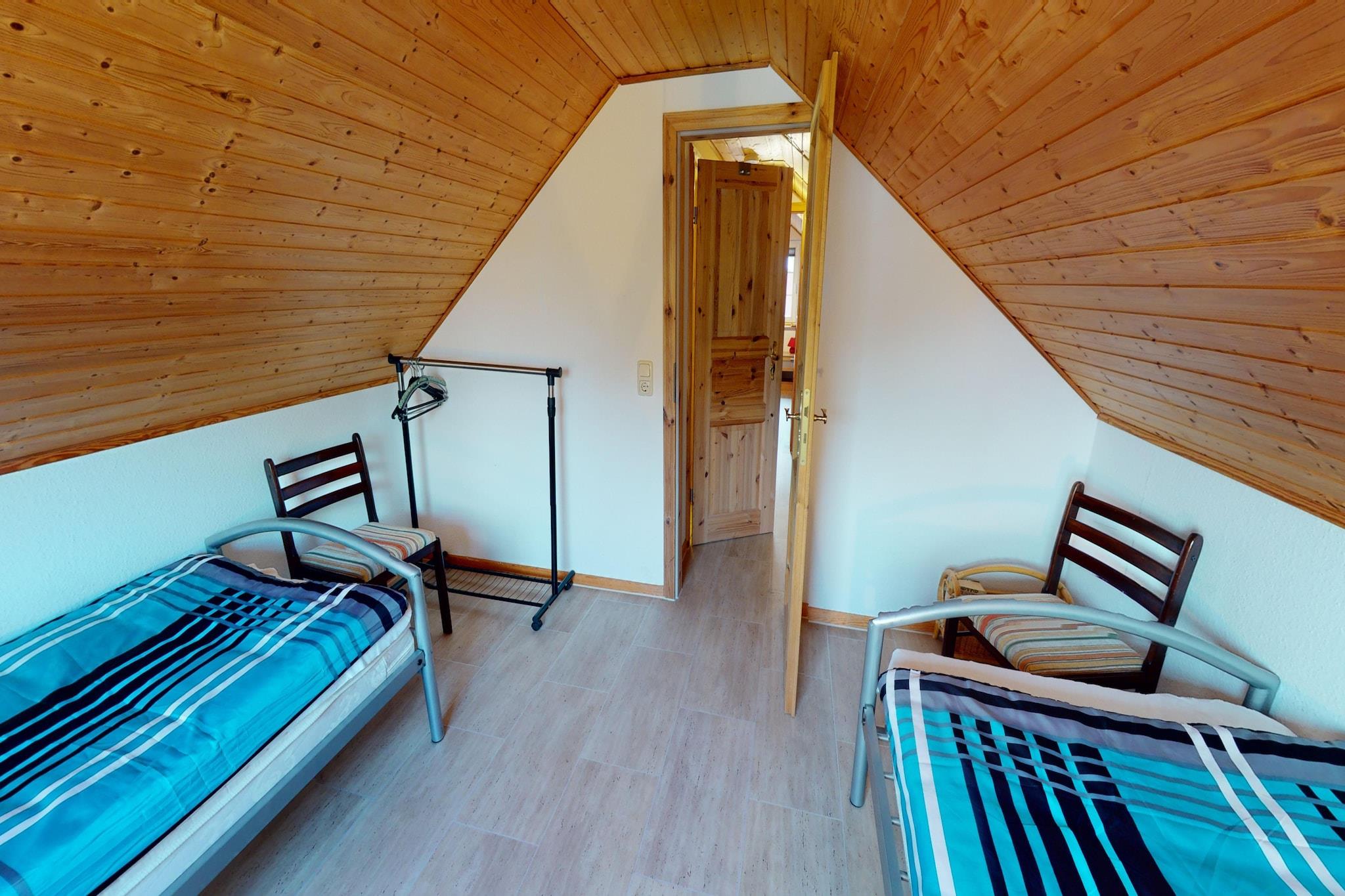 Parterre: (offene Küche(Kochplatte(4 Kochplatten, Ceranfeld), Wasserkocher, Toaster, Dunstabzugshaube, Kaffeemaschine, Backofen, Spülmaschine, Kühl-/Gefrierkombination), Wohn/Esszimmer(TV(Satellit), Kaminofen, Sitzecke, Radio), Schlafzimmer(Doppelbett(140 x 200 cm)), Badezimmer(Dusche, Sauna, Waschbecken, Toilette)) In der 1. Etage: (Schlafzimmer(Einzelbett(90 x 200 cm), Einzelbett(90 x 200 cm)), Schlafzimmer(Einzelbett(90 x 200 cm), Einzelbett(90 x 200 cm)), Toilette(Waschbecken, Toilette)) Grill, Waschmaschine(Gemeinschaftliche Nutzung mit anderen Gästen, gegen Gebühr), Heizung, Terrasse, Parkplatz, Sonnenschirm, Sandkasten, Hochstuhl, Babybett (kostenpflichtig), Bettwäsche gegen Gebühr
