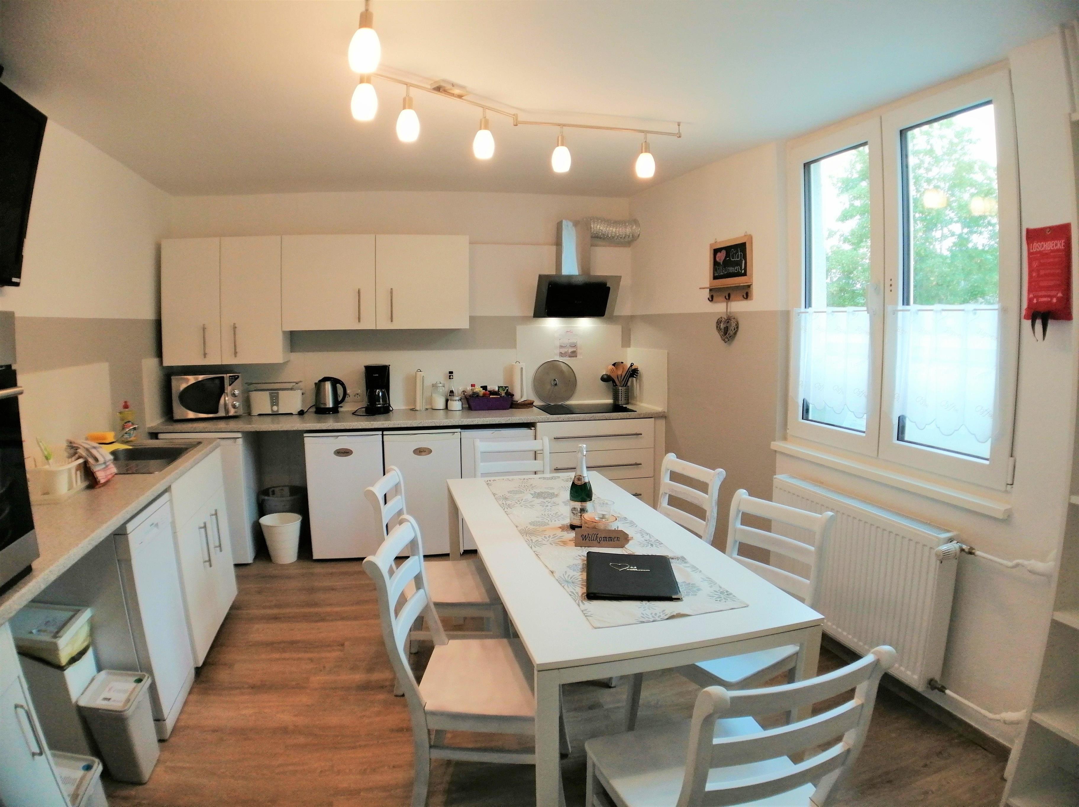 Die helle Küche ist ausgestattet mit: Herd, Backofen, Microwelle, Kaffeemaschinen, Geschirrspüler und weiteren Utensilien.
