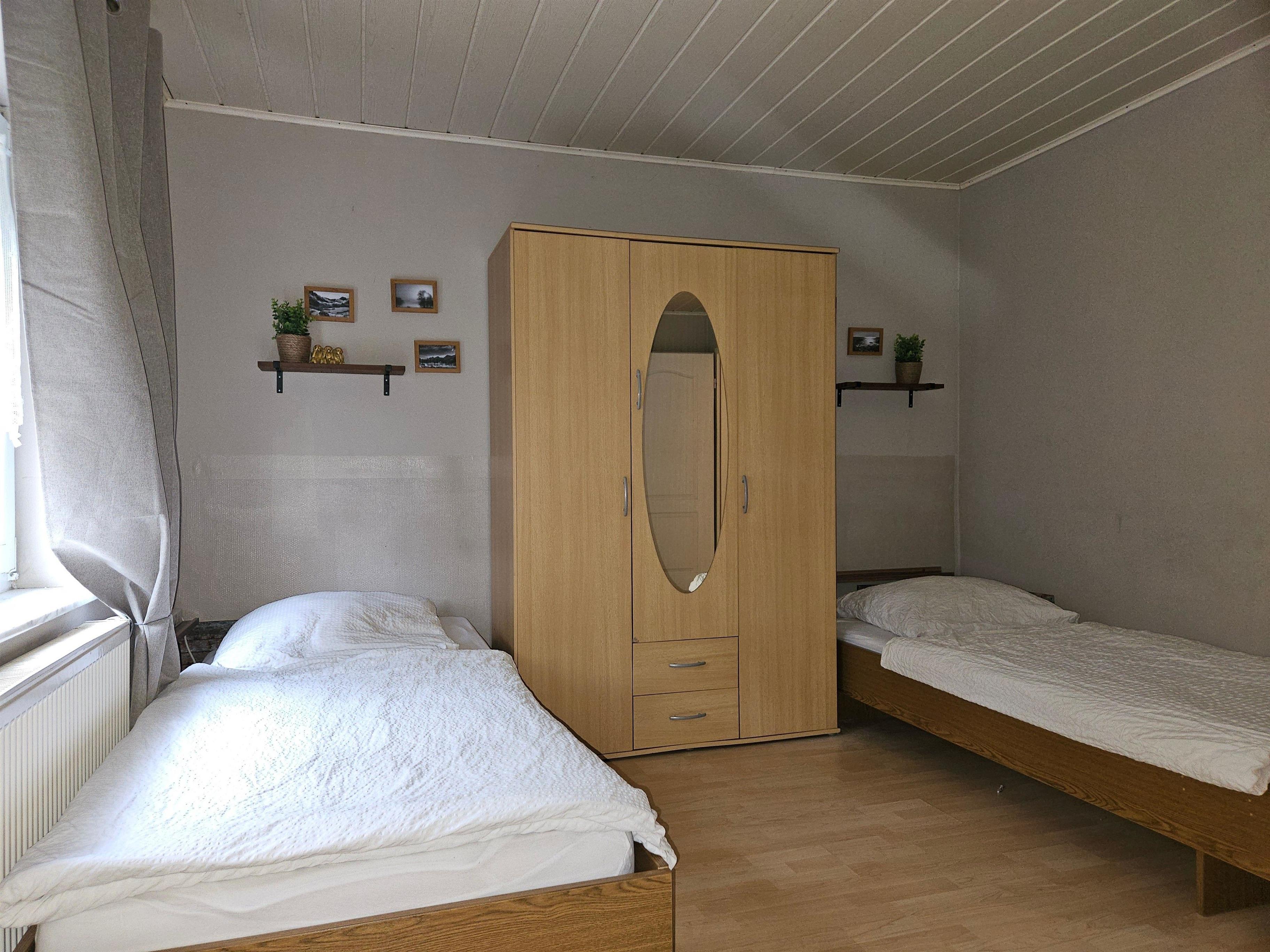 Schlafzimmer für 3 Personen mit Betten (90x200) und Kleiderschrank mit Spiegel.