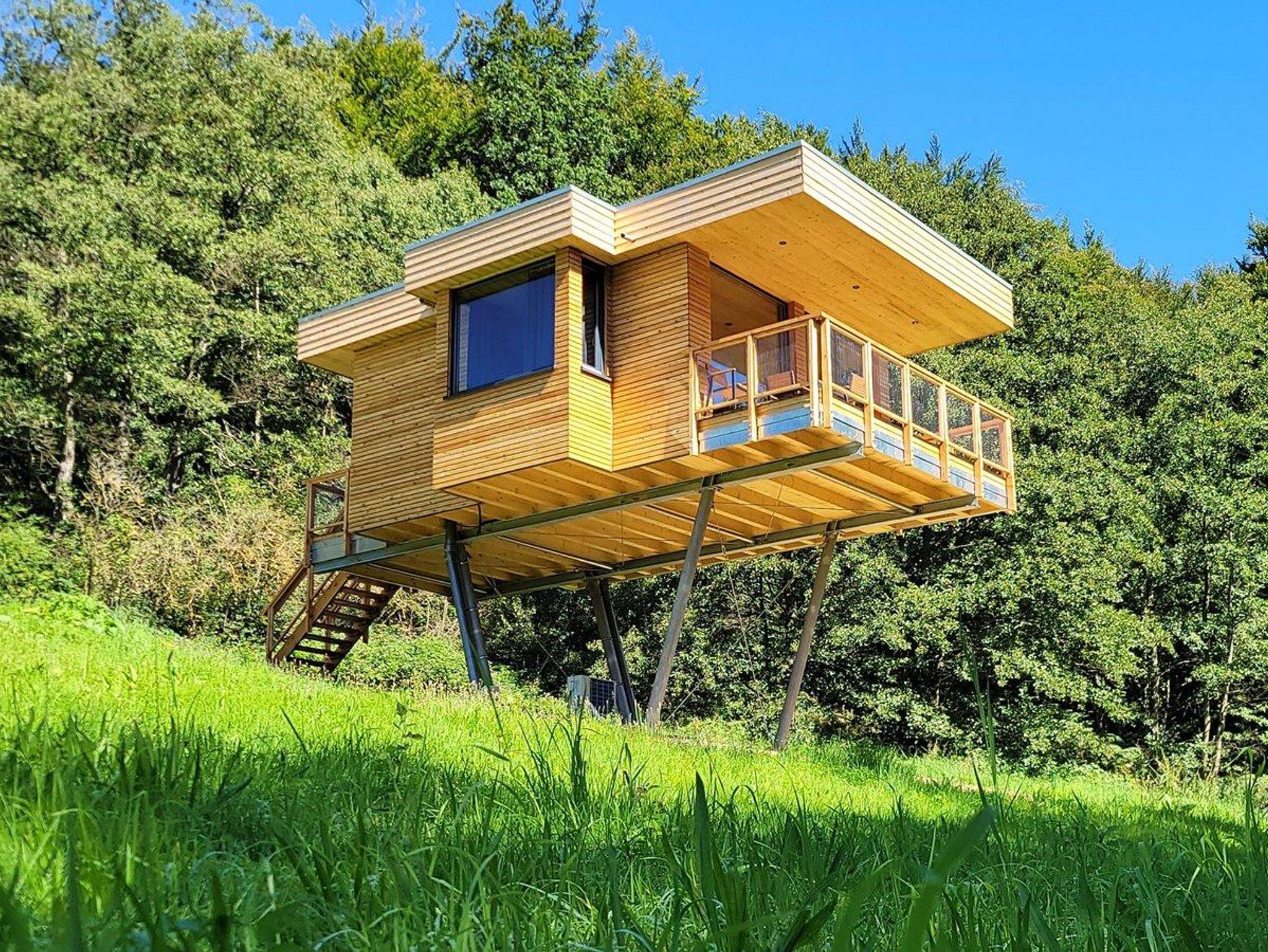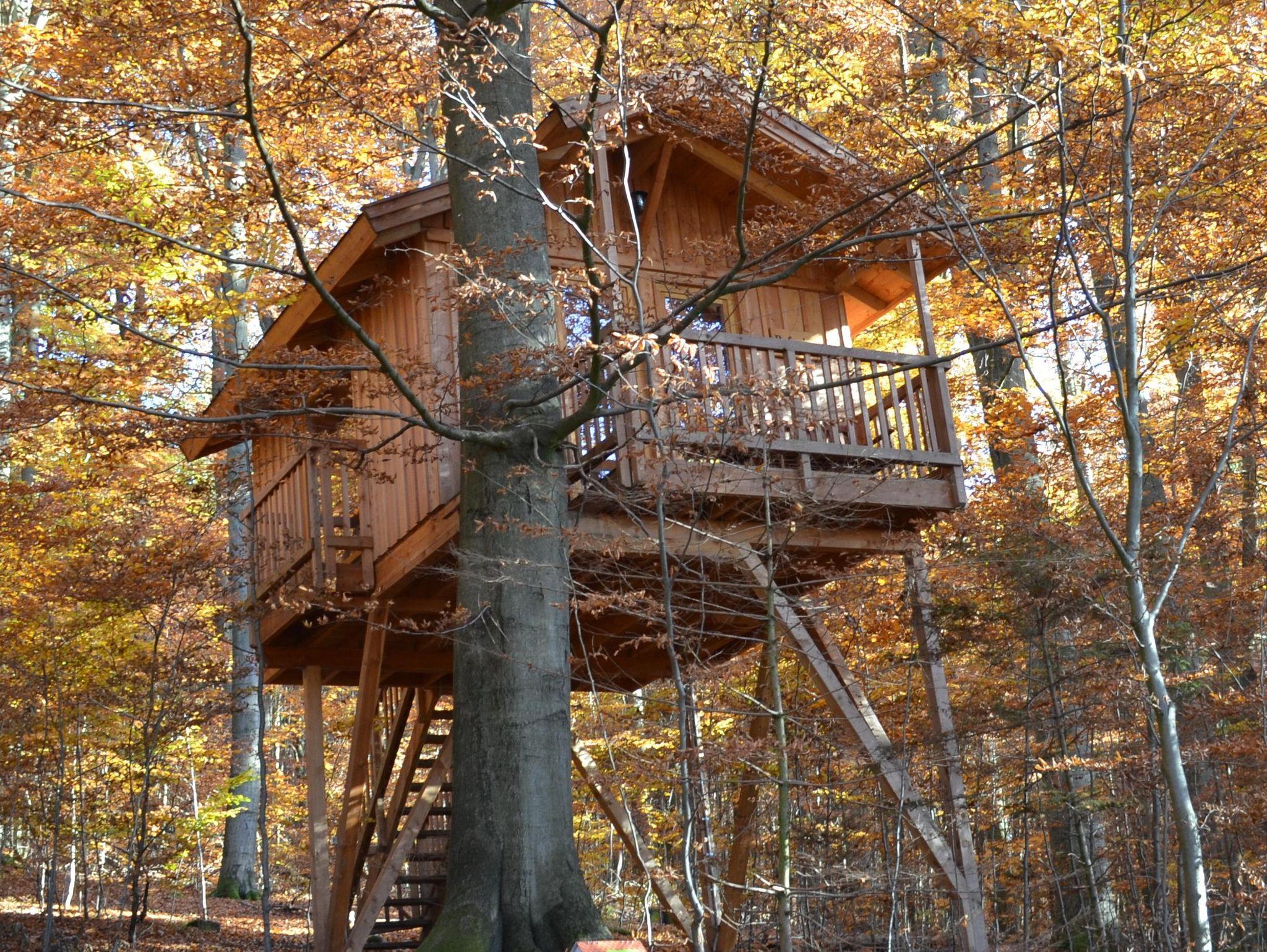 In diesem Baumhaus hat man den perfekten Blick in den Wald. Zwei französische Balkone und ein „richtiger“ Balkon lassen in Punkto Ausblick keine Wünsche offen.