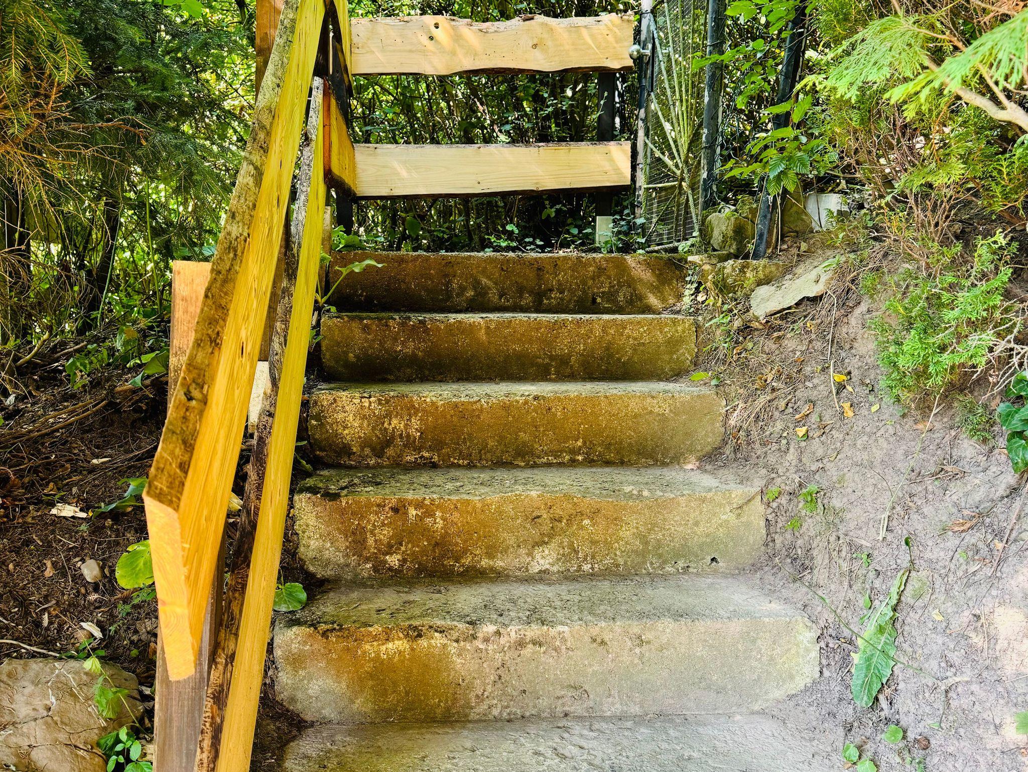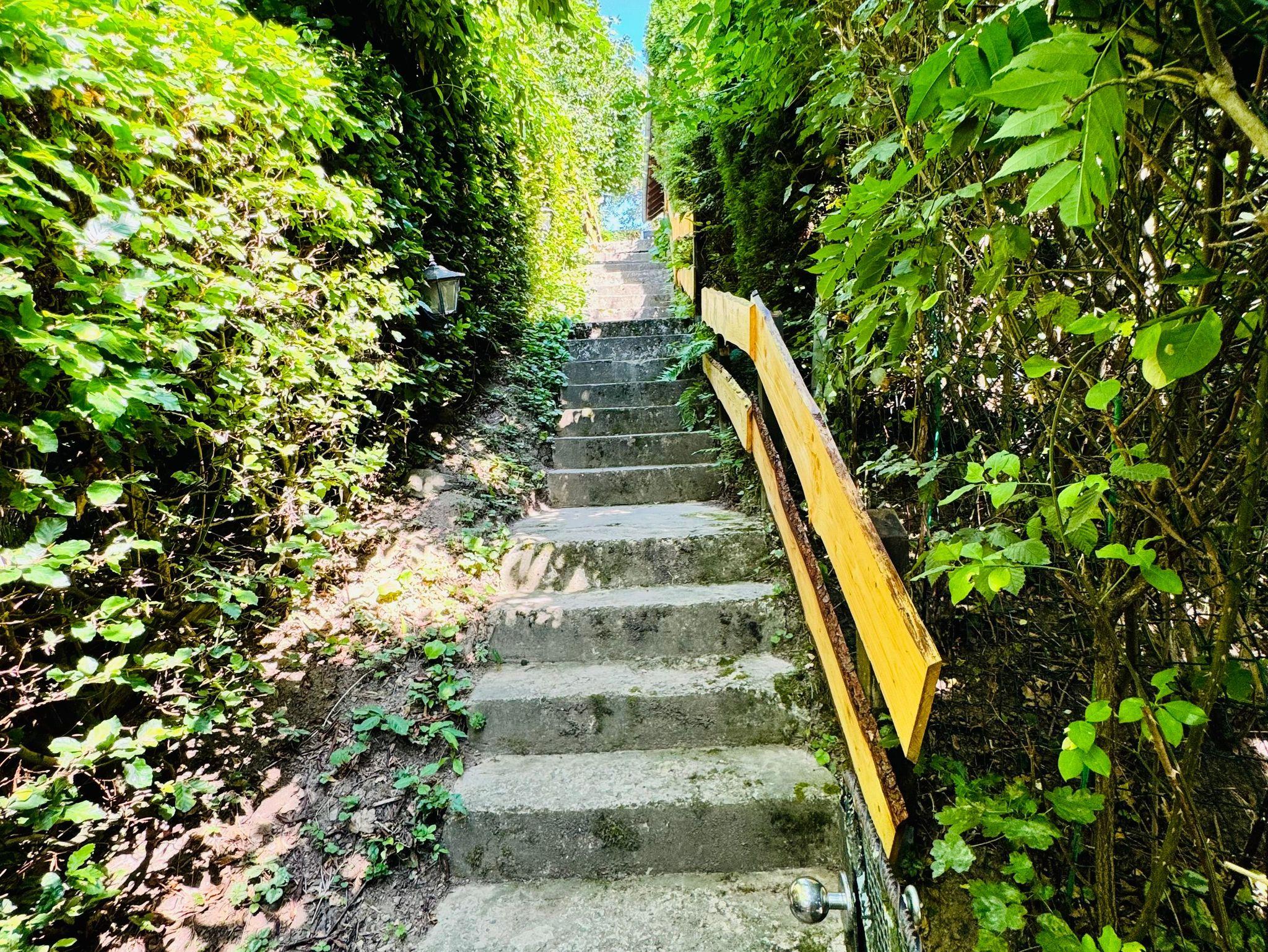 Es gibt die Hauptzufahrt nach oben ans Haus, welche zum Ausladen des Gepäcks oder des Einkaufs genutzt werden kann und es gibt unten am Haus eine Parkmöglichkeit , von dort aus erreichen sie das Haus über einen Treppenaufgang.