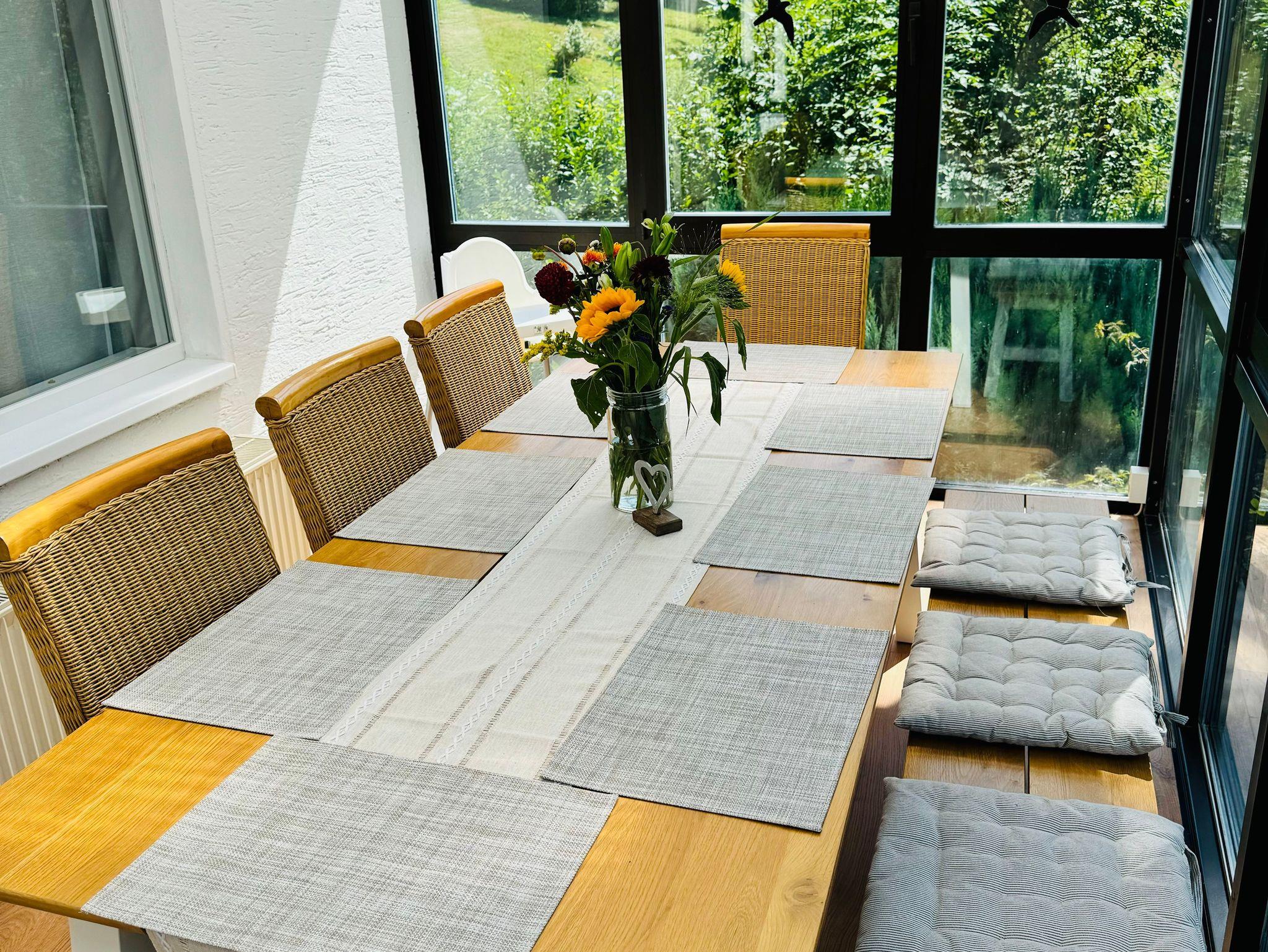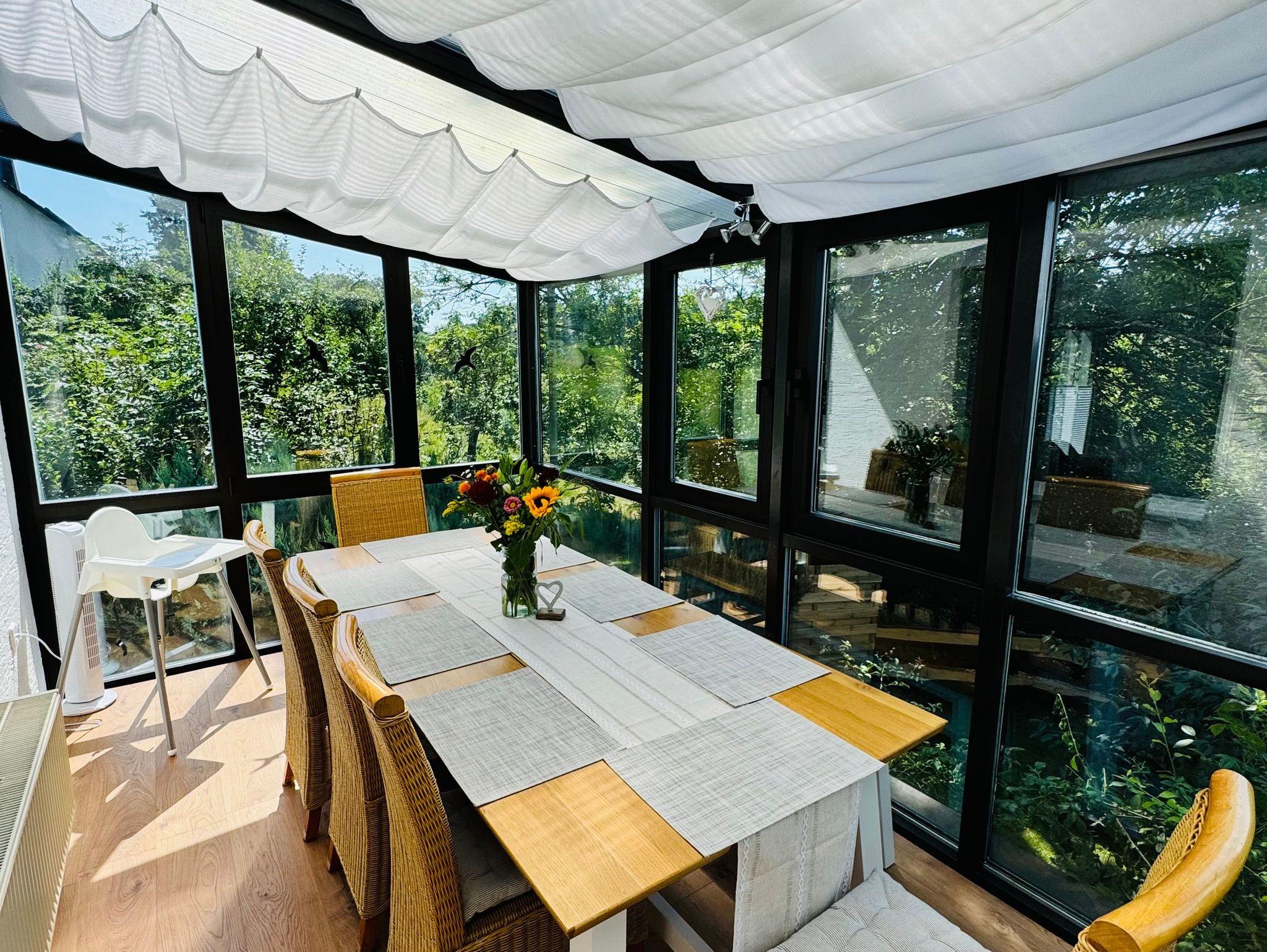 -einen Wintergarten mit Esstisch, dieser bietet Platz für bis zu 8 Personen