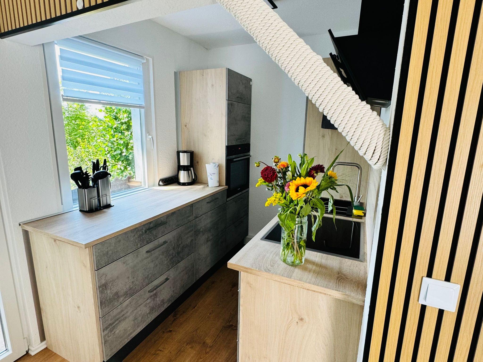 - eine Voll ausgestattete offene Küche mit Geschirrspüler, Mikrowelle, Backofen, Herd, und Kaffeemaschine