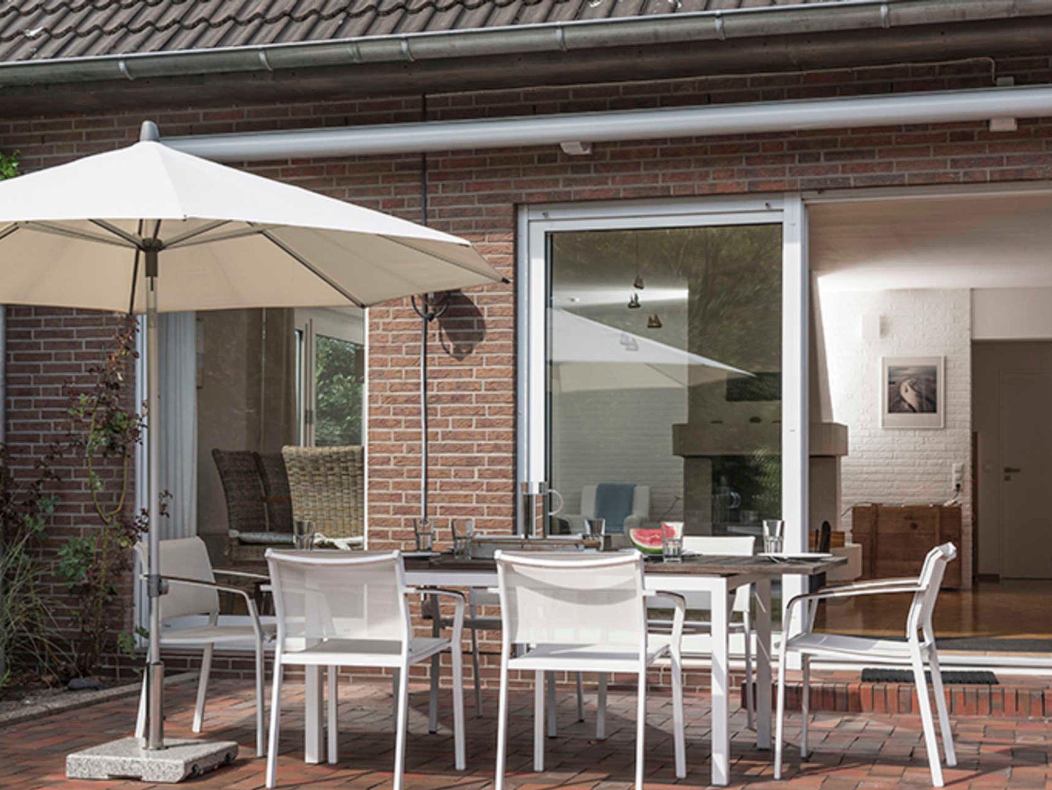 Im großzügigen Wohnzimmer mit Kamin kann man sich treffen, Tee trinken oder zusammen essen am großen Tisch für 12 Personen. In der geräumigen Küche mit Stehtisch lässt sich hervorragend zusammen kochen oder einfach schnacken. Auf der Terrasse, im Garten oder in der sog. „Lounge“ geht am gemeinsamen Grillen fast kein Weg vorbei. Die Kinder können jederzeit raus in den großen, eingewachsenen Garten.