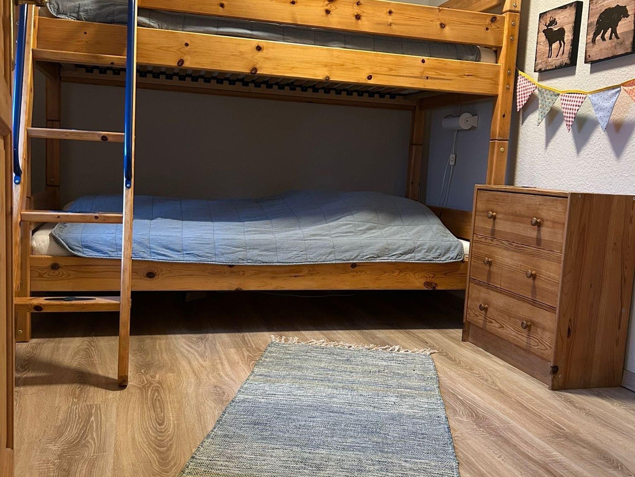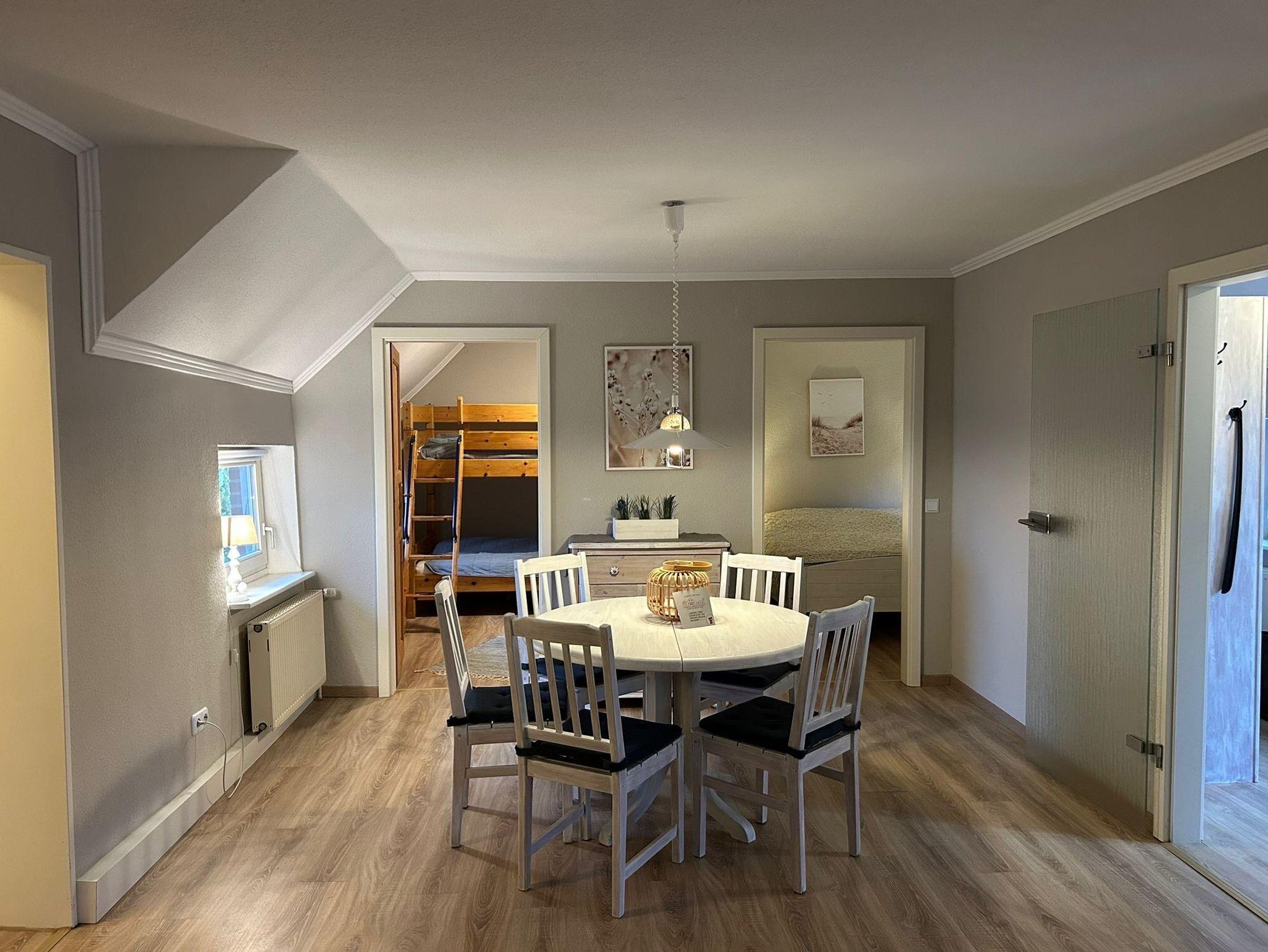 Gemütliche, moderne und ebenerdige Ferienwohnung für vier Personen mit Blick in die Weiden. Separater Küchenbereich mit kleinem Sitzplatz für 2 - 3 Personen und mit Zugang zum gemeinschaftlichen Garten. Ess- und Wohnbereich gehen in einander über; ausziehbarer Esstisch für 4 - 6 Personen.