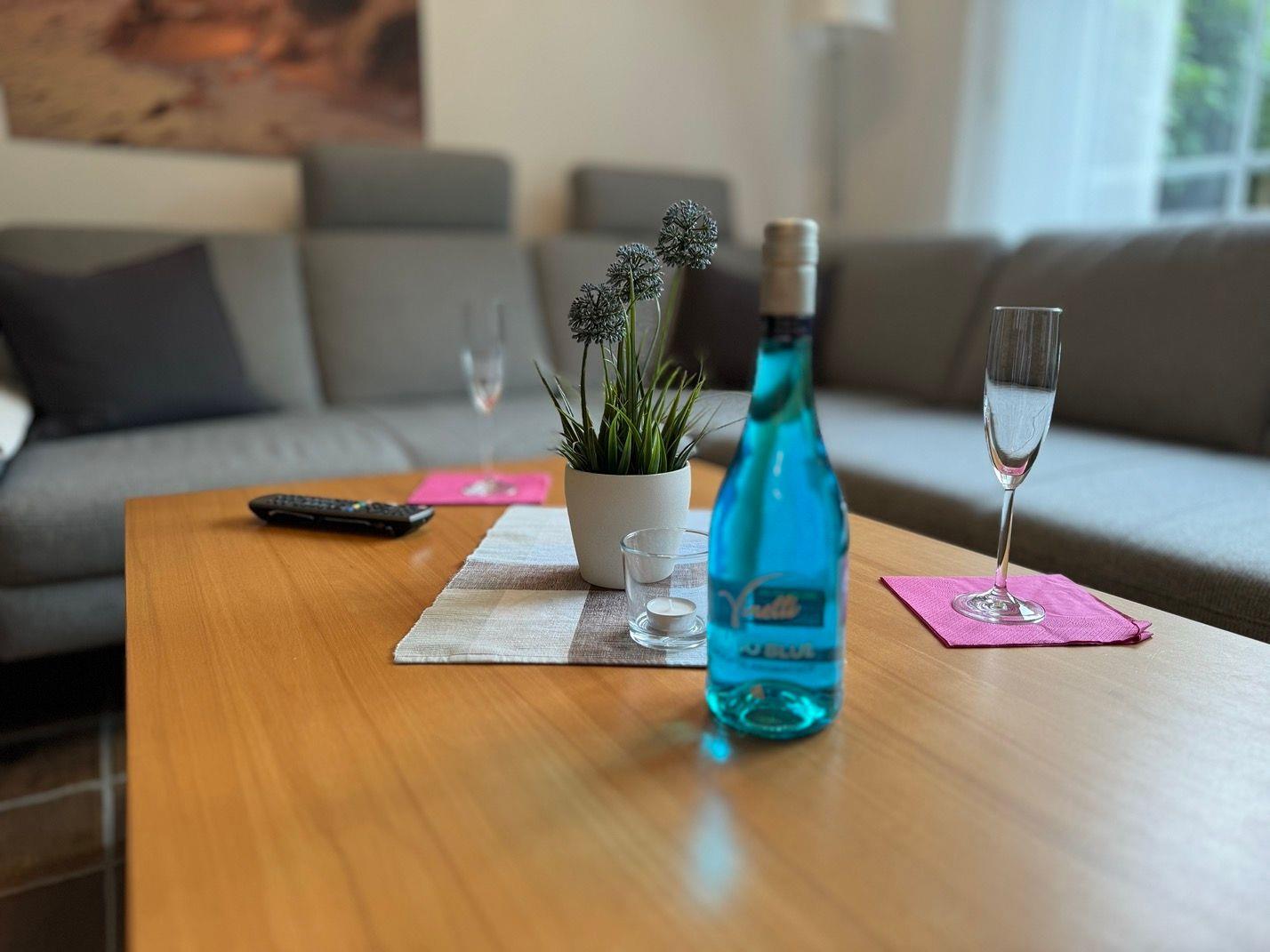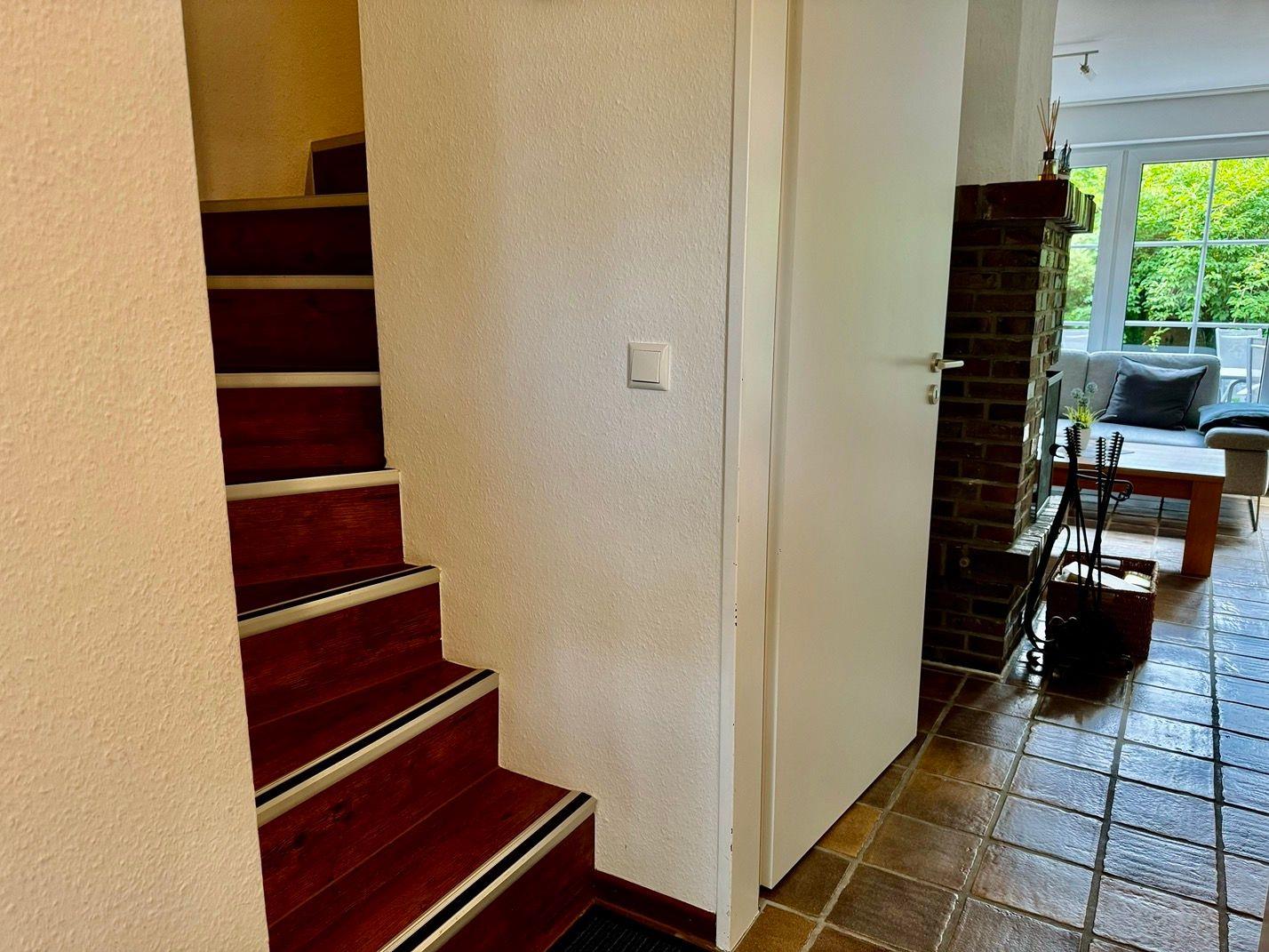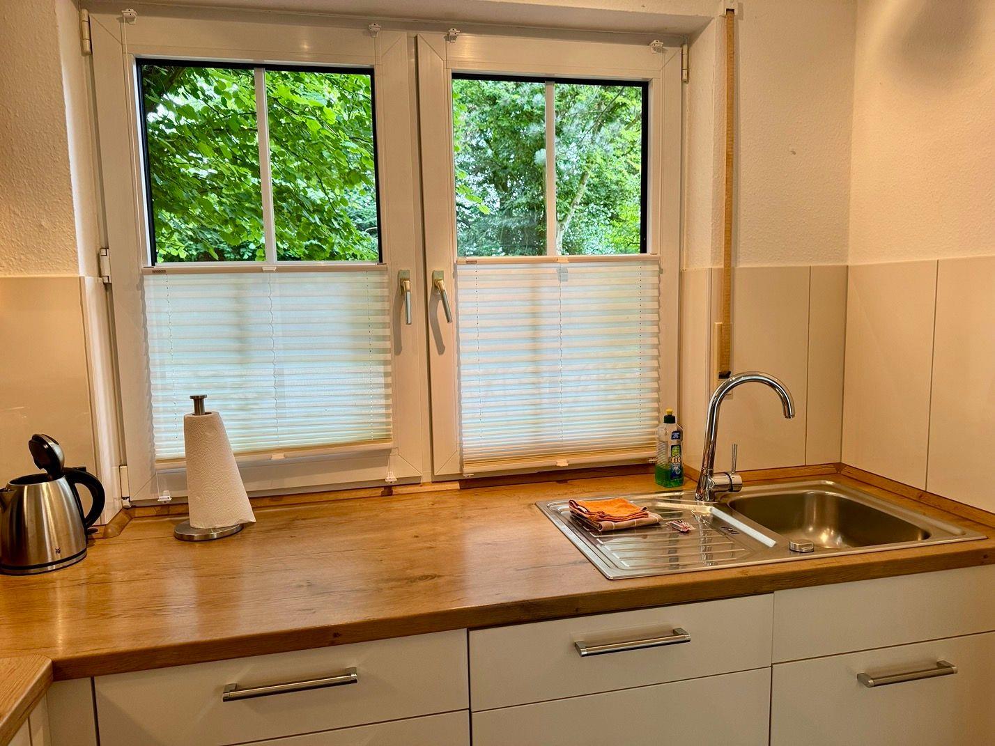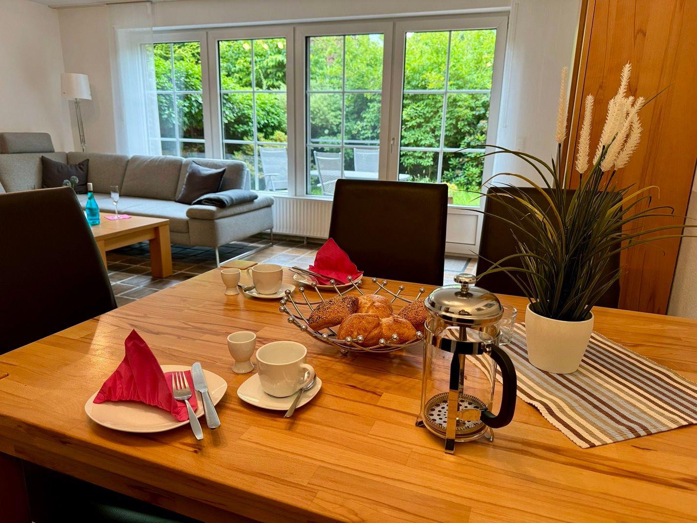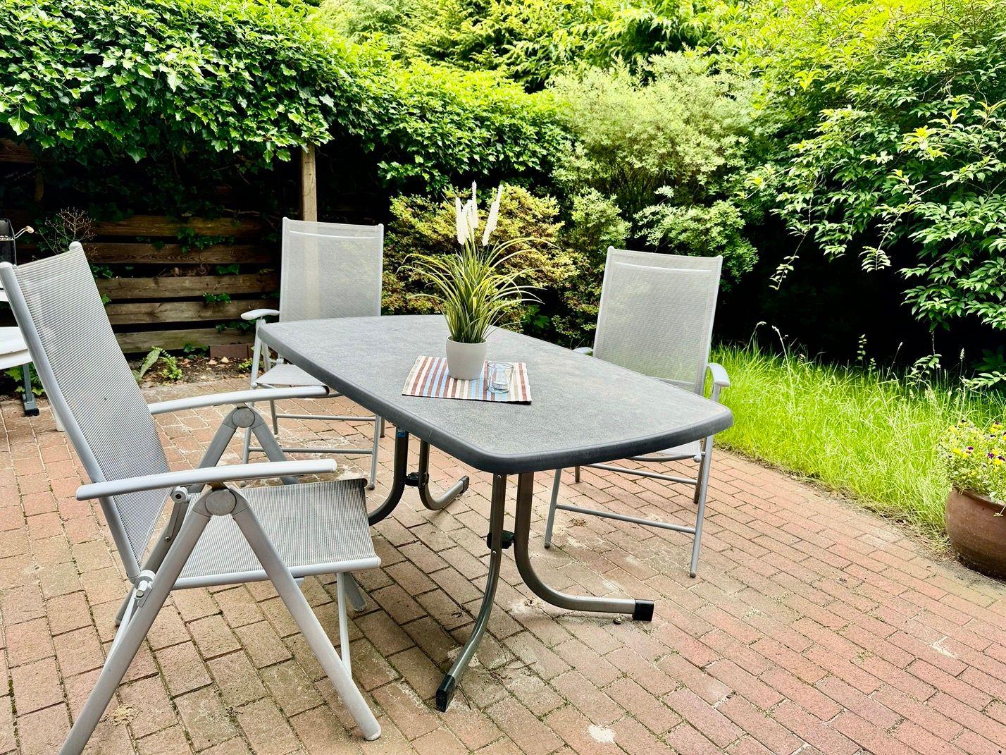 Ein wunderschönes großes Reihenendhaus mit KAMIN, gemütliches Wohnzimmer mit Essecke und Blick in den großen Süd-Garten, separate neue moderne Küche mit schönem Ausblick, 3 Schlafzimmer für 5 Personen - 1x mit Doppelbett 2x2 m und die Bettdecken mit 1,55x2,20m,