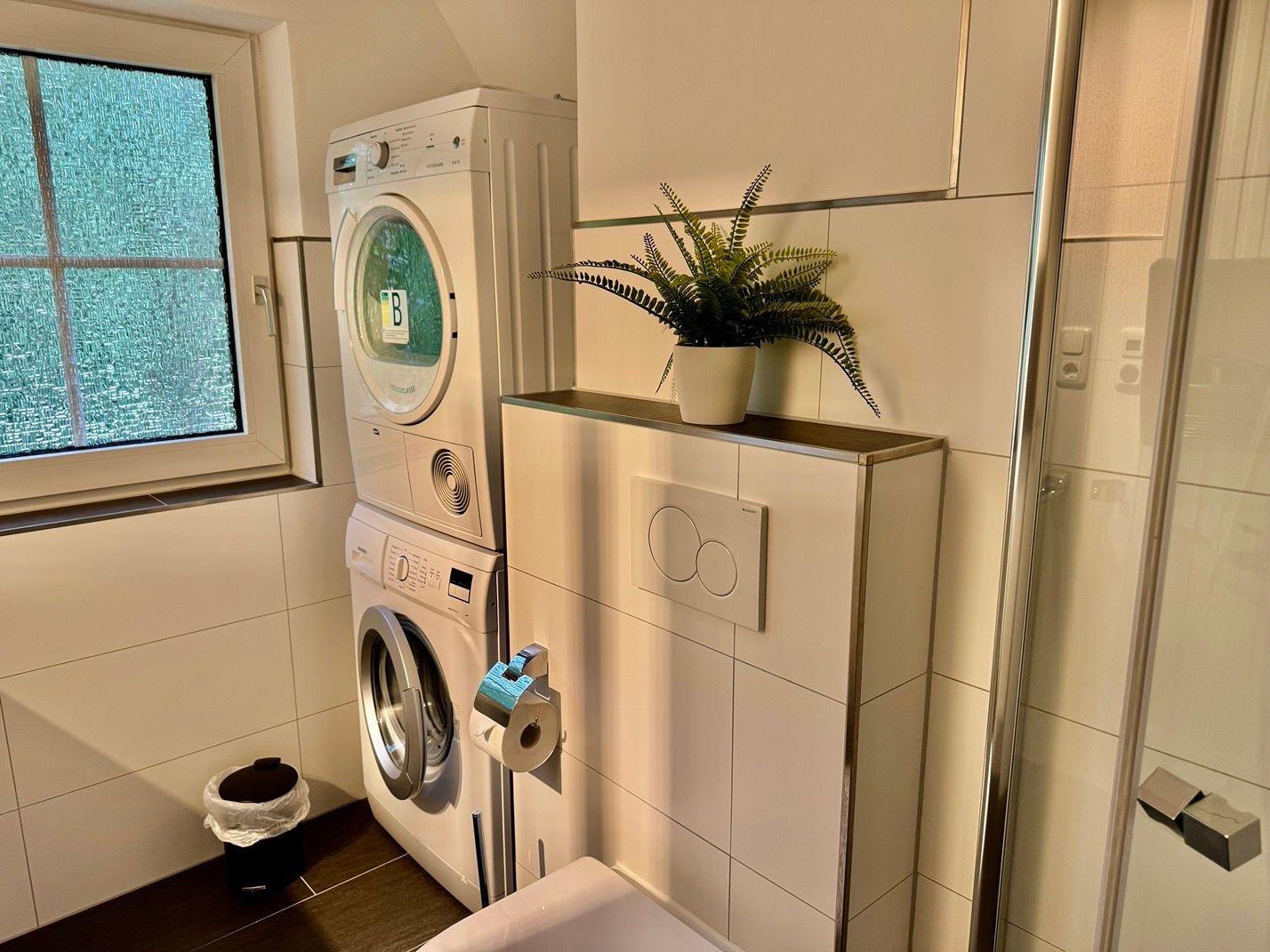 neues Badezimmer mit Dusche, Waschmaschine und Trockner, Abstellraum.