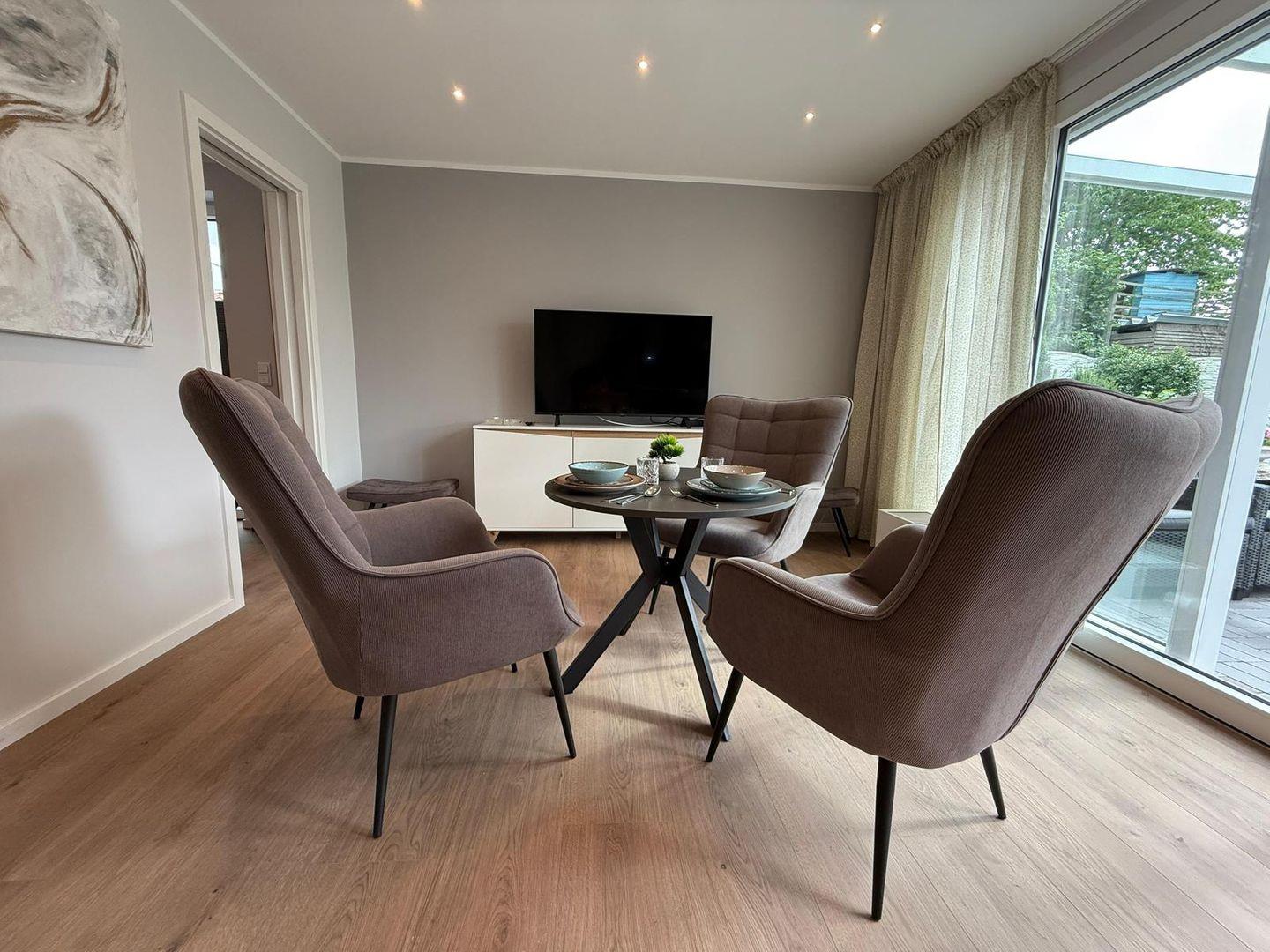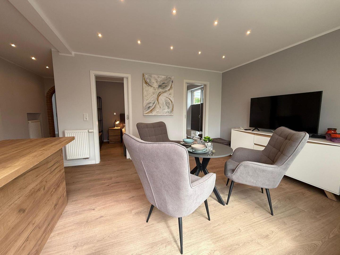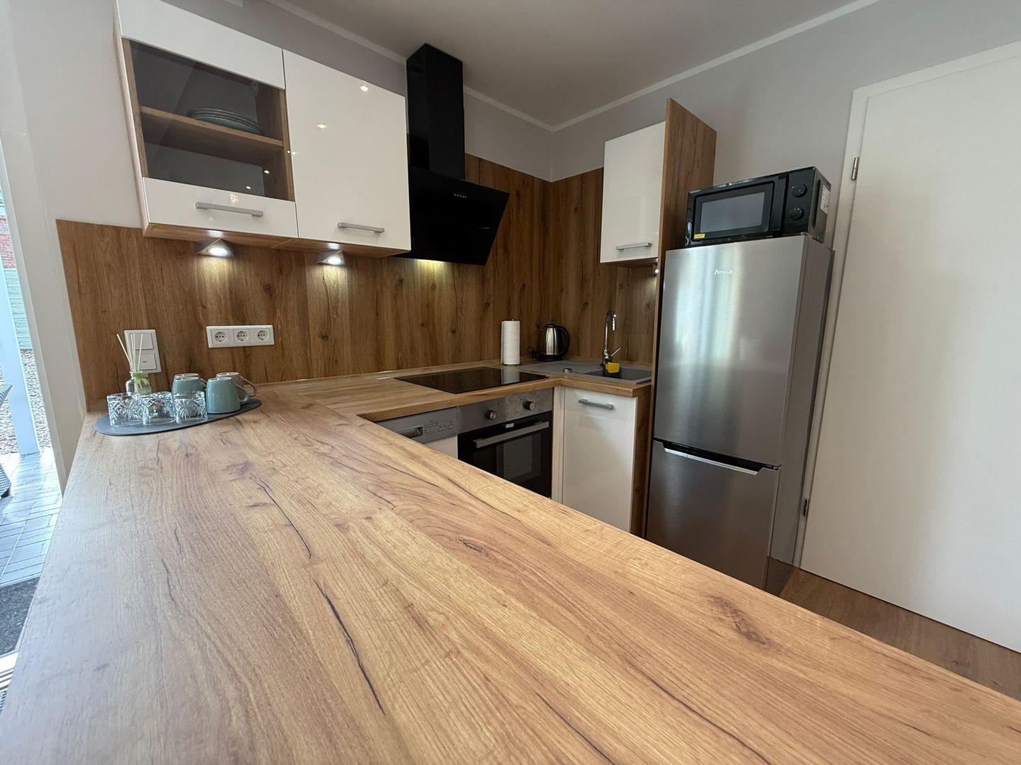 Das Apartment überzeugt durch seine offene Raumgestaltung: Die Küche öffnet sich zum Wohnbereich und ist mit hochwertigen Geräten und umfangreicher Ausstattung versehen. Hierzu gehören ein Ceranherd, ein Elektrobackofen, eine Mikrowelle, ein Kühlschrank mit integriertem Gefrierfach, eine Spülmaschine sowie zahlreiche Küchenutensilien, Geschirr und Besteck. Ein Wasserkocher, Toaster und eine Kaffeemaschine stehen für Ihr tägliches Frühstück und entspannte Abende bereit. Zum gemeinsamen Speisen lädt der großzügige Essbereich ein.