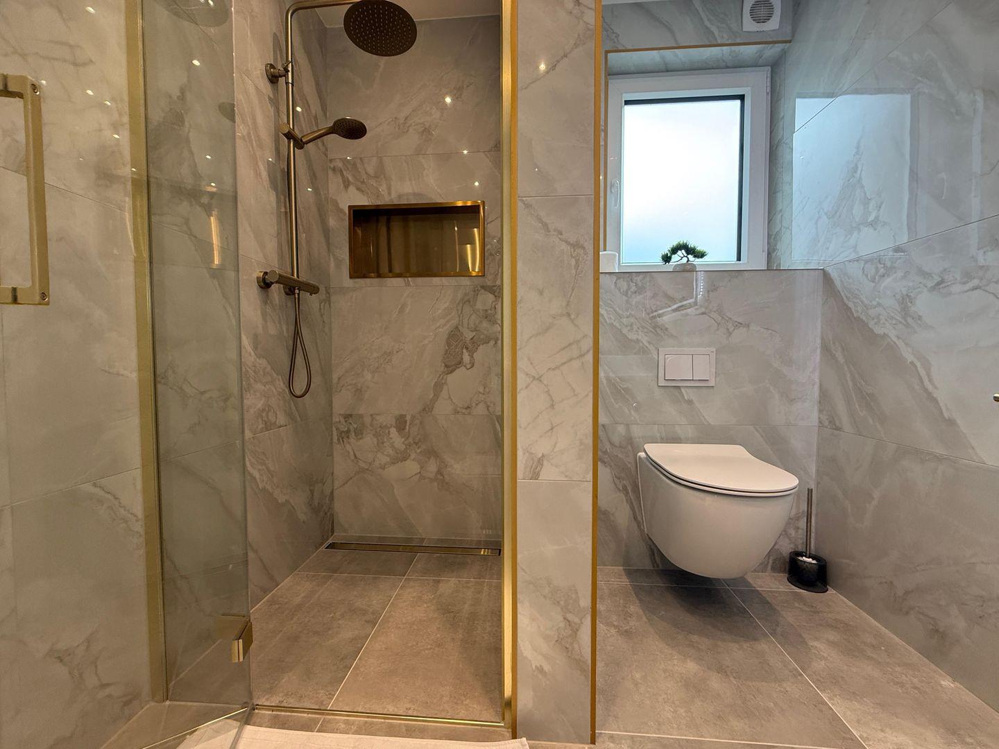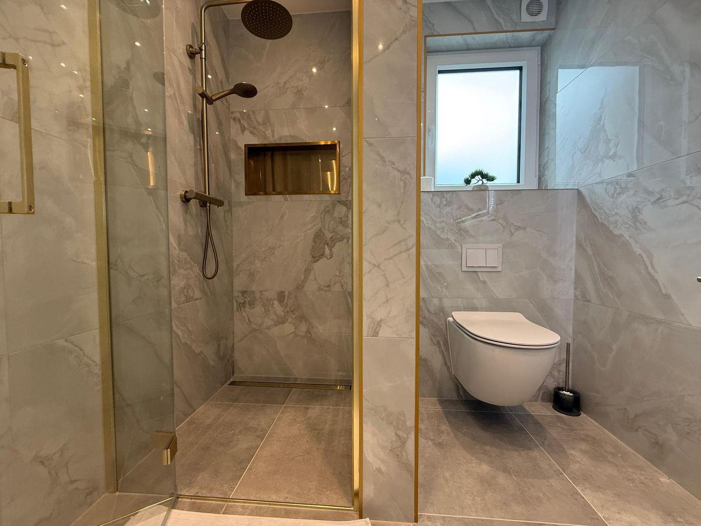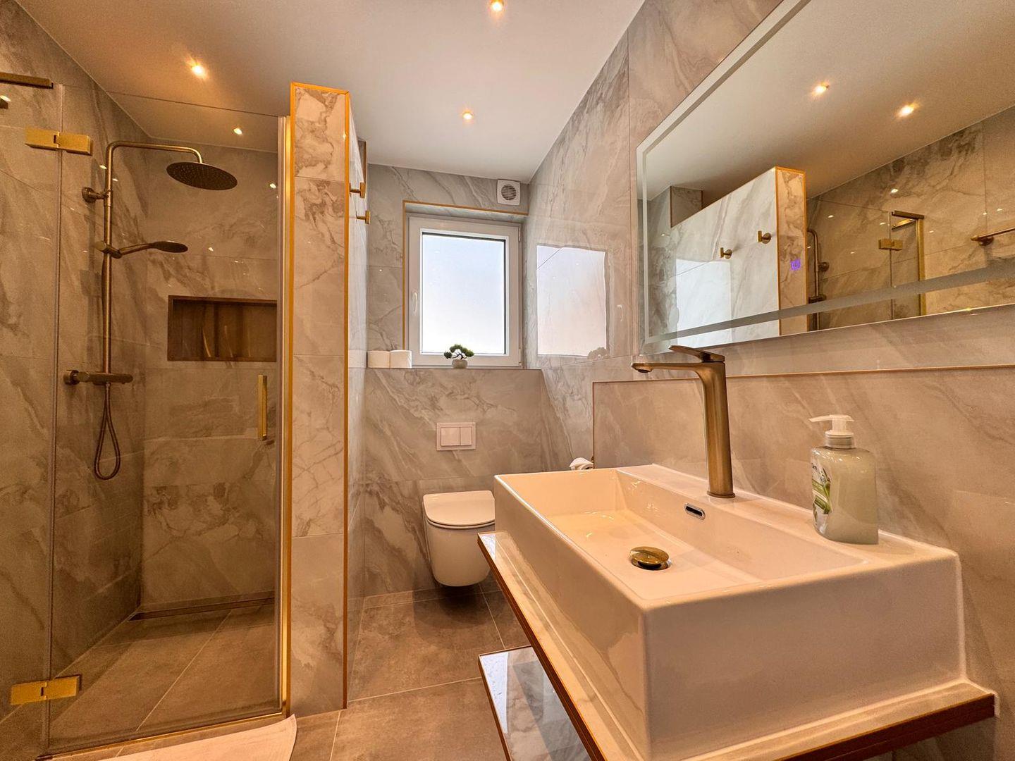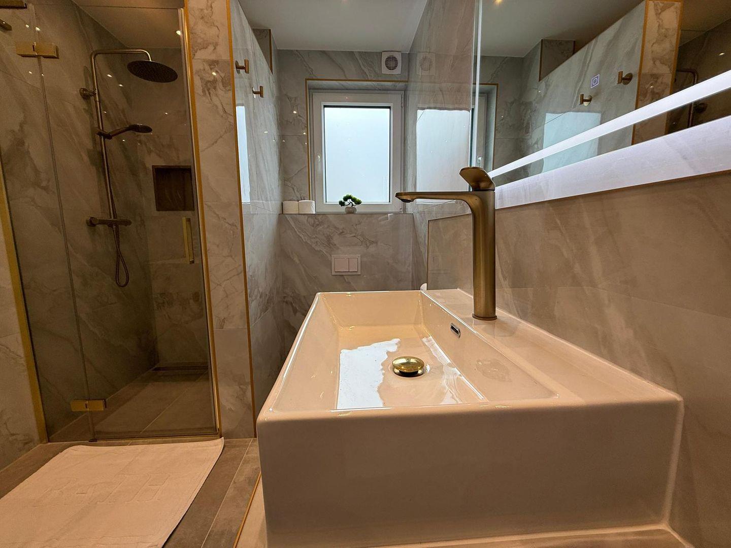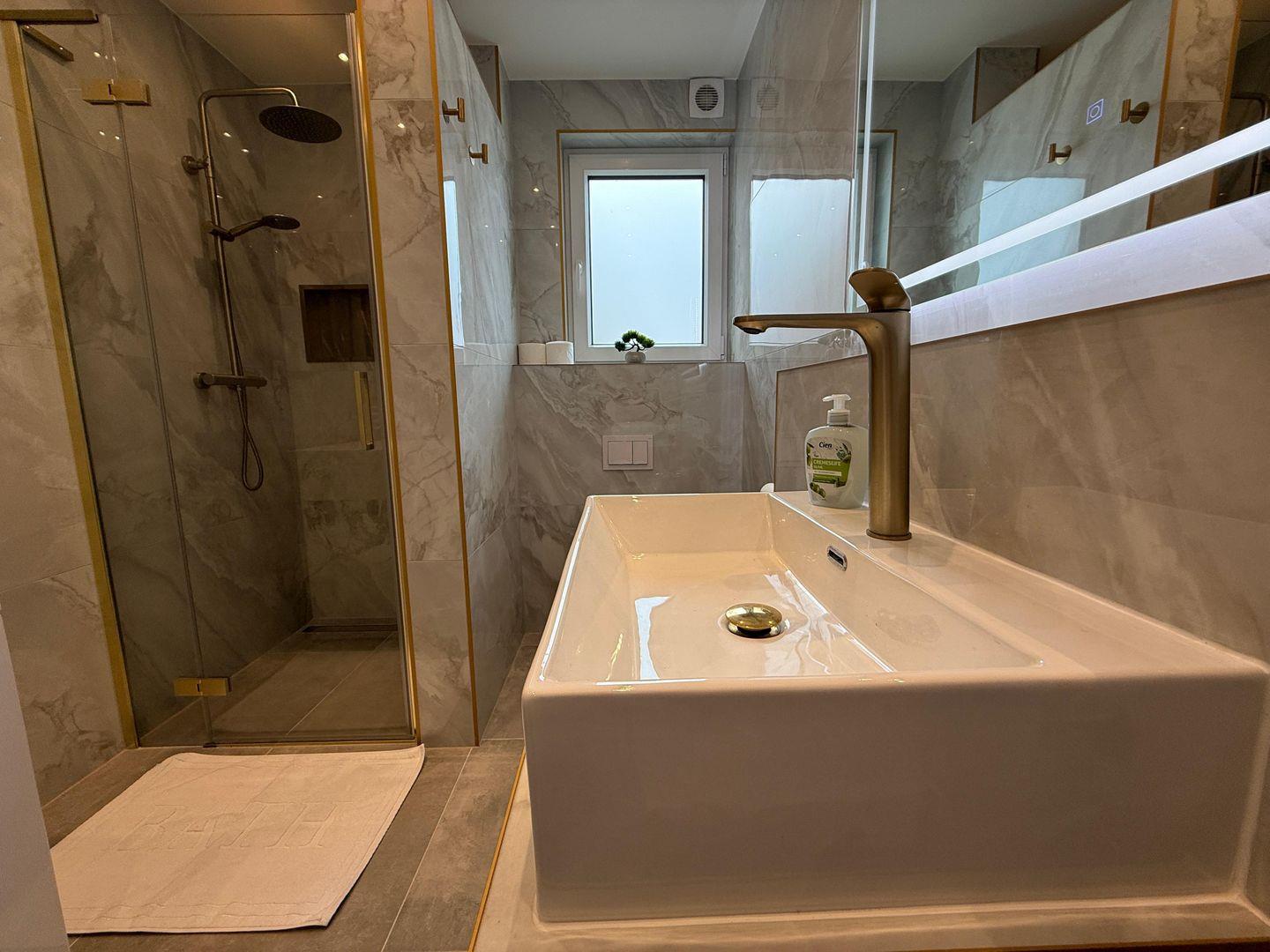 Das Badezimmer bietet eine bodengleiche Dusche, Waschbecken, Spiegel und Fenster für Tageslicht. Warmes Wasser ist selbstverständlich vorhanden.