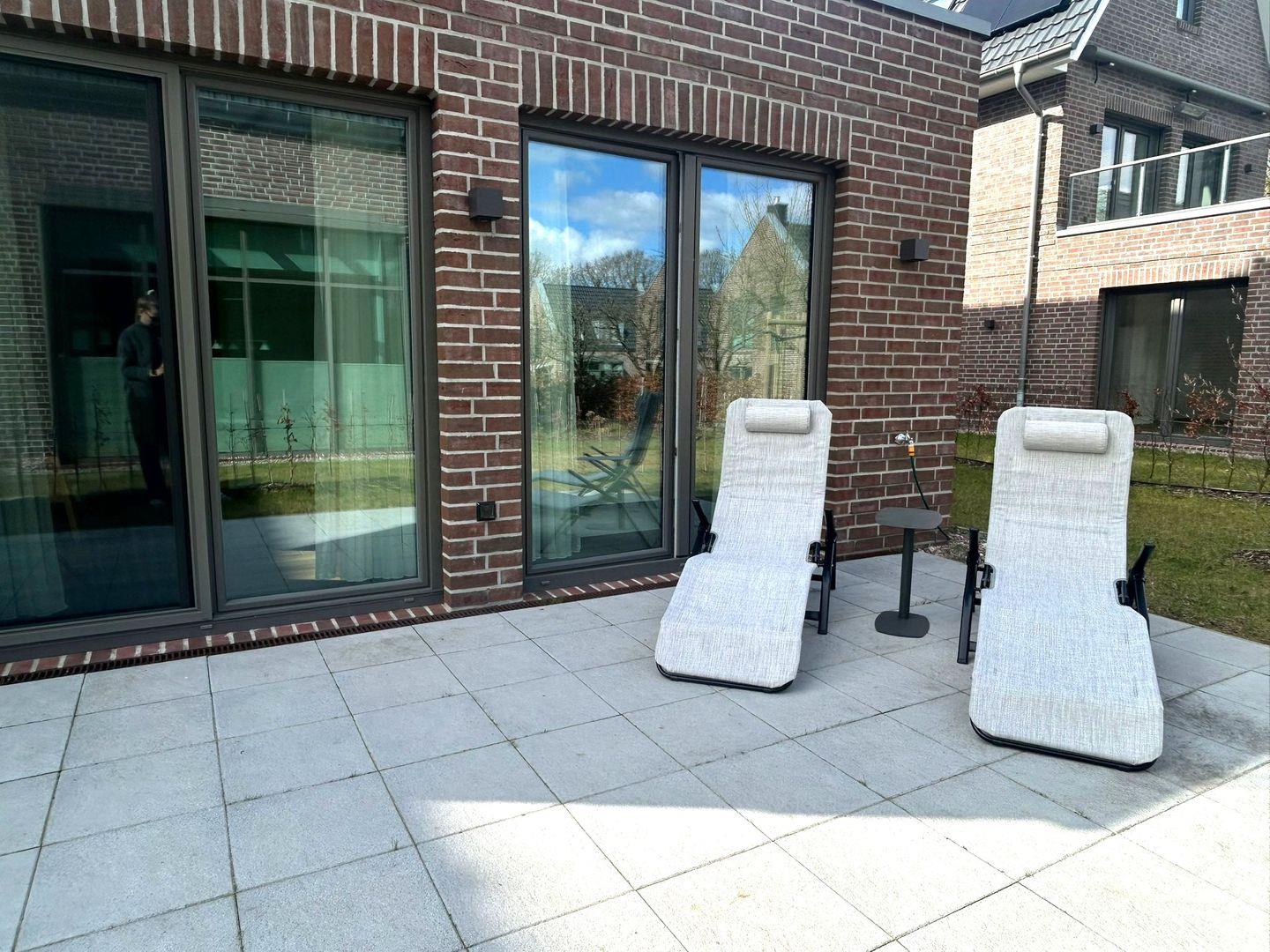 Ausstattung Außen: Balkon mit Gartenmöbeln und Gasgrill, Terrasse mit 2 Gartenliegen und Beistelltisch