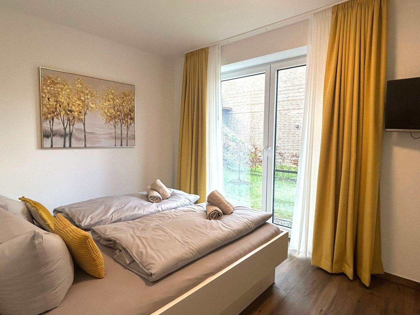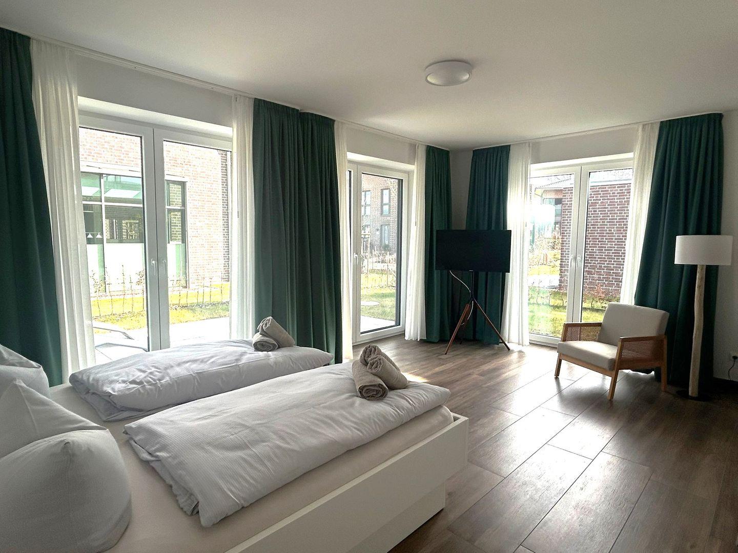 Schlafzimmer 2 UG: Doppelbett (2 einzelne Matratzen à 90x200 cm), Nachttische, Leselampen, Kleiderschrank, Smart-TV, Verdunklungsmöglichkeit durch Vorhang