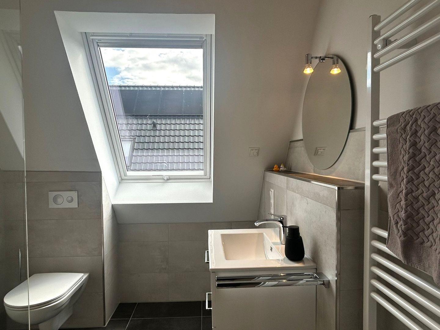 Duschbad im OG: bodentiefe, barrierefreie Regendusche, Waschtischanlage mit Spiegel, WC, Handtuchheizung, Haartrockner