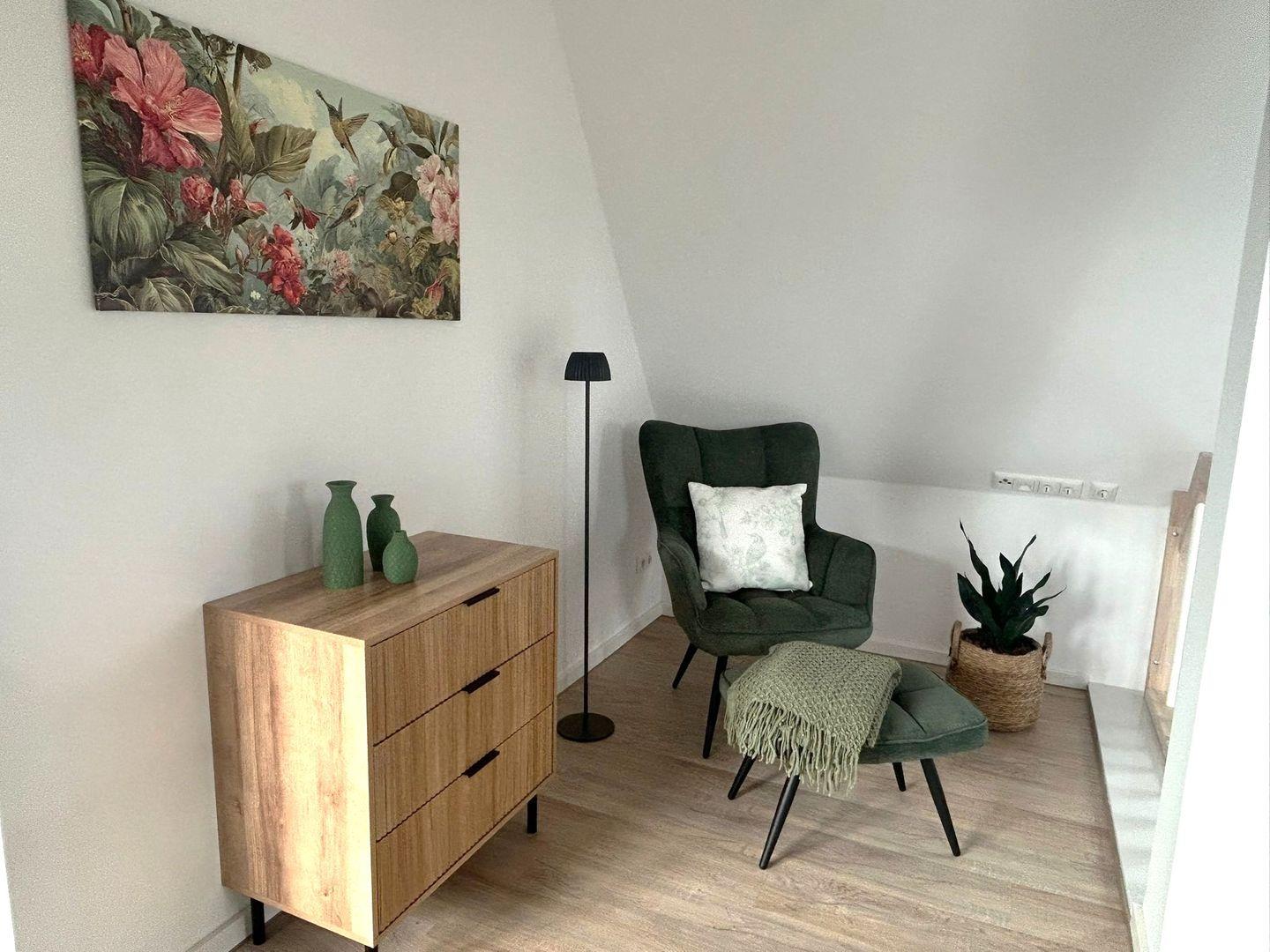 Der Wohnbereich ist offen und freundlich gestaltet. Eine Sofaecke, ein Essbereich sowie die zum Wohnzimmer offene Küche schaffen einen angenehmen Mittelpunkt für gemeinsame Stunden. Für Unterhaltung und Komfort stehen Ihnen WLAN, 3 TVs, Bücher und Spiele zur Verfügung. Fliesenböden in Wohn- und Schlafbereichen sowie Fußbodenheizung und Wärmepumpe sorgen für ein zeitgemäßes Wohngefühl.
