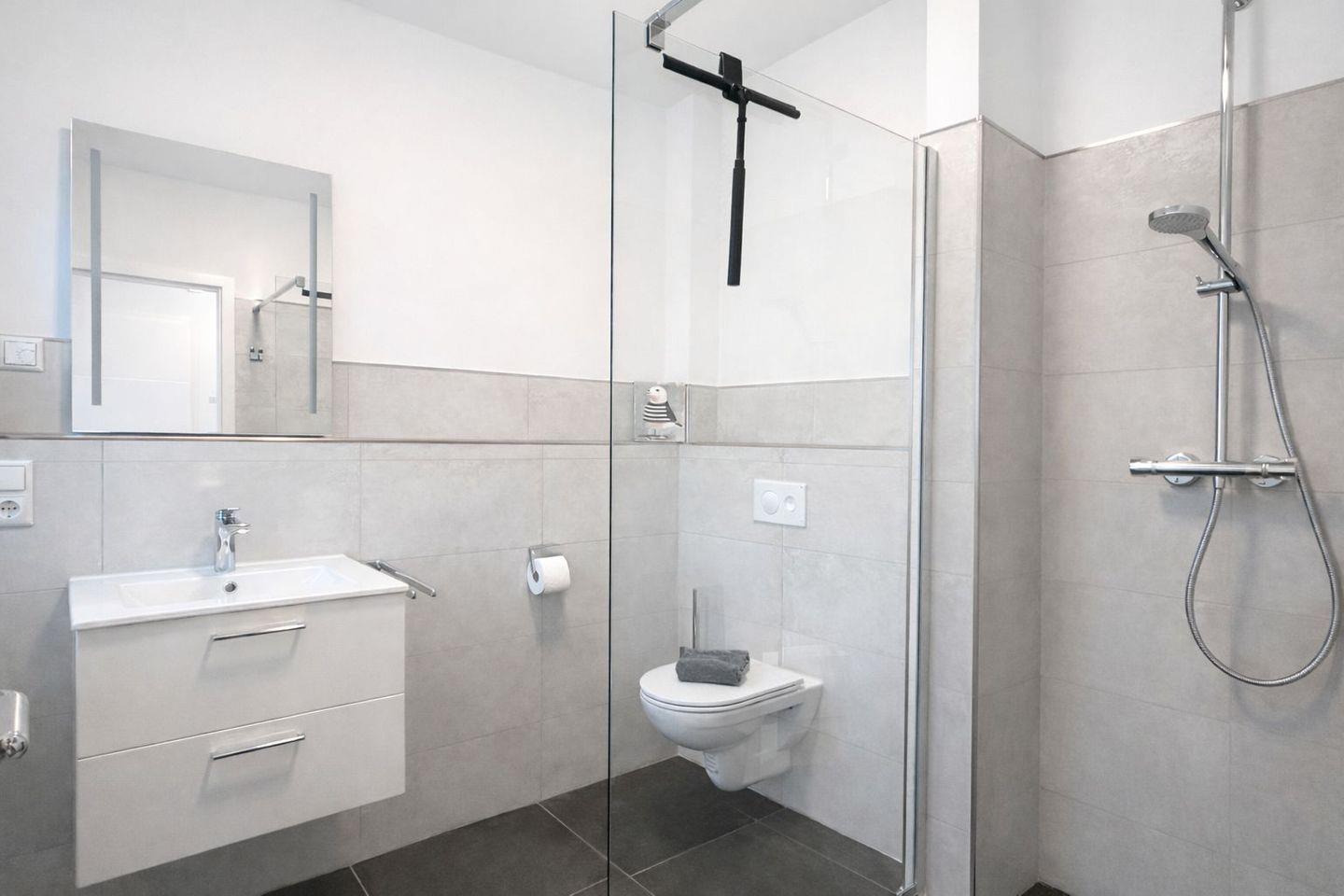 Duschbad im UG: bodentiefe, barrierefreie Regendusche, Waschtischanlage mit Spiegel, WC, Handtuchheizung, Haartrockner