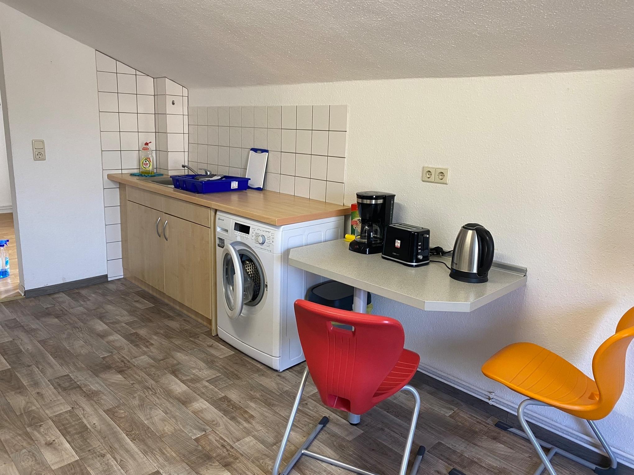 Im Dachgeschoss befindet sich eine vollausgestattete Gemeinschaftsküche mit Waschmaschine (+ Wäscheständer und Bügeleisen) und ein Wohn- Esszimmer mit gemütlichem Sofa und TV.