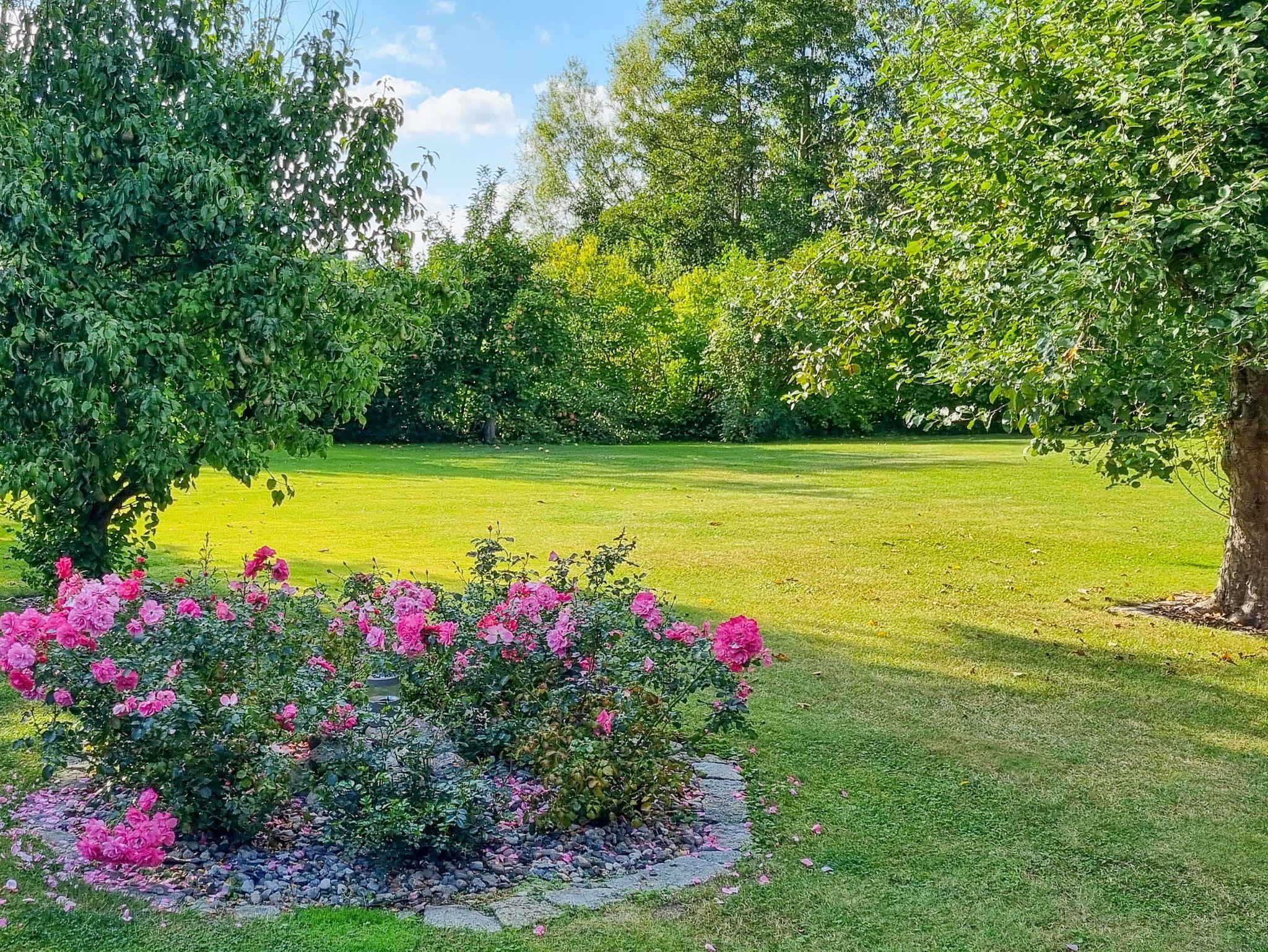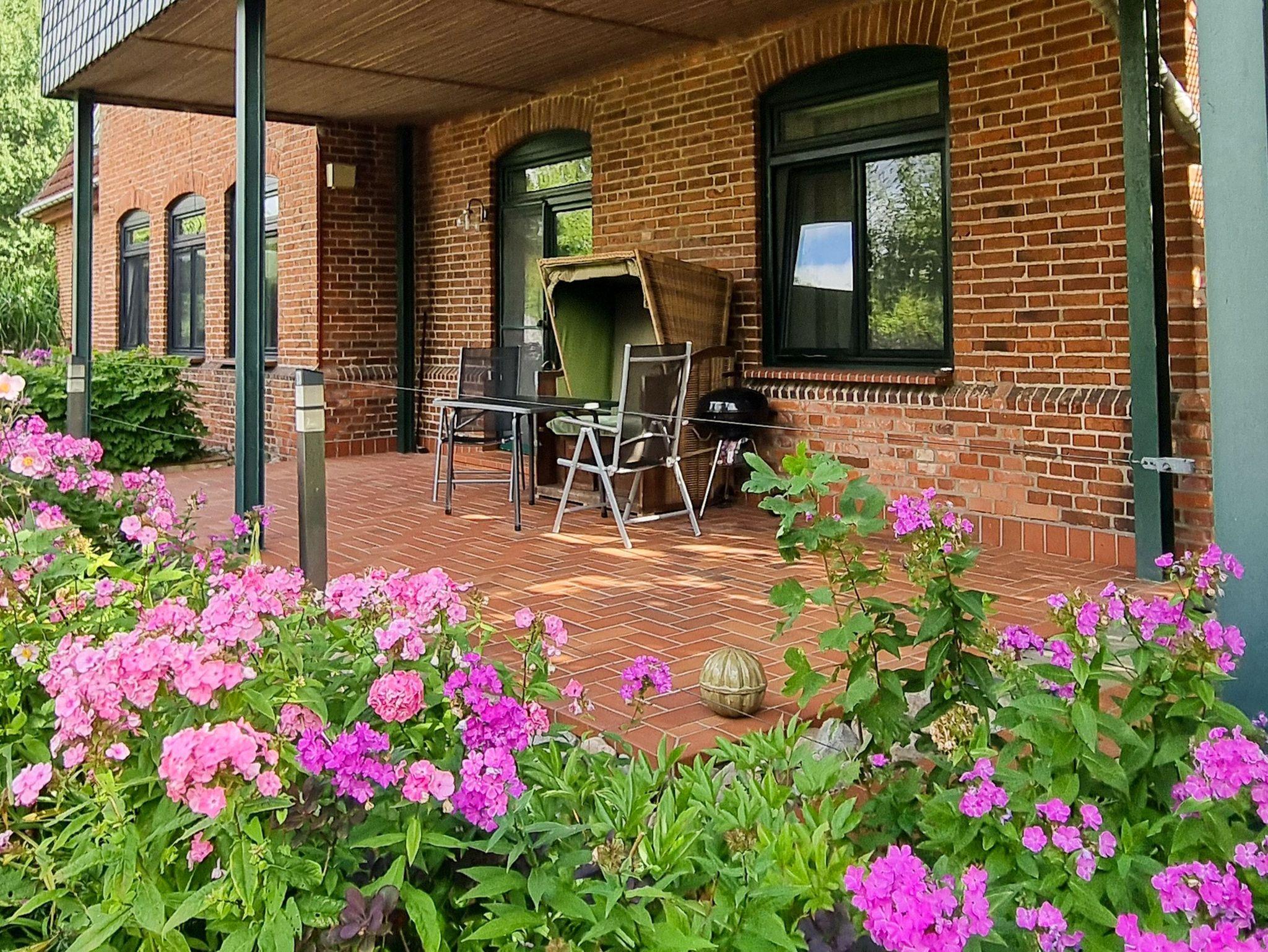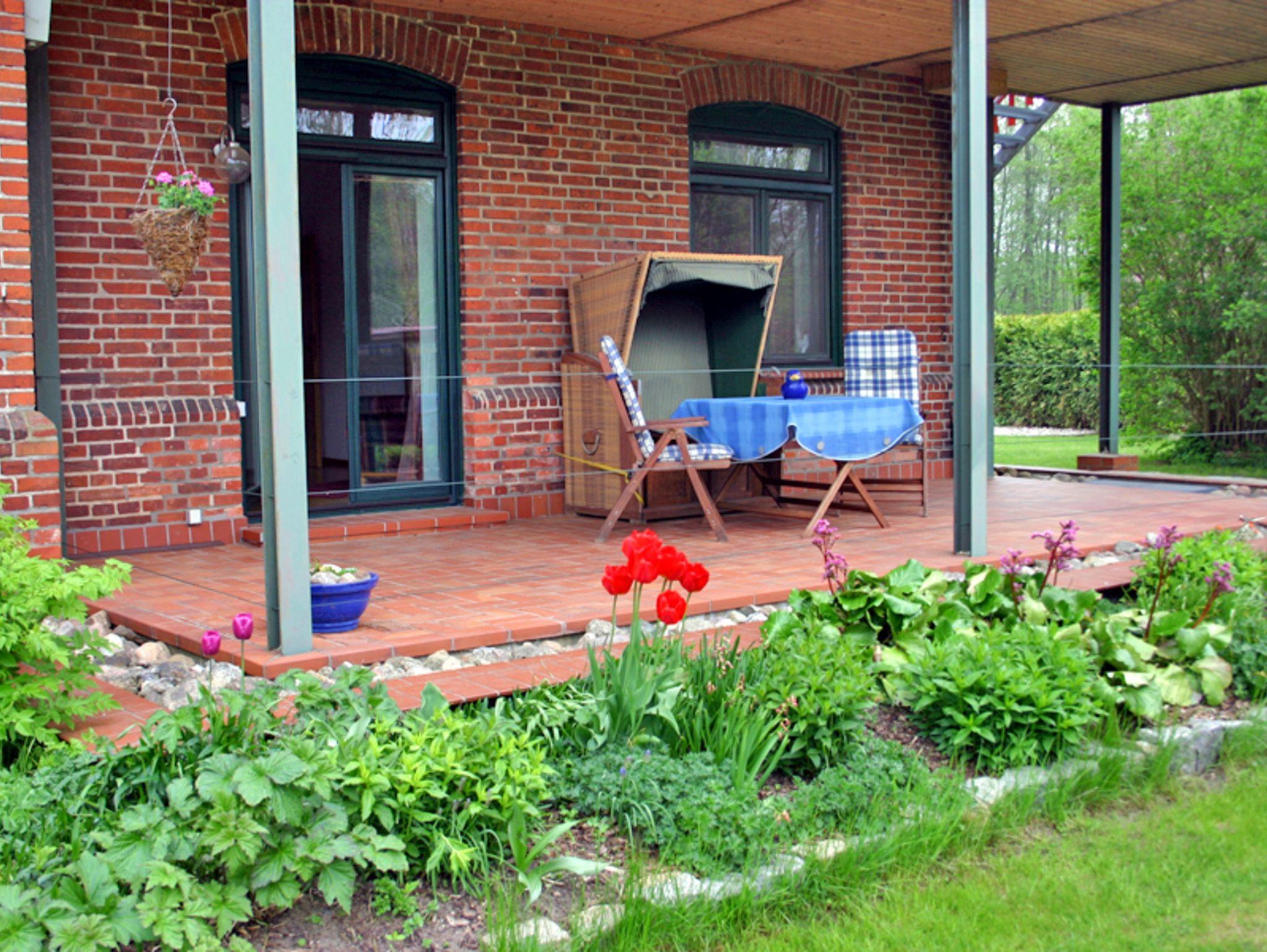 Von der Terrasse hat man einen schönen Ausblick in den Garten. Sie ist sehr schön groß und ist mit einem Strandkorb und Holzmöbel sowie einem Grill ausgestattet.