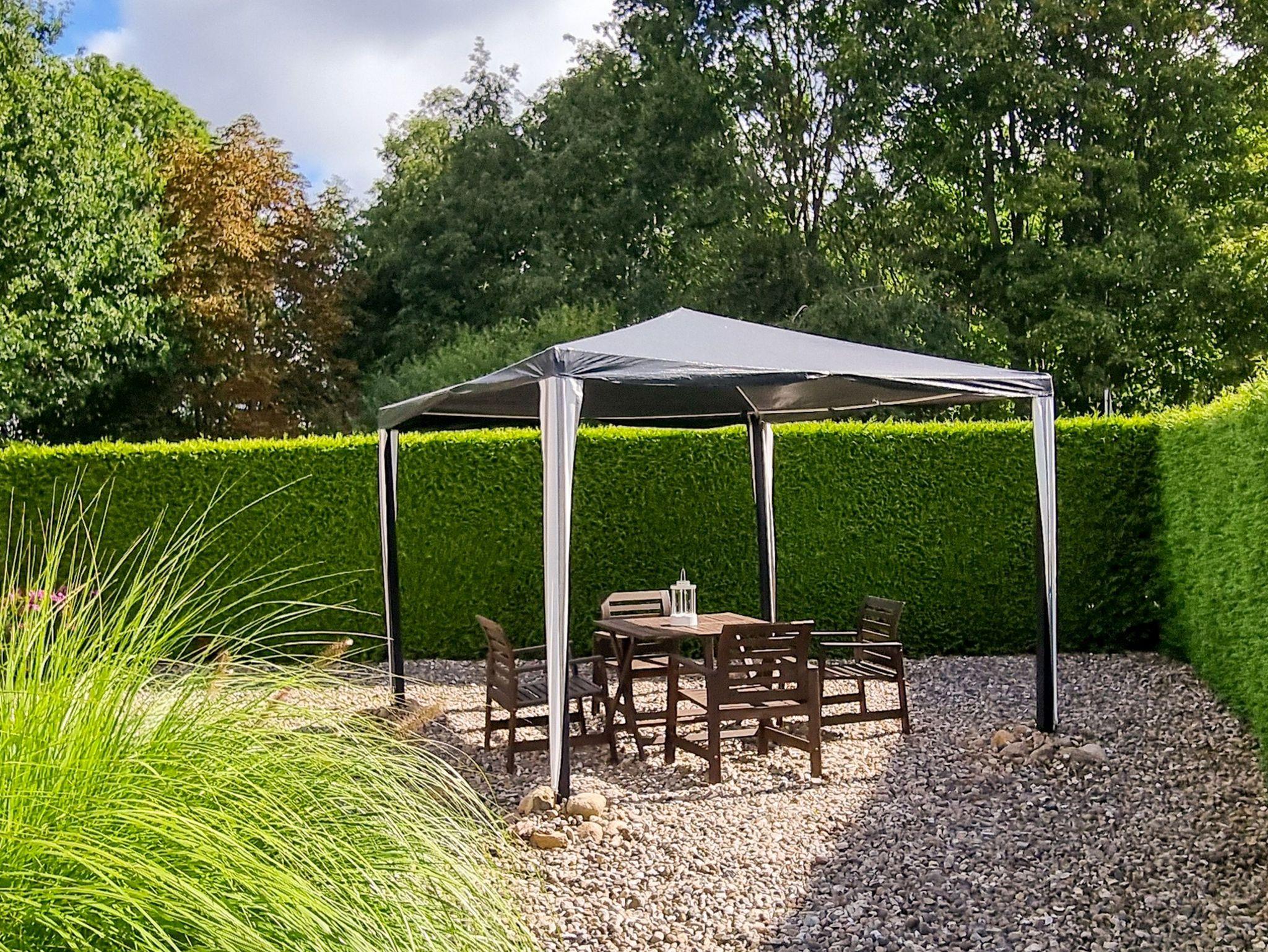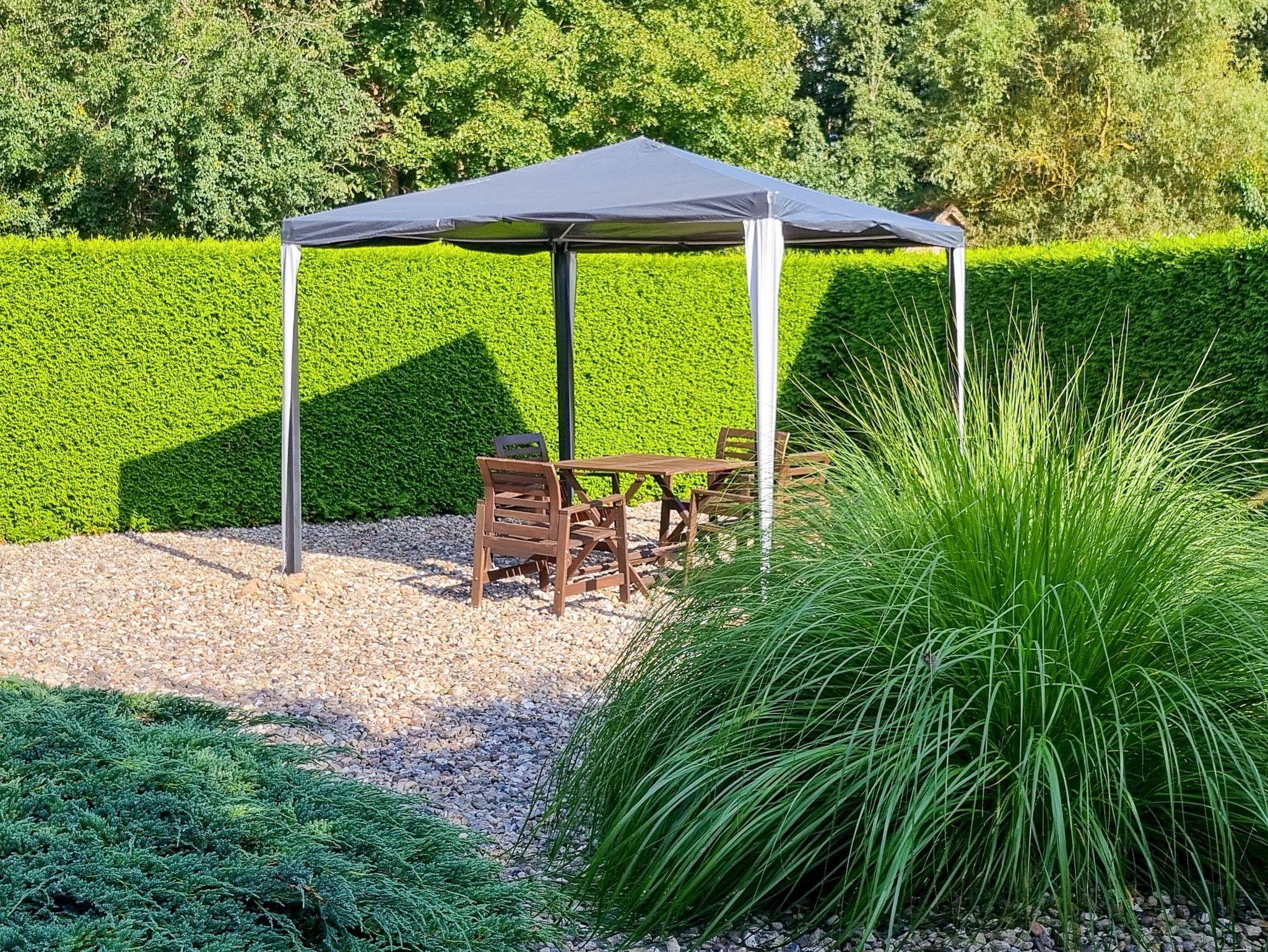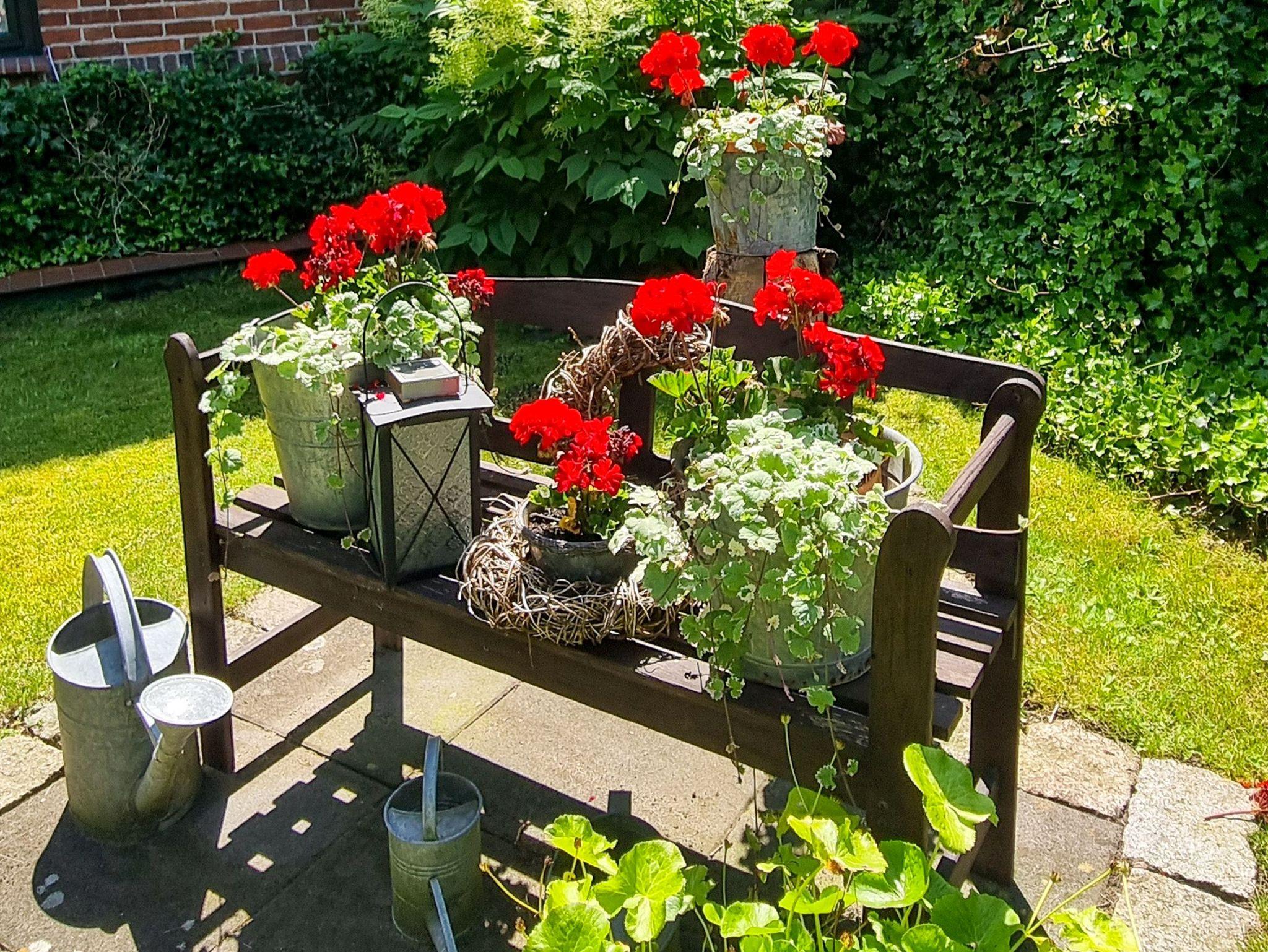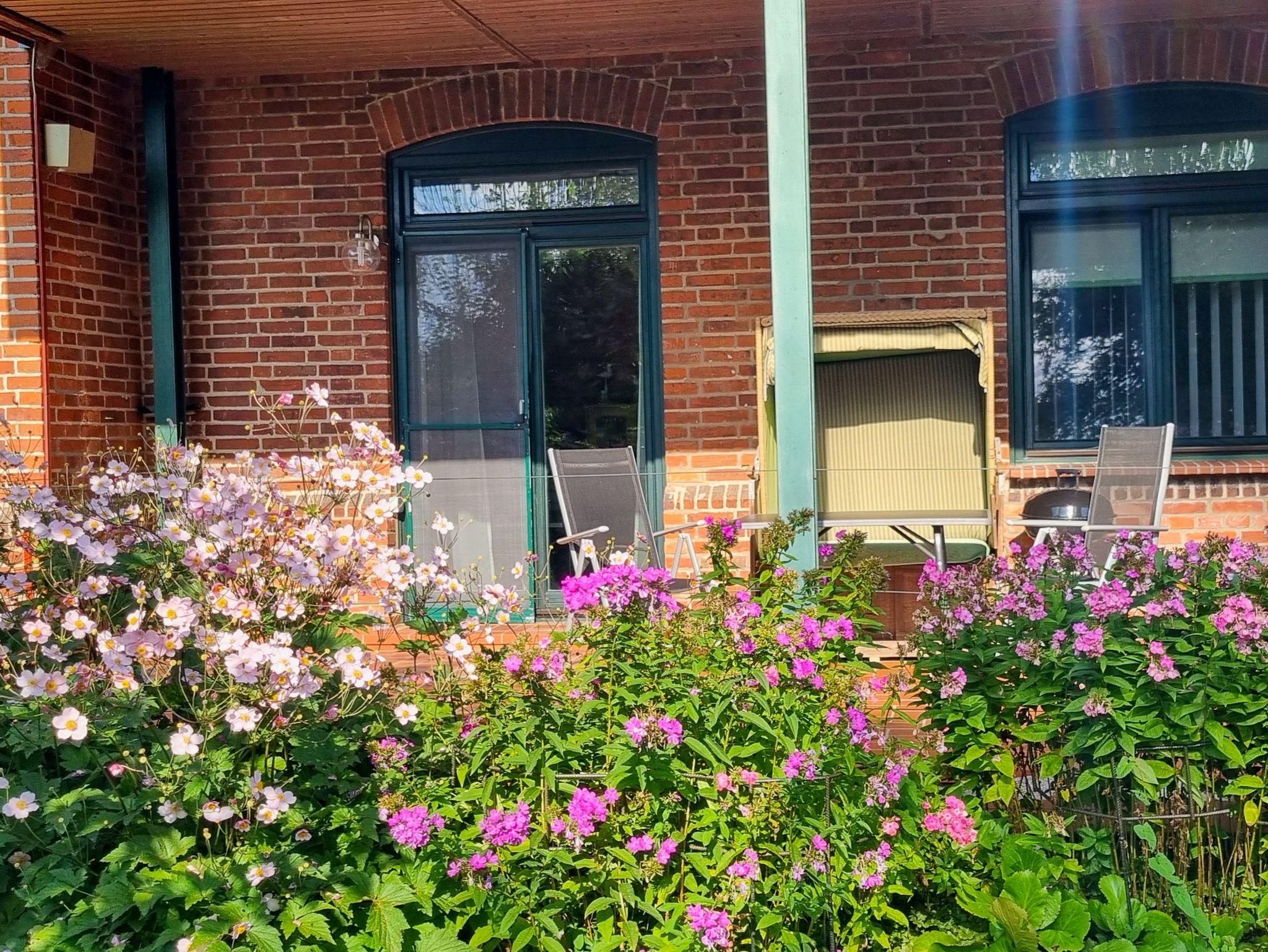 Von der Terrasse hat man einen schönen Ausblick in den Garten. Sie ist sehr schön groß und ist mit einem Strandkorb und Holzmöbel sowie einem Grill ausgestattet.