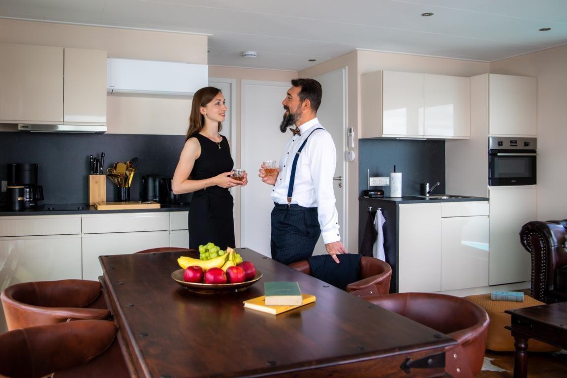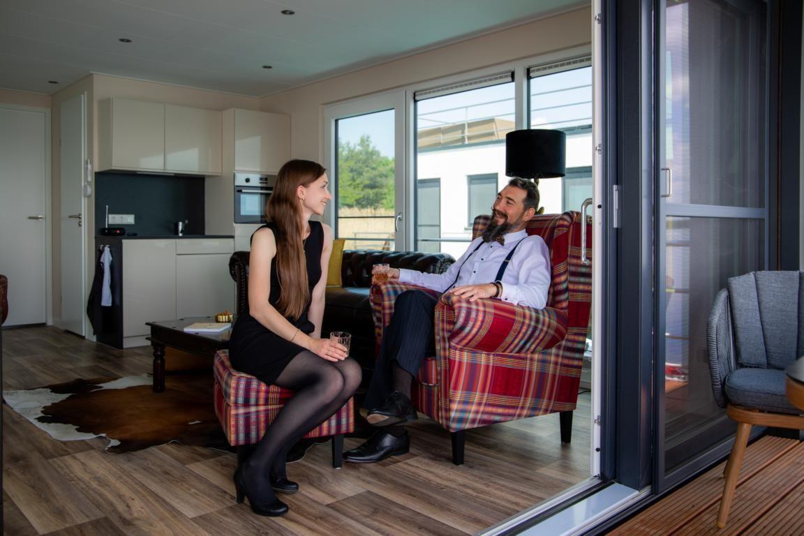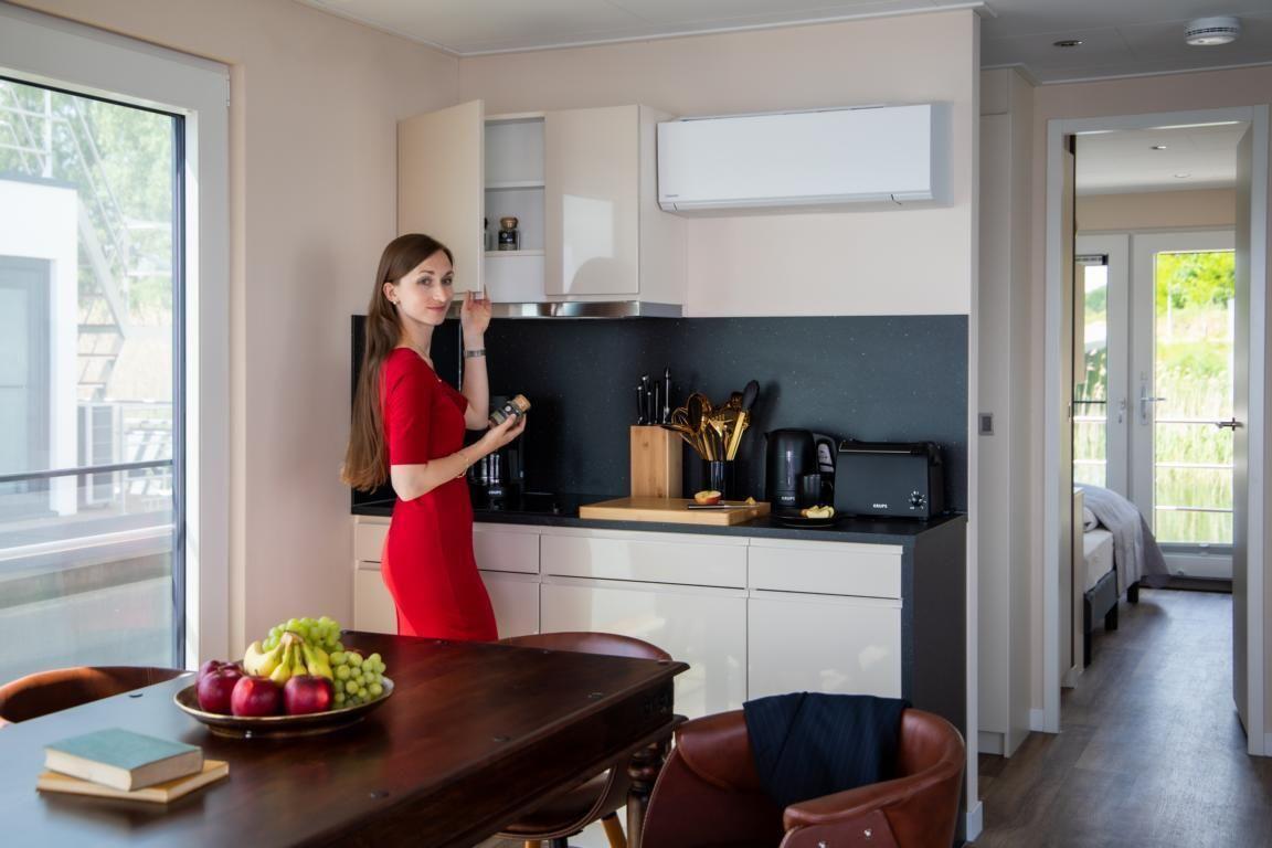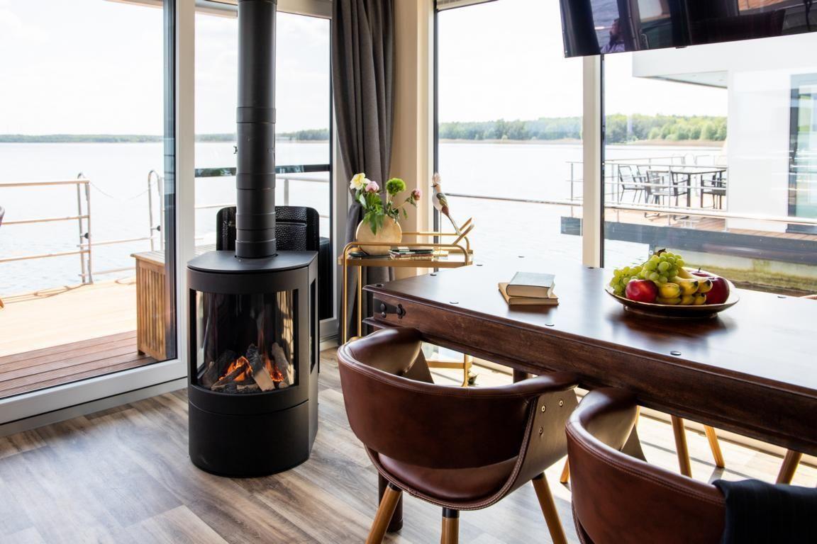 Floatinghouse Queen: freistehendes, klimatisiertes 44 m² Floatinghouse auf dem Wasser mit Seeblick und Landschaftsblick. 3 Zimmer, 2 Schlafzimmer, 1 Bad, für bis zu 4 Personen – kinderfreundlich und Nichtraucher. Offene Küche zum Wohnzimmer mit Ceranherd, Spülmaschine und kompletter Ausstattung. Überdachte Terrasse mit Gartenmöbeln, Sonnenliegen und Elektrogrill; WLAN, TV/Radio sowie Gaskamin.