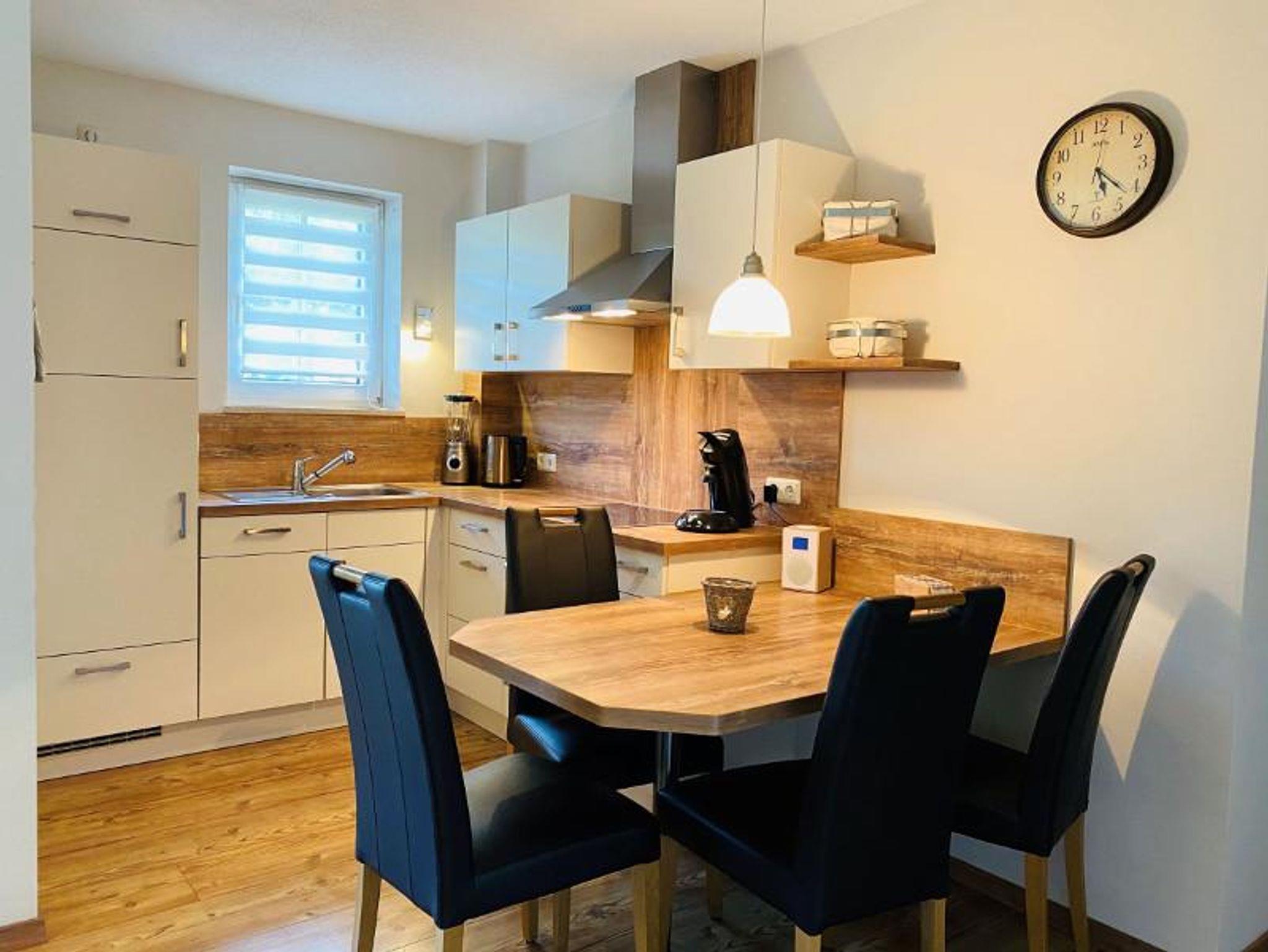 Der gemütliche Wohn-/Essbereich besteht aus einer modernen Einbauküche mit Spülmaschine, Tiefkühlschrank und Umluftherd, viele weitere Geräte sind vorhanden: Microwelle, Toaster, Eierkocher, Handmixer, Standmixer, Wasserkocher, Senseo-Padmaschine sowie ein DAB-Radio mit Bluetooth.