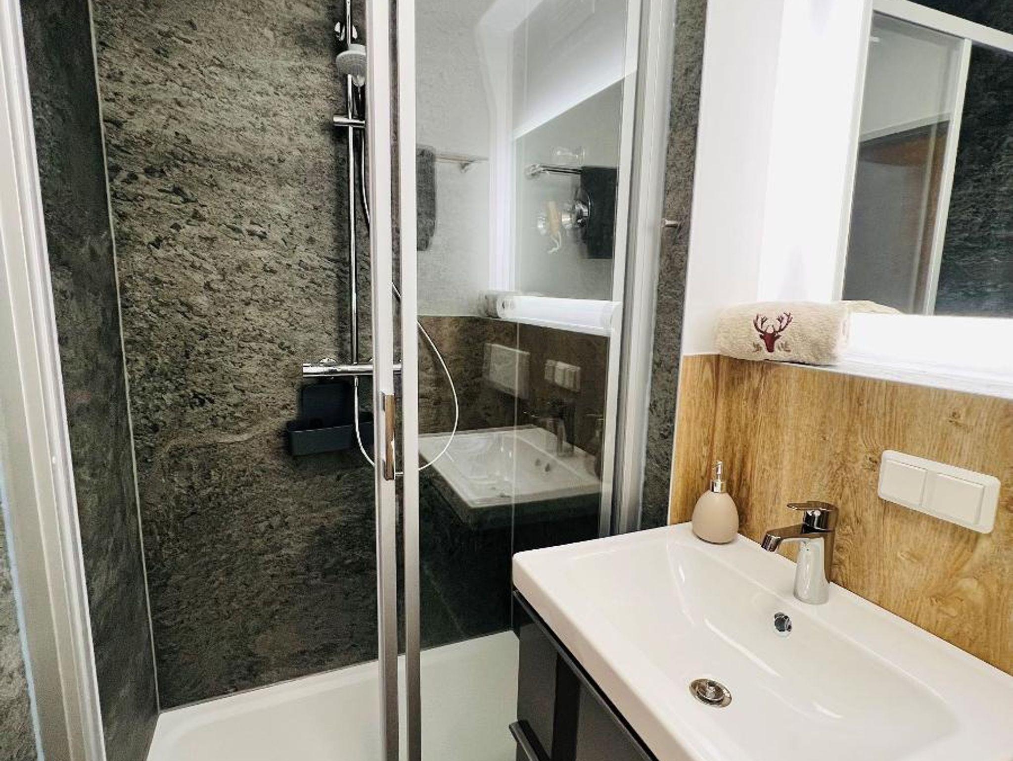 Das renovierte Badezimmer ist mit Regendusche und Thermostatbatterie ausgestattet. Es verfügt über einen großen Wandspiegel mit Schminkspiegel und einem Fön. Das in der Wand integrierte Radio rundet den Badezimmeraufenthalt ab.