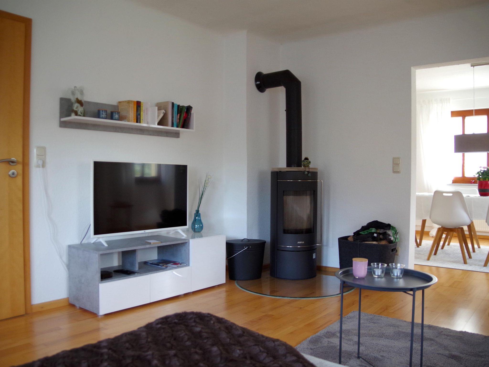Im Erdgeschoss befinden sich neben einer komplett ausgestatteten modernen Küche (EBK, Kühlschrank mit Gefrierfach, Kaffeemaschine, Nespresso-Maschine für Kapseln, Koch- und Essgeschirr), ein Esszimmer mit einem Tisch für 6 Personen, ein Wohnzimmer mit Bettcouch, Flat Screen sowie ein moderner Holzofen (Schnittholz gegen Entgelt). Im Eingangsbereich befindet sich außerdem eine Gästetoilette.