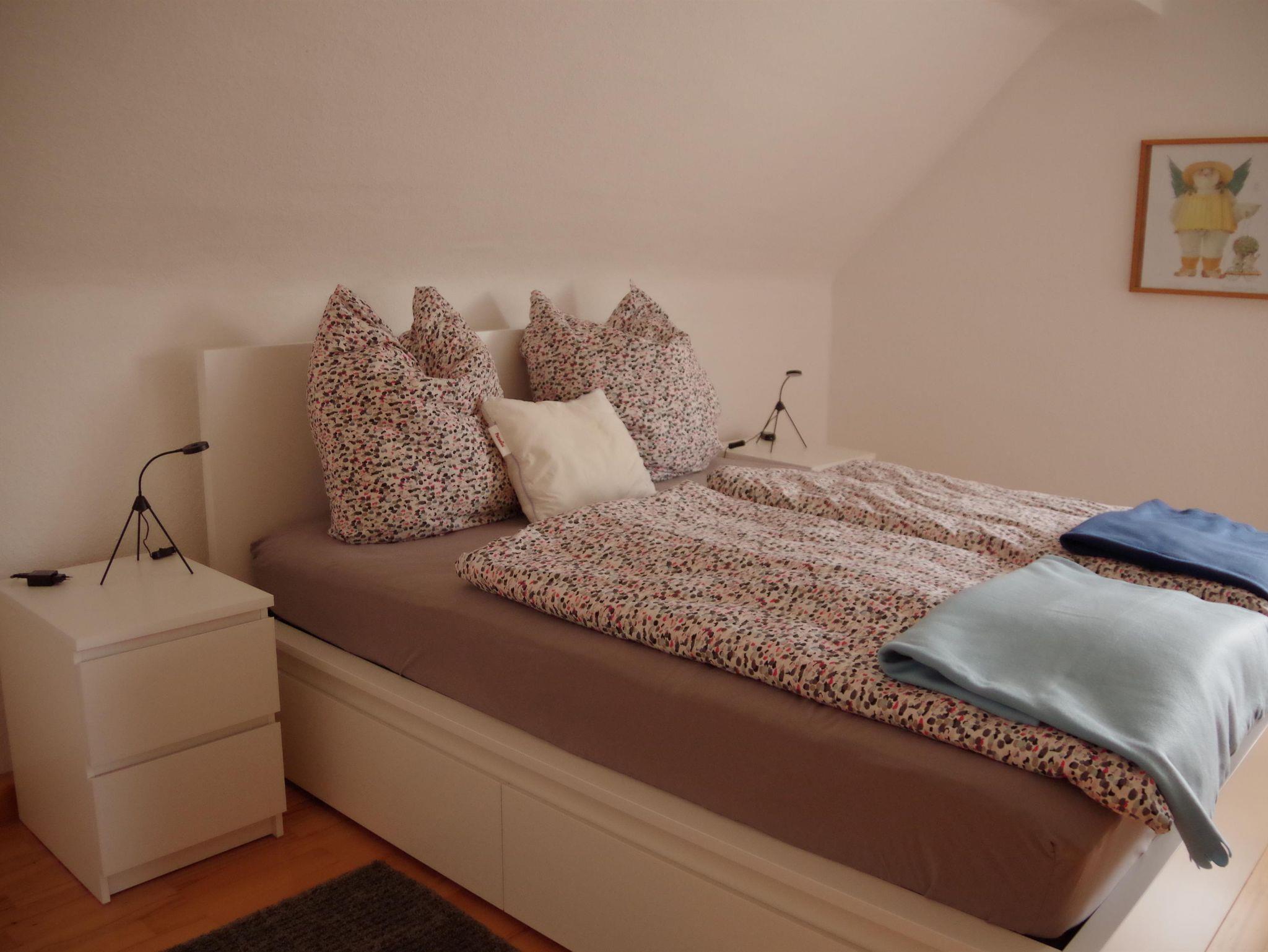 Zwei Schlafzimmer mit modernen Doppelbetten (2.00 x 1,80 m ohne Fußbrett) bieten Platz für vier Personen. Das angrenzende schöne neuwertige Bad mit Badewanne, Waschmaschine und Trockner komplettiert die Etage.
