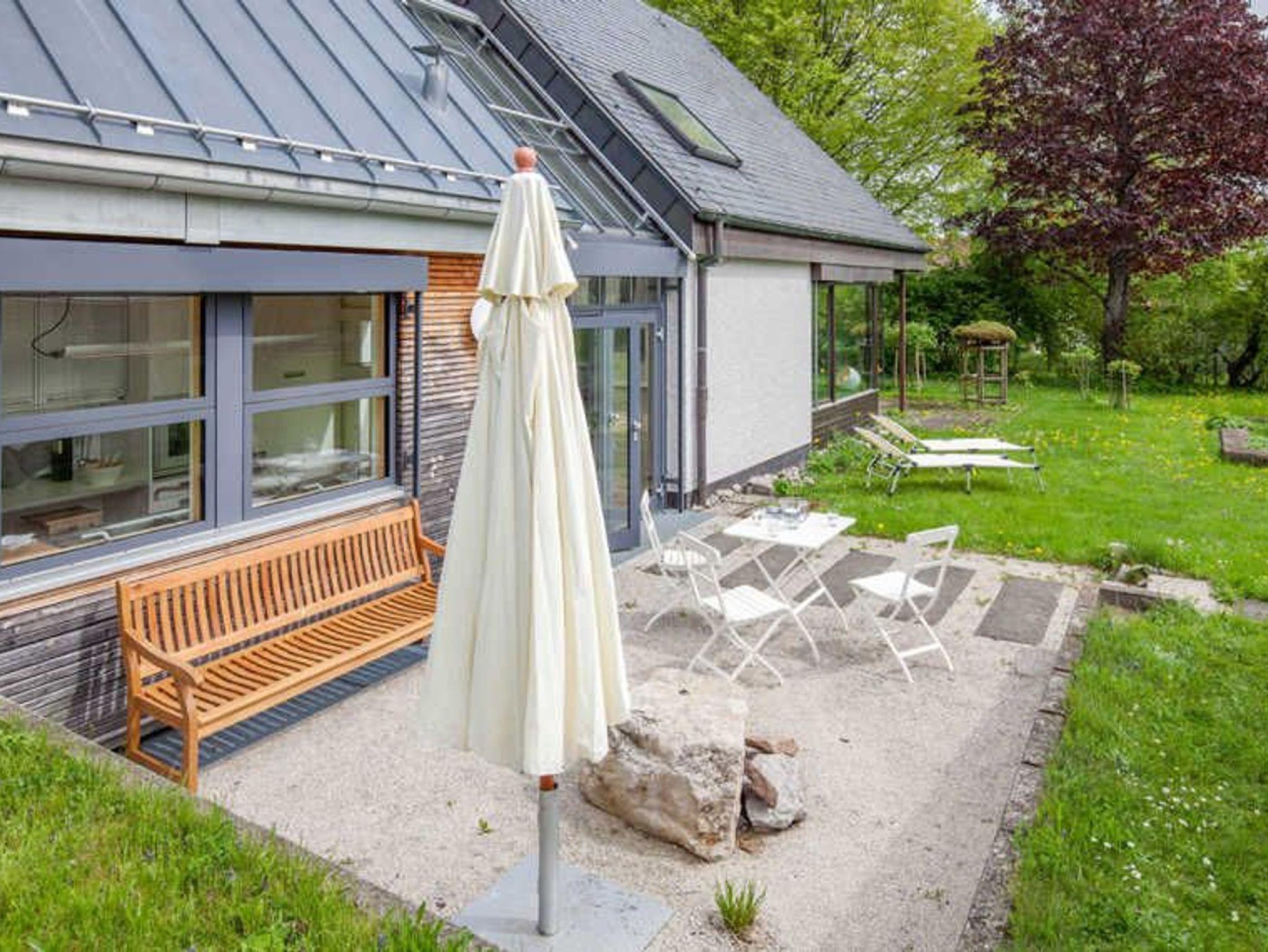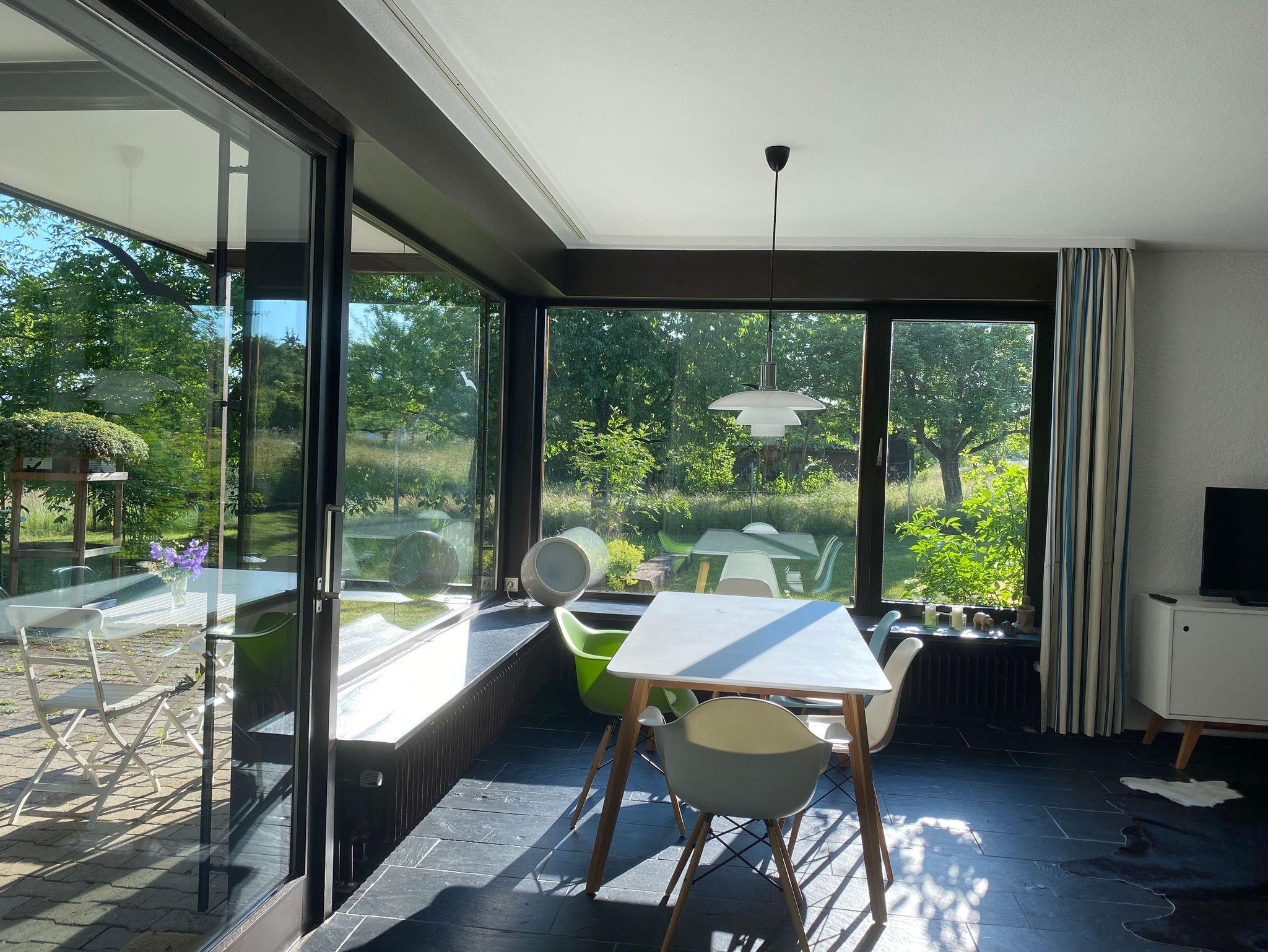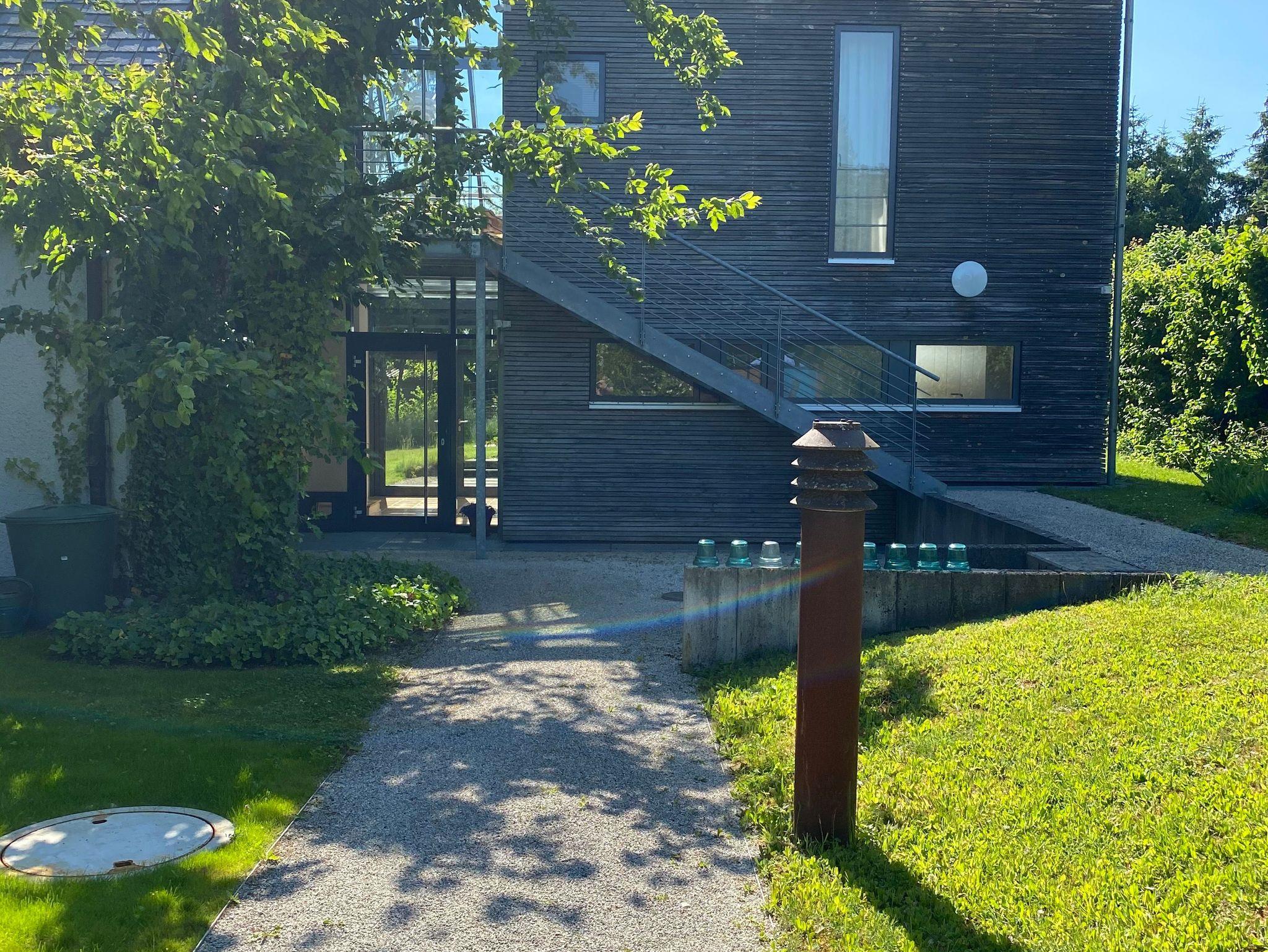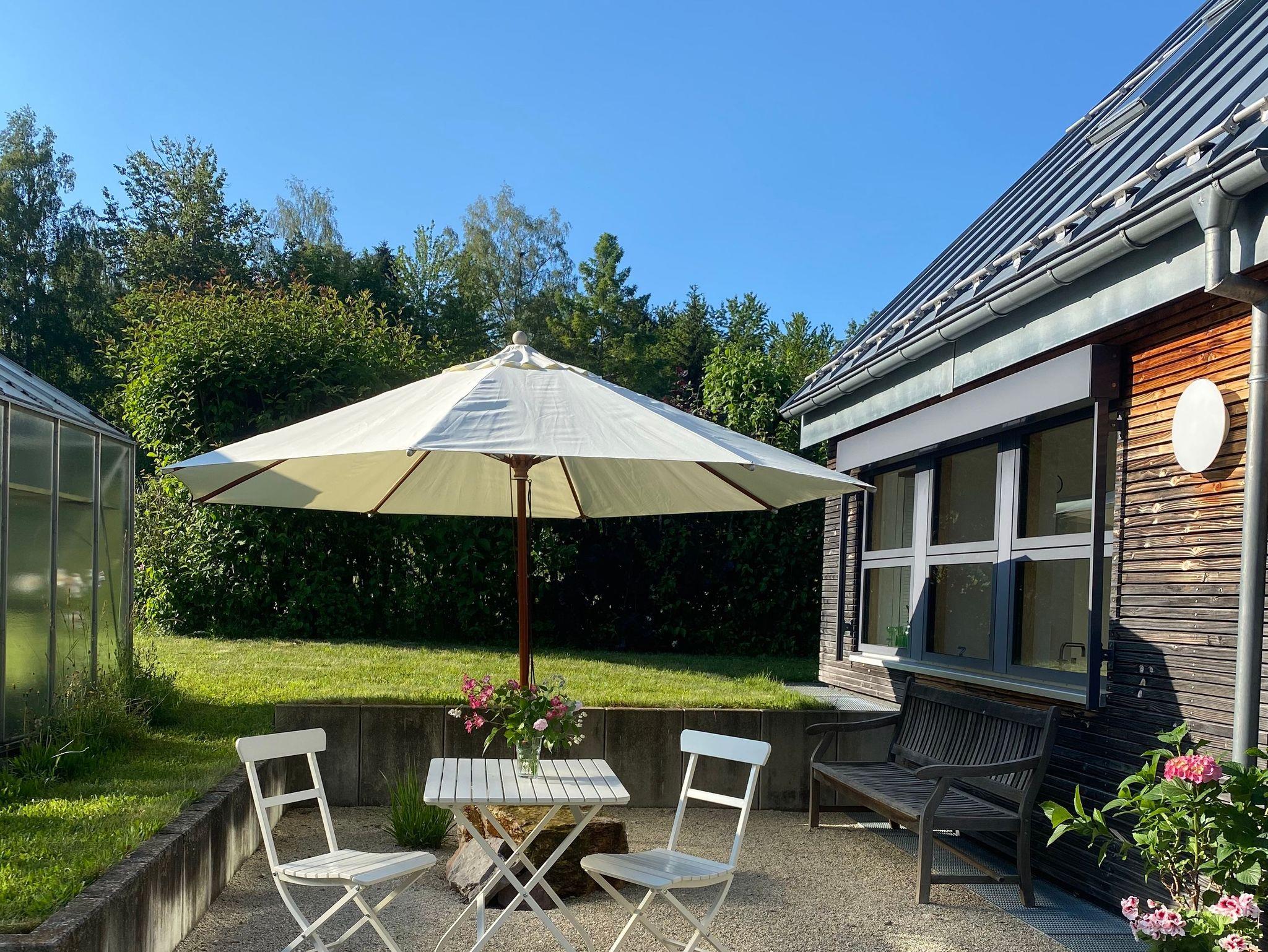 Das Feriendomizil liegt am Stadtrand von Schwenningen am Neckar in ruhiger Lage inmitten eines großen Garten, das Stadtzentrum ist ca. 1,5 km entfernt. Das Mietobjekt besitzt einen separaten Eingang, Carport für 1 Fahrzeug ist vorhanden, sowie ein nicht überdachter Stellplatz. Die Räumlichkeiten sind individuell, schlicht und hochwertig ausgestattet. Verarbeitet wurden für die Bodenbeläge Schiefer, Parkett sowie terra cotta- Fliesen, die meisten Räume sind mit Fußbodenheizung ausgestattet. Zur Verfügung stehen auf 2 Etagen mit 140 qm für 2 bis 5 Personen ein großzügiger Wohnbereich mit Aussicht in die Natur, Balkon und Terrasse, sowie ein Gartenbereich, insgesamt 3 Schlafräume (2 Doppelzimmer und1 Einzelzimmer), eine vollausgestattete Küche, 2 Bäder, separates Gäste- WC, Garderobe, Wasch- Stauraum. Eingangsbereich EG: Eingangsbereich EG mit Garderobe und Regalfächer sowie ein Ganzkörperspiegel, direkter Durchgang zur Außenterrasse. Badezimmer EG mit separatem WC: begehbare Dusche mit Glasduschwand, großer Waschtisch mit Spiegel und Ablagemöglichkeiten. Das separate Gäste-WC liegt nebenan, beide Räume verfügen über Außenfenster. Hauswirtschaftsraum/ Stauraum EG: Waschmaschine, Wäscheständer, Staubsauger, Reinigungsutensilien, kleiner Arbeitsbereich mit Telefonanschluss und Blick in die Natur, der Raum ist durch eine Schiebetür vom Küchenbereich getrennt. Küche: Bulthaup Einbauküche, ausgestattet mit Spülmaschine, Backofen, 4-Feld Cerankochbereichmit Abzugshaube, Kaffee-Maschine, Nespresso – Maschine, Toaster, Wasserkocher, Kühlschrank (biofresh) ohne Tiefkühlfach und LG- Multimediaanlage. Elektrische Jalousien können vor zu viel Sonneneinstrahlung schützen. Wohnbereich EG: Heller Wohnbereich mit Esstisch und 5 Stühlen, Blick in den Garten, Kachelofen (Erstausstattung Holz ist vorhanden), Sofa und 1 Ohrensessel, TV (mit Satelliten TV/ Radio). Zugang zur großen, teils überdachten Terrasse, elektrische Jalousien an den großen Fenstern. Gast 1/ Schlafzimmer EG (1Person): Durch eine Schiebetür vom Wohnbereich getrennt, Einzelbett (90X200cm), Ablage-möglichkeiten (Sideboard und Kleiderbügelstange) vorhanden, Business –Schreibtisch mit Internetzugang, Blick in den Außenbereich. Durchgangszimmer mit einer weiteren Schiebetür zum Turm mit Wendeltreppe ins OG. Gast 2/ Atelier OG (2Personen): Großzügiger Schlaf- Rückzugsraum mit Doppelbett (franz. Bett 180X200cm) und Balkon (ca.8qm überdacht), 2 Ohrensesseln mit Beistelltisch und Soundanlage, Ablagemöglichkeiten (Sideboard und Kleiderbügelstange) vorhanden. Wintergartenbereich OG: Ruhebereich mit Glasdach, elektrische Beschattungsanlage vorhanden, chilligem Sitzmöbel (1Person) und Beistelltisch, toller Blick in den Garten, durch Metallgitterboden vom EG getrennt. Gast 3/ Schlafzimmer OG (2Personen): Lichtdurchflutetes Schlafzimmer (durch Dachfenster und Oberlichter, elektrische Abdunkelung möglich) mit Doppelbett (separate Matratzen, je 90X200cm), großem Kleiderschrank und direktemZugang zu einem weiteren Bad. Bad OG: Das Bad verfügt über 1 großen Waschtisch mit Spiegel und Ablagefläche, Föhn, Wellnessdusche und WC, Außenfenster und Oberlichter. Weitere Informationen: Der Bereich OG ist durch eine Außentreppe mit separater Eingangstür erreichbar und durch die Wendeltreppe im Turm mit dem EG verbunden. Es steht Ihnen ein Safe zur Verfügung. Außenbereich/ Garten und Terrasse: Zum Ferienhaus gehört ein schön gestalteter Außenbereich im Garten, welcher teilweiseüberdacht ist, mit Gartenbank, großem Sonnenschirm, 2 Tischen mit insgesamt 5 Stühlen und 2 Sonnenliegen (in den Sommermonaten), schöner Blick in die Natur. Vom DTV wurde das Haus mit 5 Sternen ausgezeichnet.