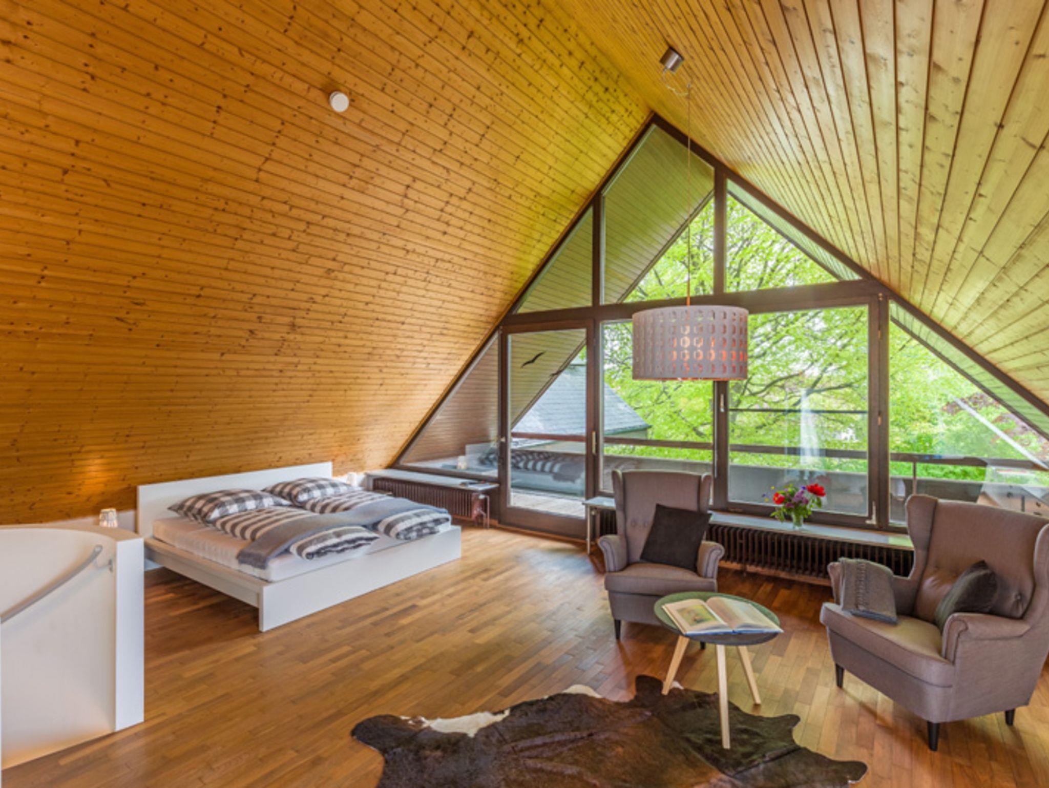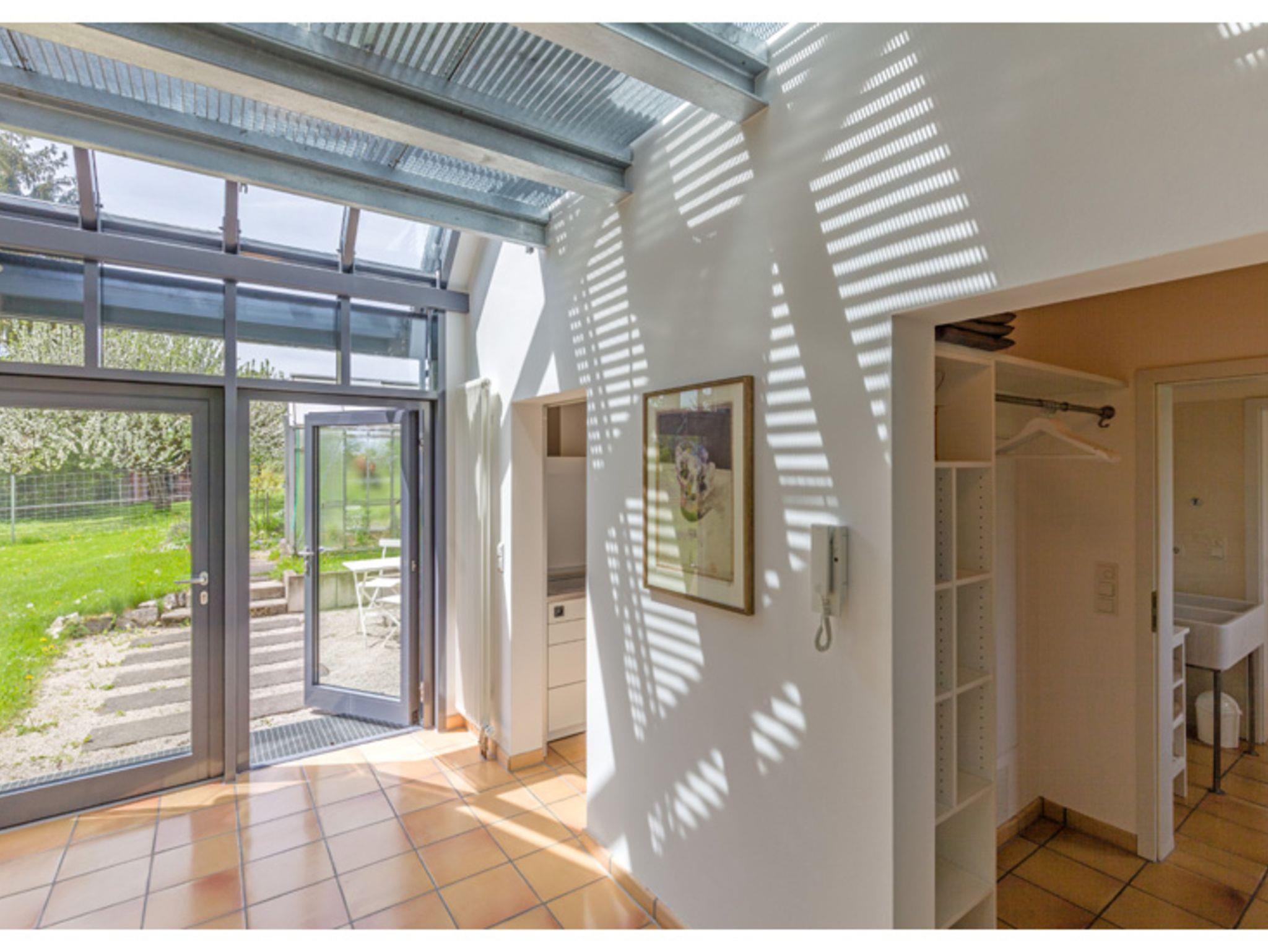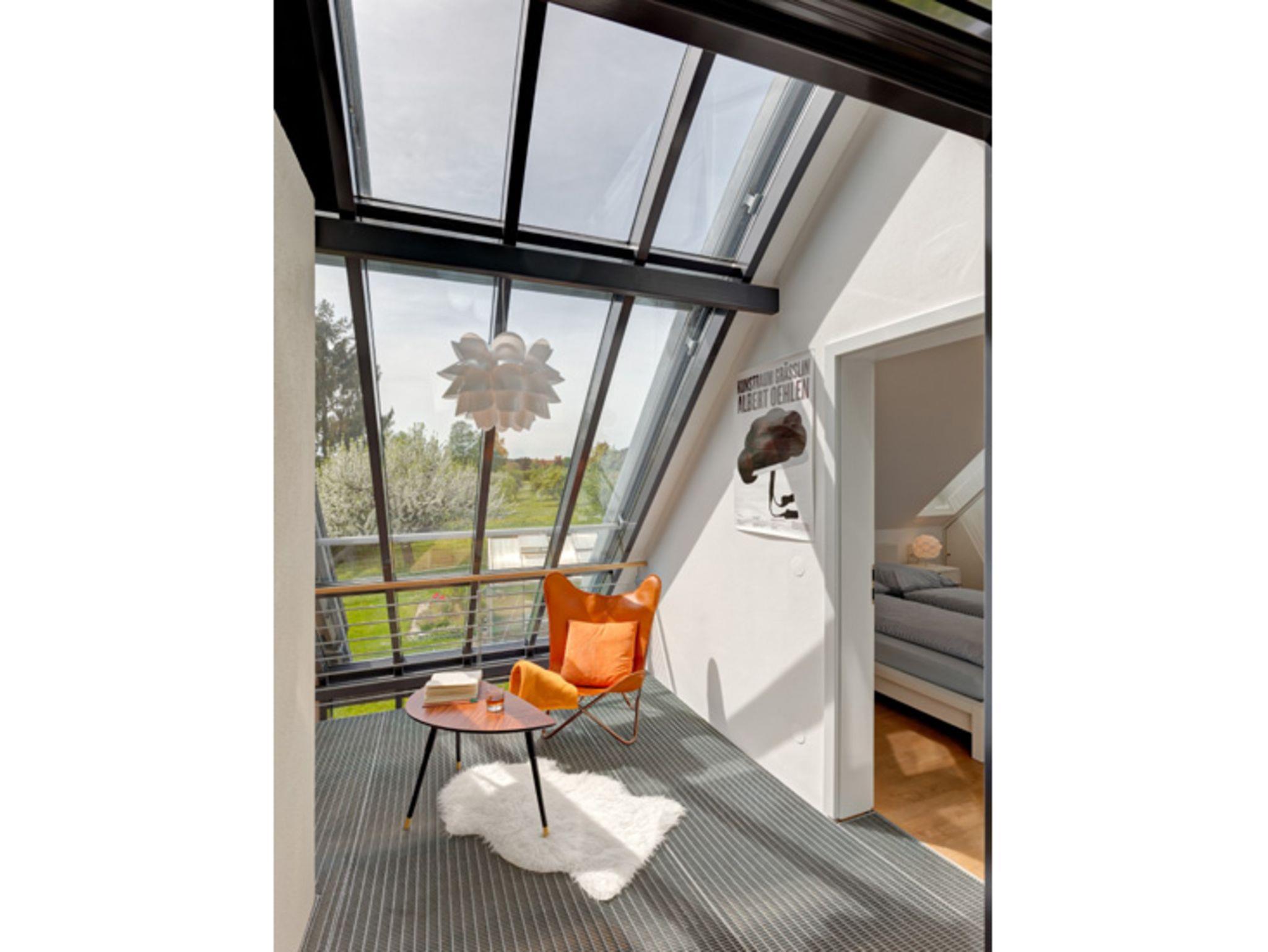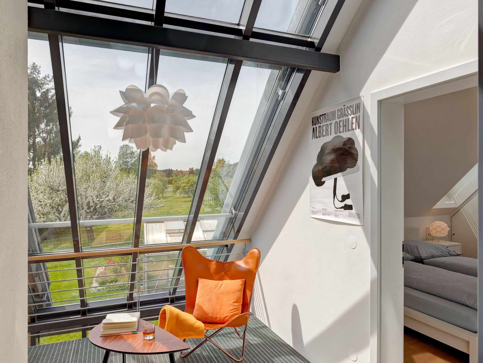 Das Feriendomizil liegt am Stadtrand von Schwenningen am Neckar in ruhiger Lage inmitten eines großen Garten, das Stadtzentrum ist ca. 1,5 km entfernt. Das Mietobjekt besitzt einen separaten Eingang, Carport für 1 Fahrzeug ist vorhanden, sowie ein nicht überdachter Stellplatz. Die Räumlichkeiten sind individuell, schlicht und hochwertig ausgestattet. Verarbeitet wurden für die Bodenbeläge Schiefer, Parkett sowie terra cotta- Fliesen, die meisten Räume sind mit Fußbodenheizung ausgestattet. Zur Verfügung stehen auf 2 Etagen mit 140 qm für 2 bis 5 Personen ein großzügiger Wohnbereich mit Aussicht in die Natur, Balkon und Terrasse, sowie ein Gartenbereich, insgesamt 3 Schlafräume (2 Doppelzimmer und1 Einzelzimmer), eine vollausgestattete Küche, 2 Bäder, separates Gäste- WC, Garderobe, Wasch- Stauraum. Eingangsbereich EG: Eingangsbereich EG mit Garderobe und Regalfächer sowie ein Ganzkörperspiegel, direkter Durchgang zur Außenterrasse. Badezimmer EG mit separatem WC: begehbare Dusche mit Glasduschwand, großer Waschtisch mit Spiegel und Ablagemöglichkeiten. Das separate Gäste-WC liegt nebenan, beide Räume verfügen über Außenfenster. Hauswirtschaftsraum/ Stauraum EG: Waschmaschine, Wäscheständer, Staubsauger, Reinigungsutensilien, kleiner Arbeitsbereich mit Telefonanschluss und Blick in die Natur, der Raum ist durch eine Schiebetür vom Küchenbereich getrennt. Küche: Bulthaup Einbauküche, ausgestattet mit Spülmaschine, Backofen, 4-Feld Cerankochbereichmit Abzugshaube, Kaffee-Maschine, Nespresso – Maschine, Toaster, Wasserkocher, Kühlschrank (biofresh) ohne Tiefkühlfach und LG- Multimediaanlage. Elektrische Jalousien können vor zu viel Sonneneinstrahlung schützen. Wohnbereich EG: Heller Wohnbereich mit Esstisch und 5 Stühlen, Blick in den Garten, Kachelofen (Erstausstattung Holz ist vorhanden), Sofa und 1 Ohrensessel, TV (mit Satelliten TV/ Radio). Zugang zur großen, teils überdachten Terrasse, elektrische Jalousien an den großen Fenstern. Gast 1/ Schlafzimmer EG (1Person): Durch eine Schiebetür vom Wohnbereich getrennt, Einzelbett (90X200cm), Ablage-möglichkeiten (Sideboard und Kleiderbügelstange) vorhanden, Business –Schreibtisch mit Internetzugang, Blick in den Außenbereich. Durchgangszimmer mit einer weiteren Schiebetür zum Turm mit Wendeltreppe ins OG. Gast 2/ Atelier OG (2Personen): Großzügiger Schlaf- Rückzugsraum mit Doppelbett (franz. Bett 180X200cm) und Balkon (ca.8qm überdacht), 2 Ohrensesseln mit Beistelltisch und Soundanlage, Ablagemöglichkeiten (Sideboard und Kleiderbügelstange) vorhanden. Wintergartenbereich OG: Ruhebereich mit Glasdach, elektrische Beschattungsanlage vorhanden, chilligem Sitzmöbel (1Person) und Beistelltisch, toller Blick in den Garten, durch Metallgitterboden vom EG getrennt. Gast 3/ Schlafzimmer OG (2Personen): Lichtdurchflutetes Schlafzimmer (durch Dachfenster und Oberlichter, elektrische Abdunkelung möglich) mit Doppelbett (separate Matratzen, je 90X200cm), großem Kleiderschrank und direktemZugang zu einem weiteren Bad. Bad OG: Das Bad verfügt über 1 großen Waschtisch mit Spiegel und Ablagefläche, Föhn, Wellnessdusche und WC, Außenfenster und Oberlichter. Weitere Informationen: Der Bereich OG ist durch eine Außentreppe mit separater Eingangstür erreichbar und durch die Wendeltreppe im Turm mit dem EG verbunden. Es steht Ihnen ein Safe zur Verfügung. Außenbereich/ Garten und Terrasse: Zum Ferienhaus gehört ein schön gestalteter Außenbereich im Garten, welcher teilweiseüberdacht ist, mit Gartenbank, großem Sonnenschirm, 2 Tischen mit insgesamt 5 Stühlen und 2 Sonnenliegen (in den Sommermonaten), schöner Blick in die Natur. Vom DTV wurde das Haus mit 5 Sternen ausgezeichnet.