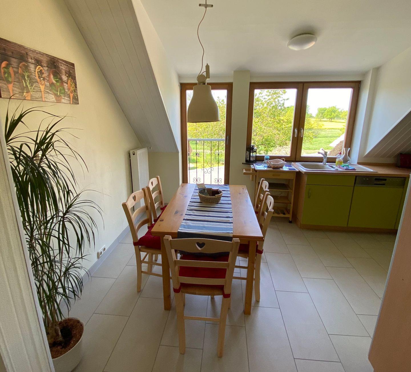 In dem kleinen, wunderschönen Örtchen Vilmnitz, direkt an der "Deutschen Alleenstraße" zwischen dem Ostseebad Binz und der zauberhaften Residenzstadt Putbus gelegen, befinden sich im reetgedeckten Ferienhaus insgesamt drei Ferienwohnungen. Die Ferienwohnung "Vilm" befindet sich im Erdgeschoß des Reetdachhauses. Die Ferienwohnungen "Goor" und "Muglitz" sind über eine separate Außentreppe im 1. OG zu erreichen. Die Wohnung "Vilm" mit einer Wohnfläche von ca. 105qm bietet Platz für maximal 5 Personen. Die Wohnung "Goor" mit einer Wohnfläche von ca. 92 qm bietet Platz für insgesamt 5 Personen. Die Wohnung "Muglitz" mit einer Wohnfläche von ca. 50 qm bietet Platz für insgesamt 3 Personen. Alle drei Wohnungen zusammen sind ideal für einen Urlaub mit Freunden oder in Großfamilie. Im liebevoll angelegten Bauerngarten stehen ausreichend Sitz-und Grillmöglichkeiten zur gemeinschaftlichen Nutzung zur Verfügung.Das insgesamt ca. 3000 qm große eingezäunte Grundstück verfügt über einen gepflasterten Vorplatz, über den man den großen Carport mit 3 Stellplätzen und Fahrradunterstellmöglichkeiten erreicht. Ihr Elektroauto können Sie während Ihres Aufenthaltes an der privaten E-Ladesäule im Carport laden. Im Haus gibt es ein WLAN und eine gemeinschaftliche Waschmaschine.