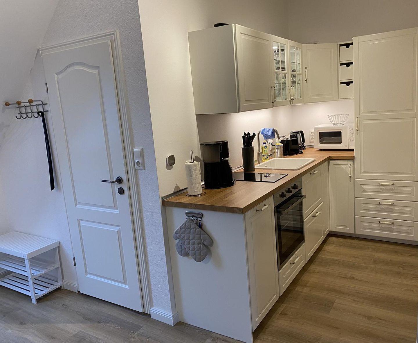 Die offene Küche bietet neben einem Herd, Mikrowelle und Kühlschrank natürlich auch Kaffeemaschine, Toaster und Wasserkocher.