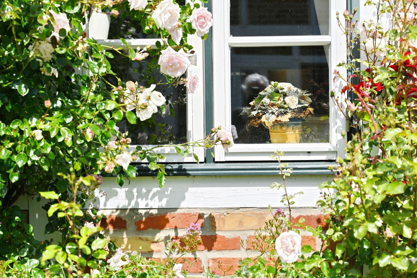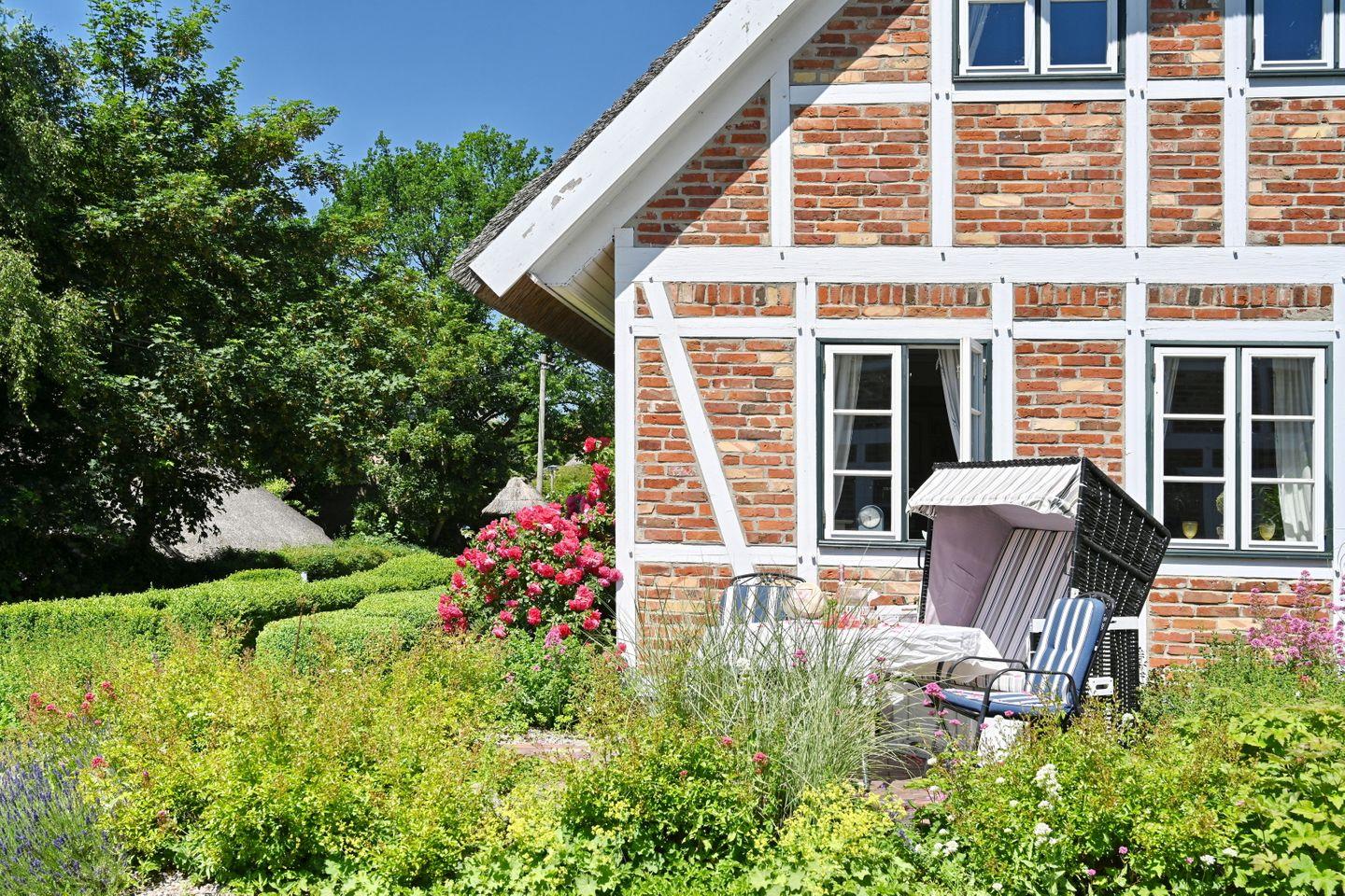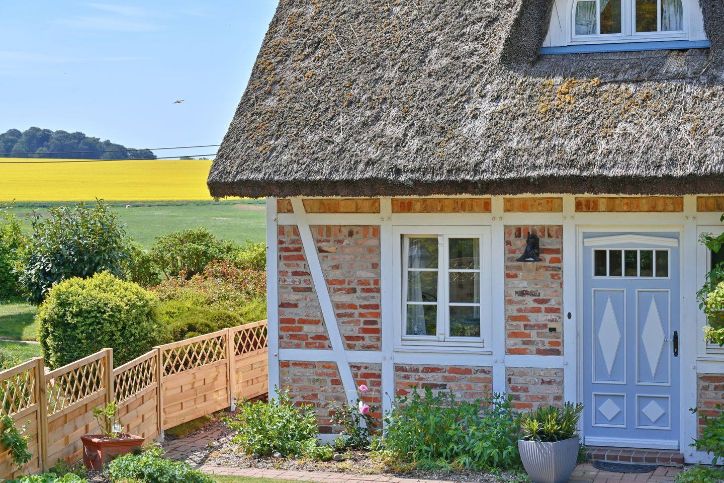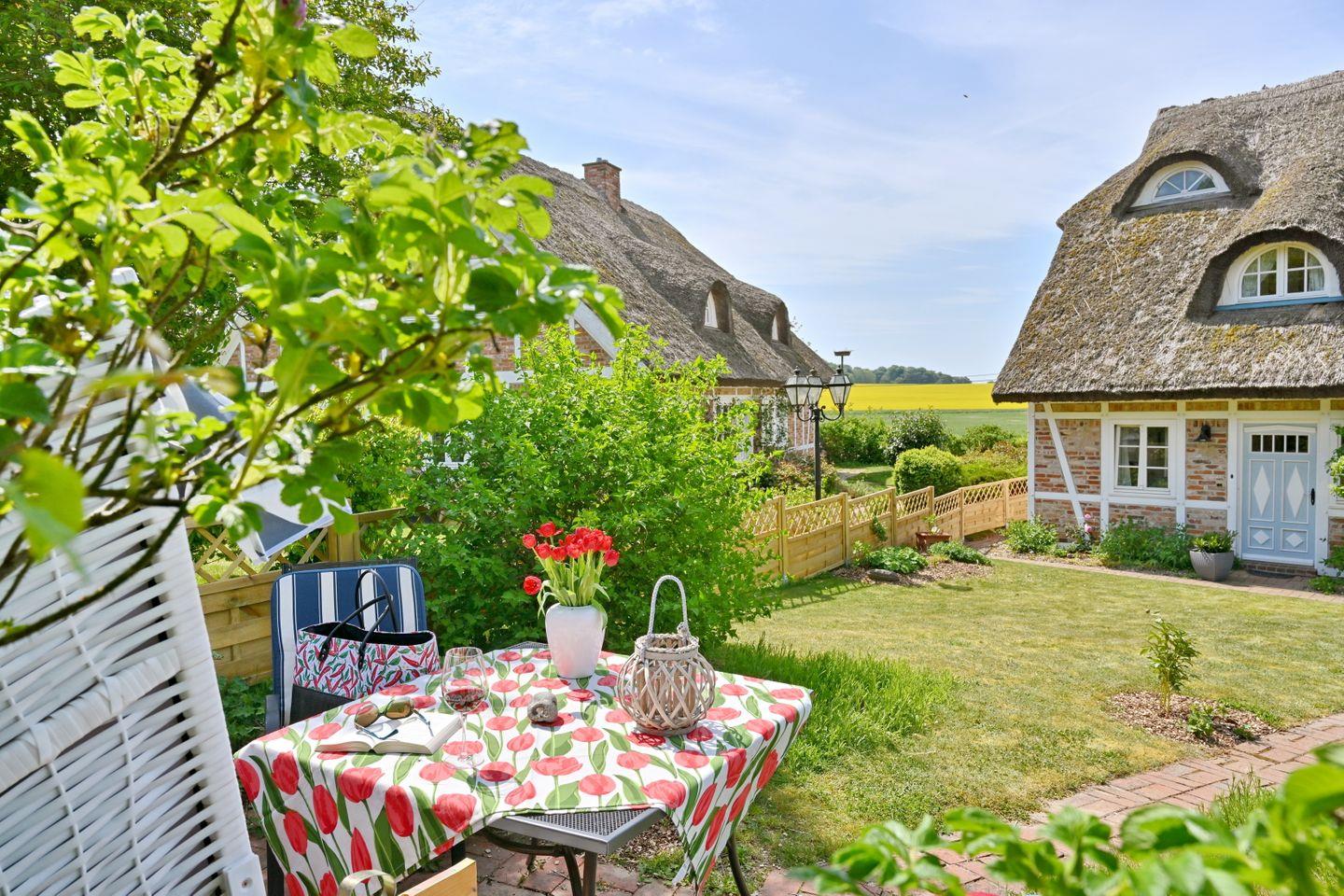 Romantische Landhauswohnung mit Reetdach und Gartenblick in Vilmnitz, ideal für erholsame Tage zu zweit.