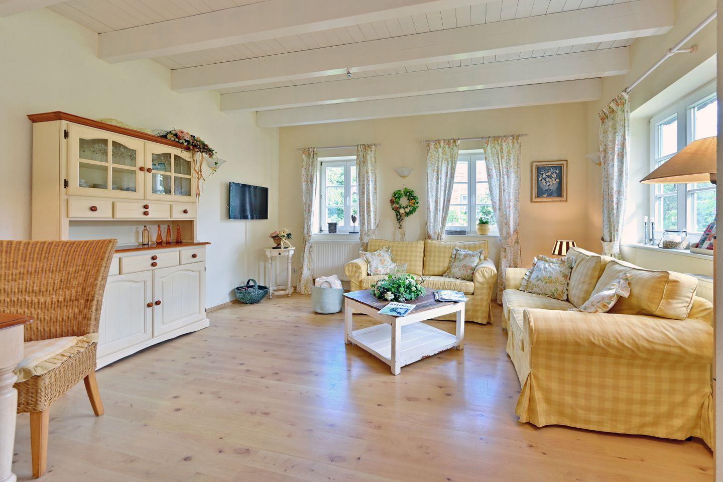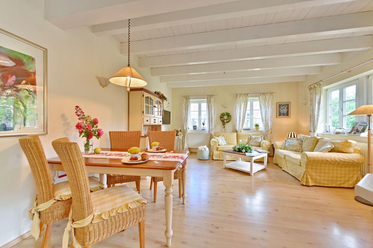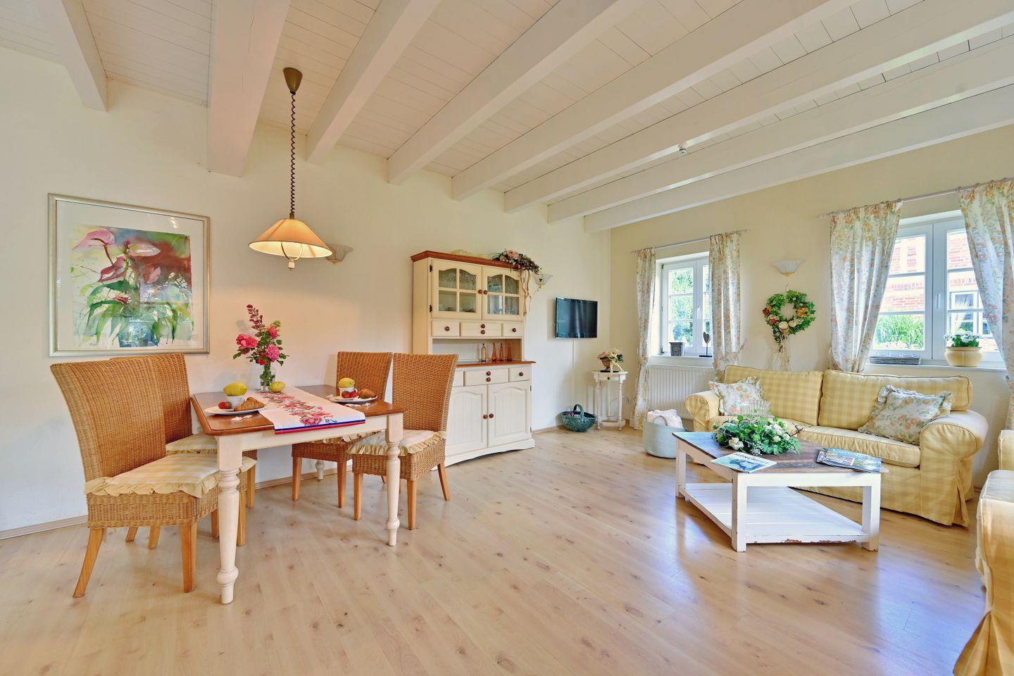 Die Ferienwohnung ist farblich aufeinander abgestimmt und mit viel Liebe zum Detail im Landhausstil eingerichtet.